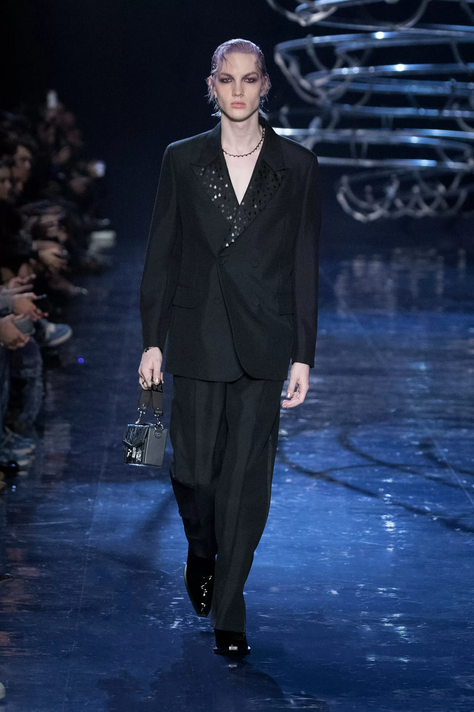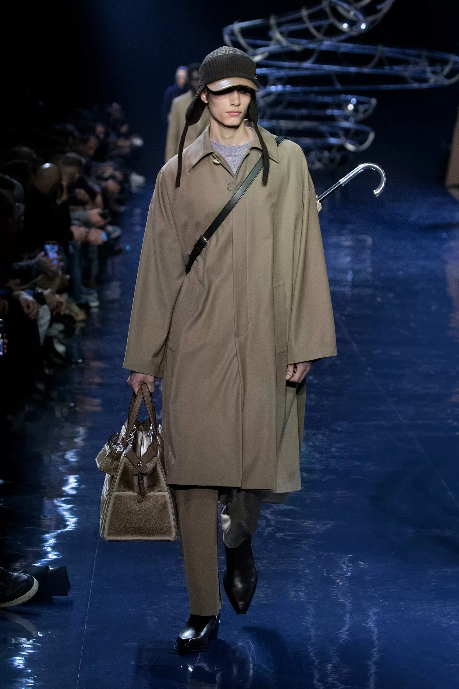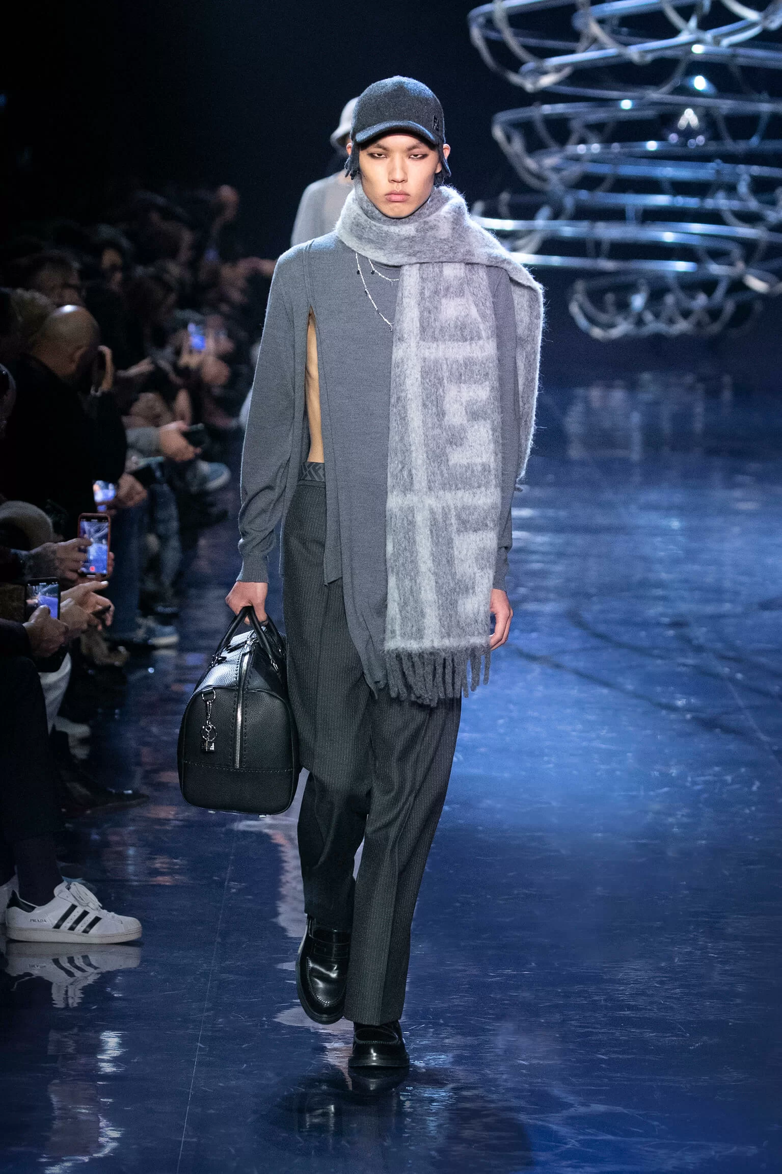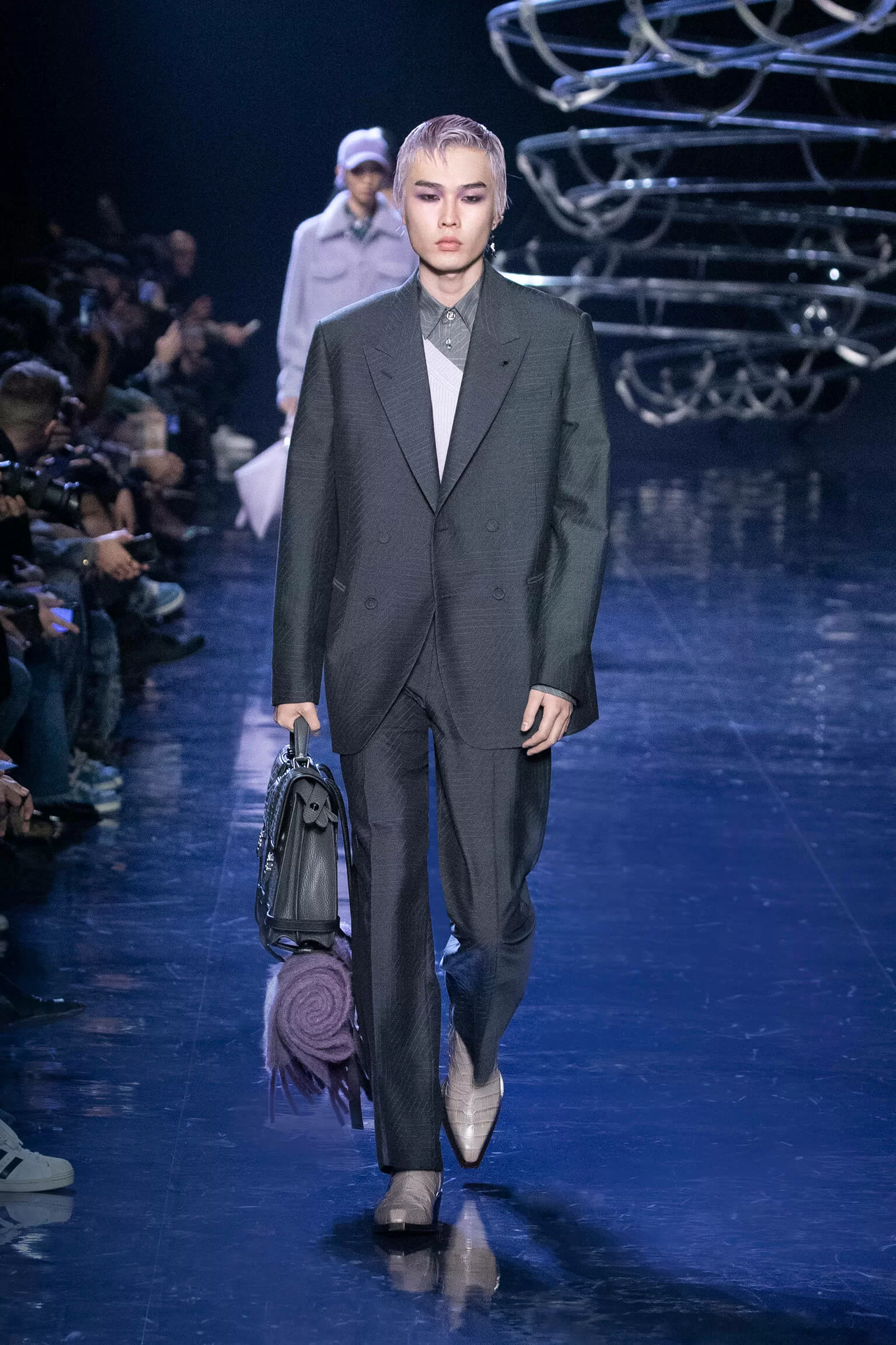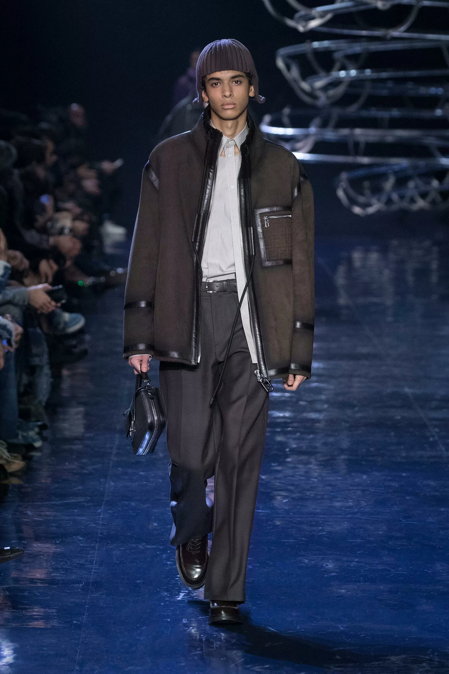 西裝大玩對稱設計及層次感,展現幾何動感,彰顯層次分明的工藝。雙層茄士咩、人造皮革及織花絲綢頌揚 FENDI 向來重視的素材質感,鍍上銀色、靛藍色及紫色等 DISCO 反光燈球所投射出的光線。包覆身體曲線的溫暖外套與慵懶性感的針織衫和剪裁破格的恤衫碰撞出火花,挑戰實用功能和巧妙設計的界限。毛衣背心採用不規則斜肩,垂墜半截裙幅劃破長褲剪裁,服飾上散落金屬色顫動貼飾,蠟面及拋光皮革或過染牛仔布紛紛增添仿舊潤飾。
