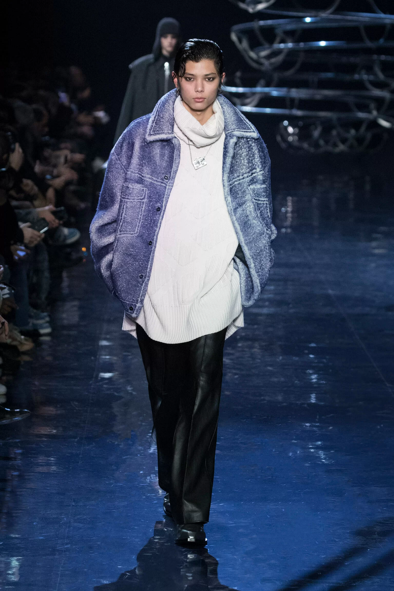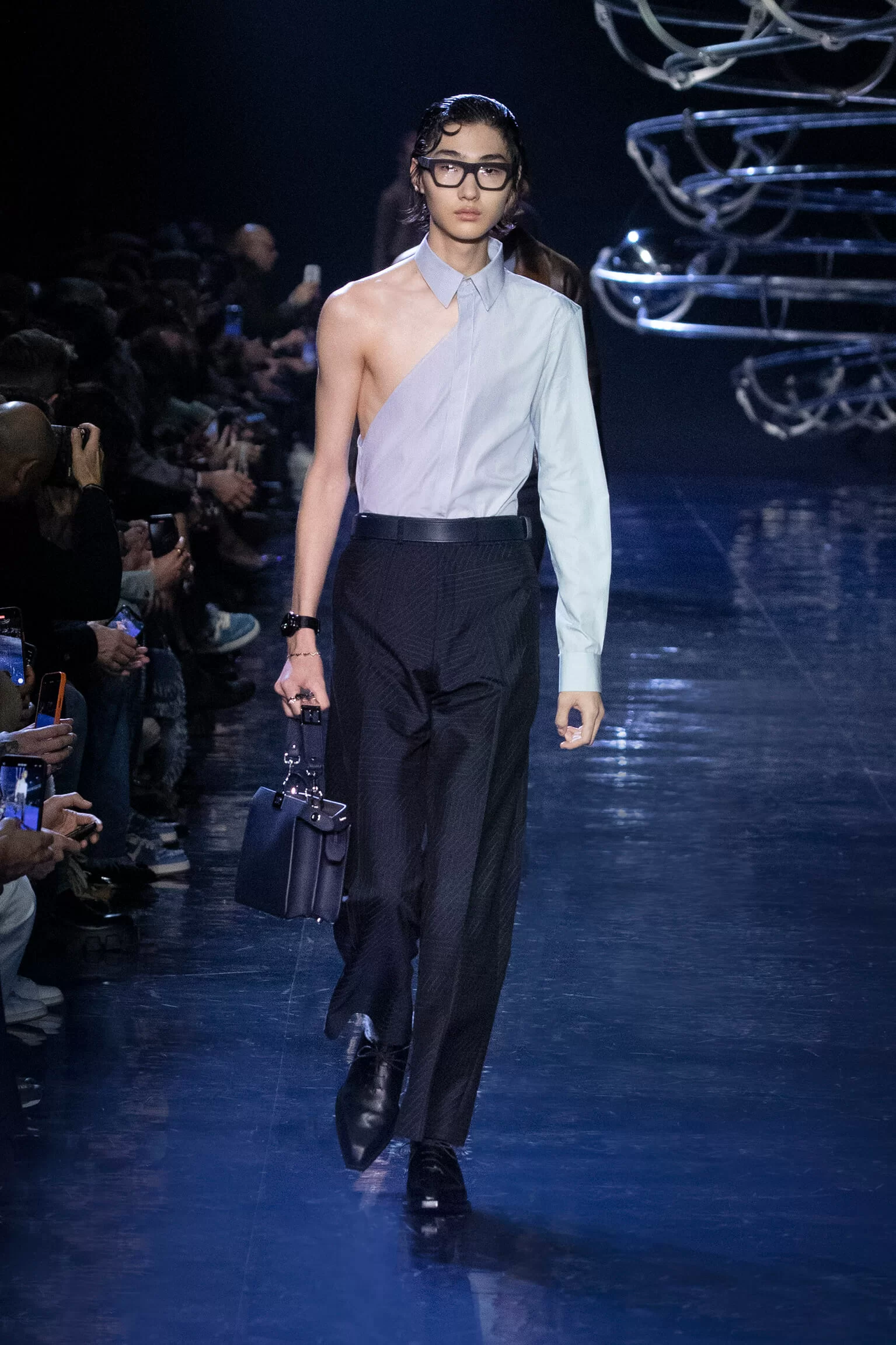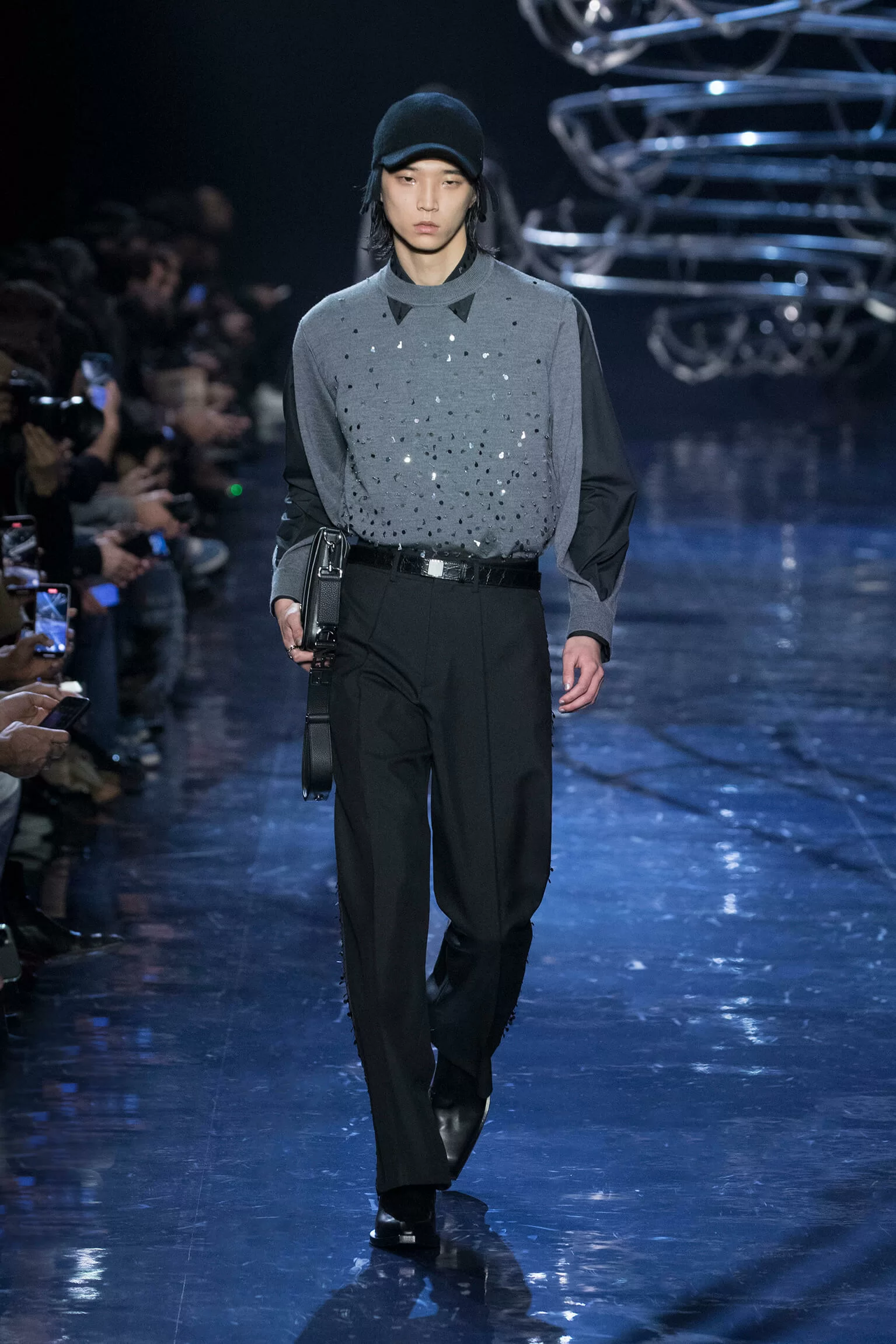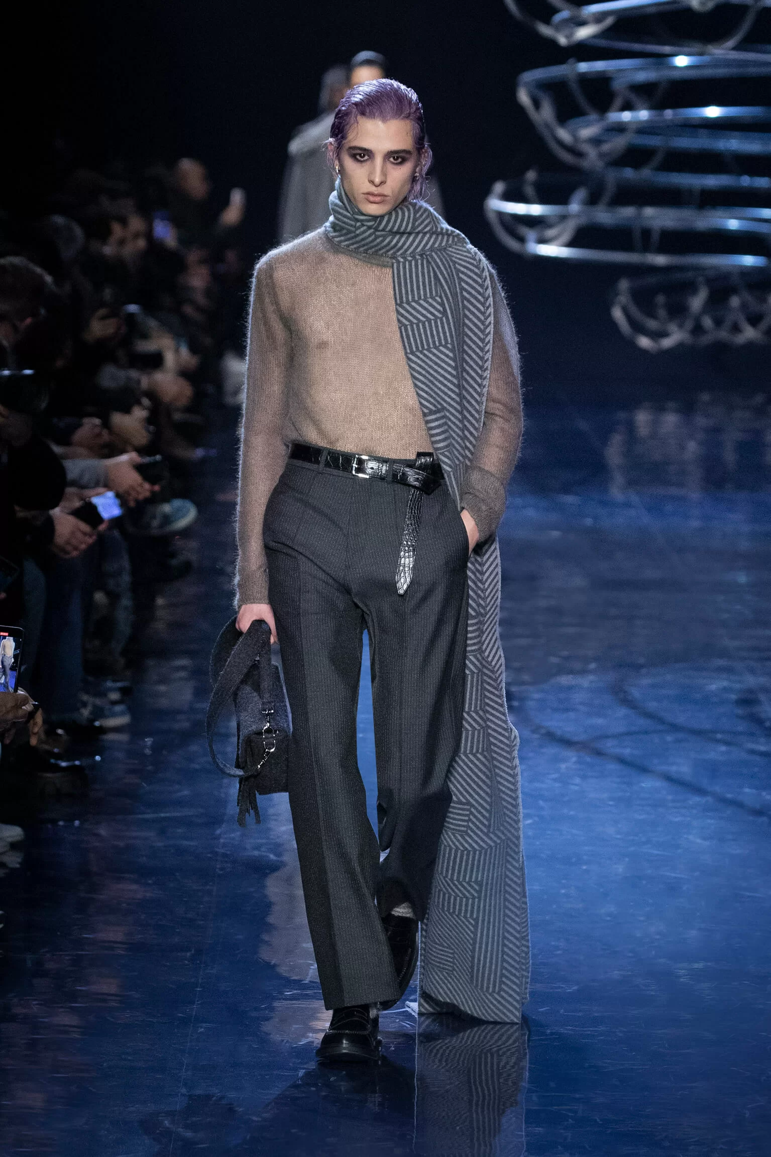 西裝大玩對稱設計及層次感,展現幾何動感,彰顯層次分明的工藝。雙層茄士咩、人造皮革及織花絲綢頌揚 FENDI 向來重視的素材質感,鍍上銀色、靛藍色及紫色等 DISCO 反光燈球所投射出的光線。包覆身體曲線的溫暖外套與慵懶性感的針織衫和剪裁破格的恤衫碰撞出火花,挑戰實用功能和巧妙設計的界限。毛衣背心採用不規則斜肩,垂墜半截裙幅劃破長褲剪裁,服飾上散落金屬色顫動貼飾,蠟面及拋光皮革或過染牛仔布紛紛增添仿舊潤飾。