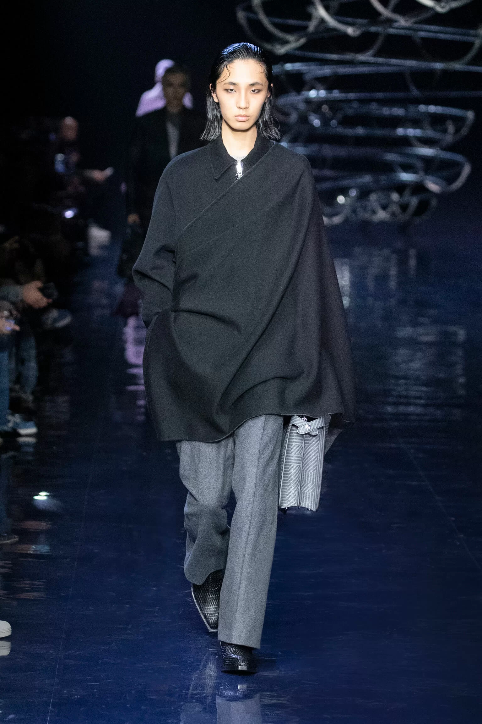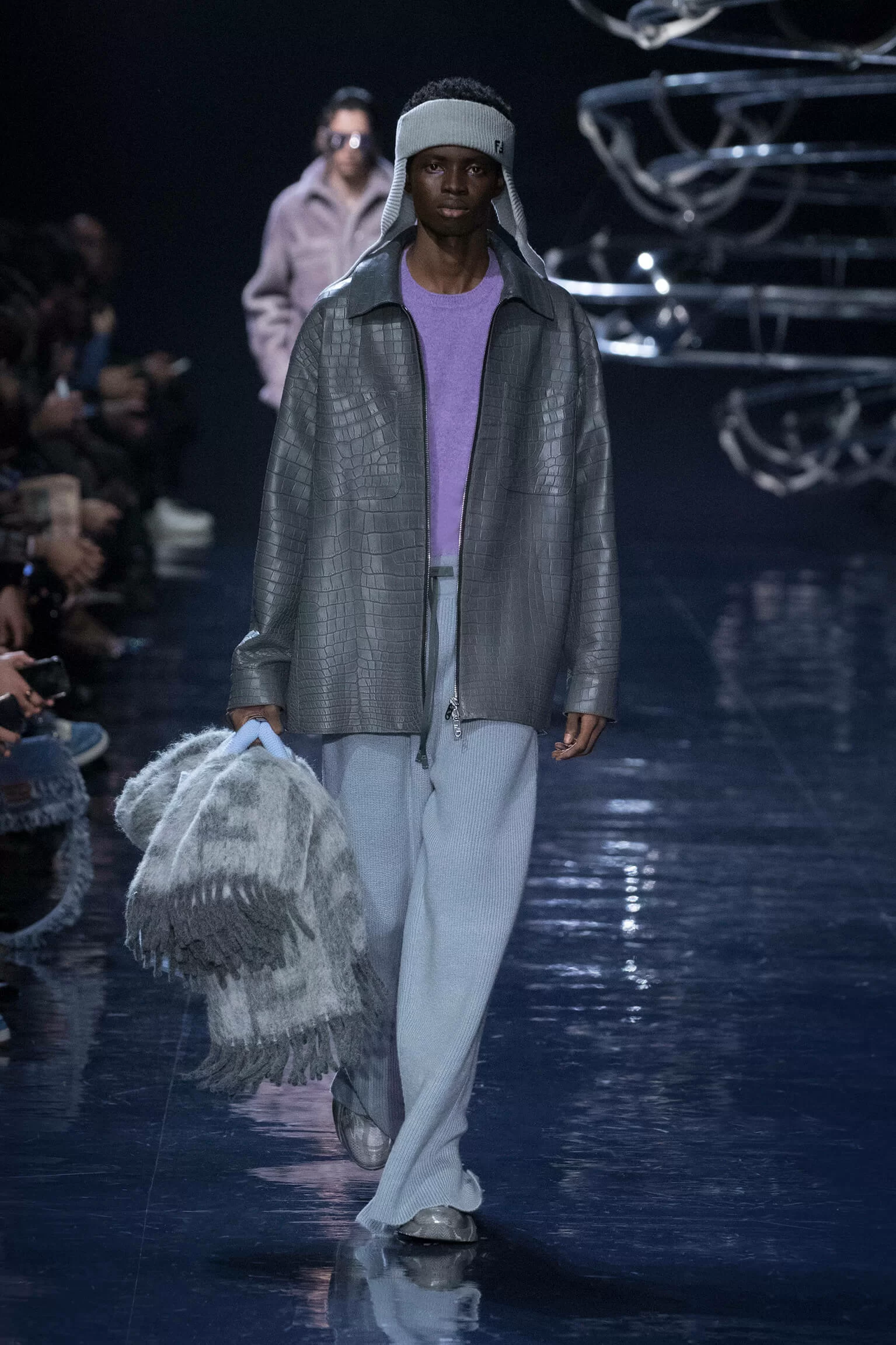 幾何抽象,FENDI ASTUCCIO圖案經重塑成FENDI SHADOW,點綴馬海羊毛圍巾、毛毯、流蘇襯裡及幼條紋西裝。