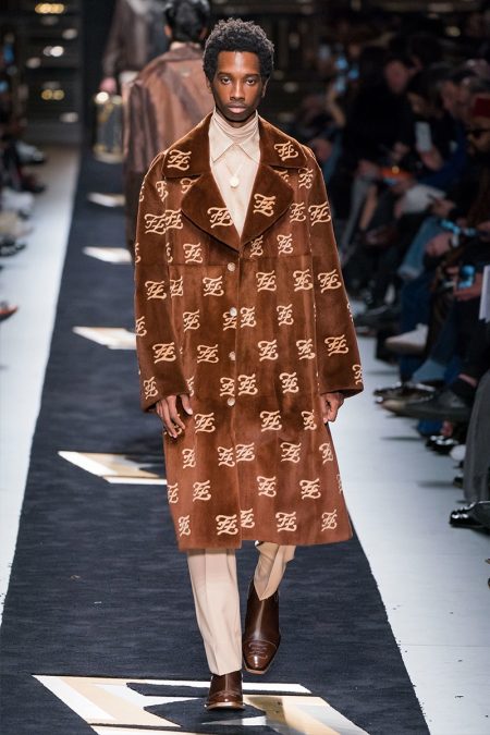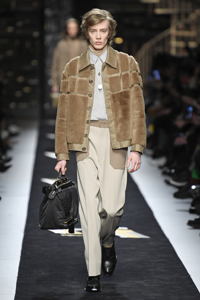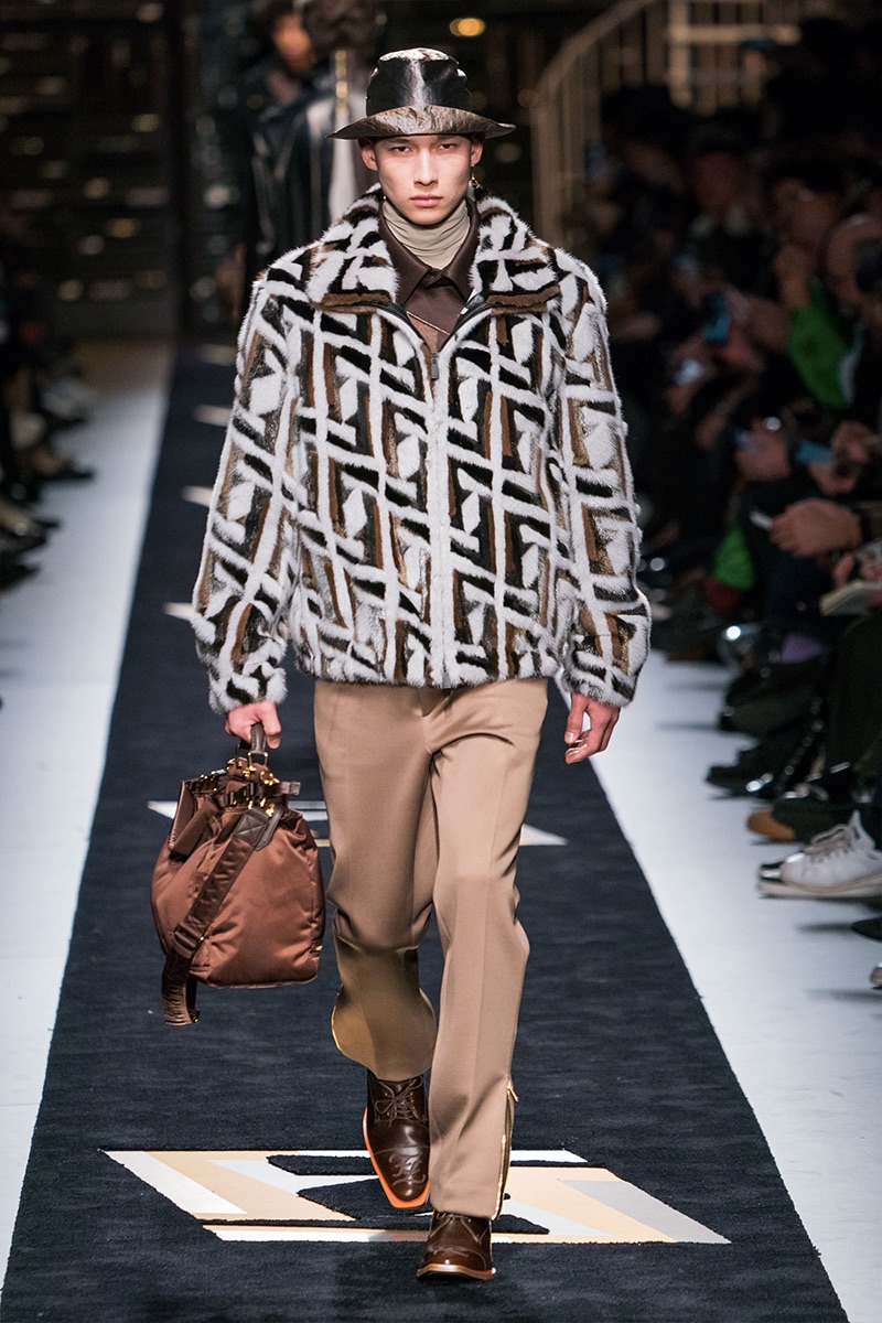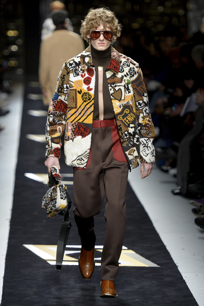 難怪今秀走的款式離不開古典的紳士格調之影子,而成為眾人矚目的焦點當然要數那些經改良的定制時裝,細膩混合街頭風格的反叛元素重新回到天橋上。打破西裝領帶總是沉悶的感覺,讓系列服不至於老土沉悶。其實帶商標的毛皮夾克,我們早在去年已經看過。當時模特兒穿醜鞋、燈芯絨褲子與棕色奶油色嵌花羊毛皮上場,拼貼版畫系列,就連雙FF的特色商標也印在透明雨衣上。今秀焦點藏那裡?