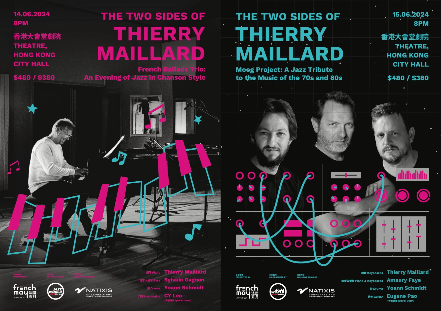 另一場演出則由THIERRY MAILLARD、YOANN SCHMIDT及AMAURY FAYE三人,演繹最新專輯《莫格計劃》,向七八十年代音樂致敬,當中充滿豐富而密集的電子音樂及合成器元素,集流行樂與搖滾於一,令人禁不住舞動。最特別之處,這場表演請來了結他手包以正,他是香港爵士樂的代表人物,自八十年代於美國學成歸來後,就活躍於香港樂壇,三十年間與各大國際爵士音樂節、世界級爵士樂音樂家合作,享負盛名。
