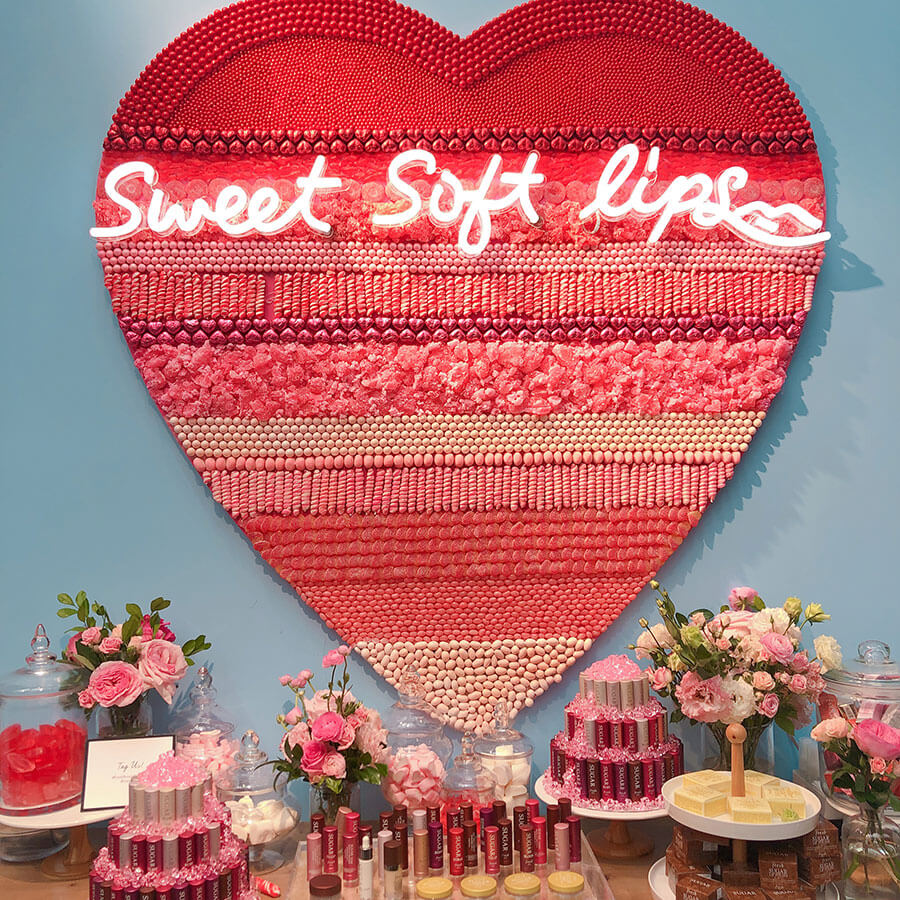 而旁邊的甜點桌上,放上黃糖系列的潤色護唇膏塔。黃糖是品牌最標誌的美容成分,以及「香得想吃一口」的面膜塔, 以甜蜜祝福以及美麗派對甜點揭開旅程。