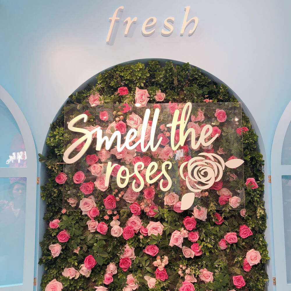 踏進 Fresh Beauty Kitchen,率先映入眼簾的是牆上鮮艷奪目的心型掛飾,由數十瓶天然食材組合而成,這亦是Fresh 面膜選單上的主要成份,例如玫瑰、橙片、意大利白泥、紅茶、黃糖等等。