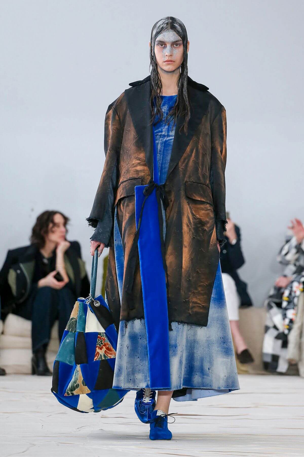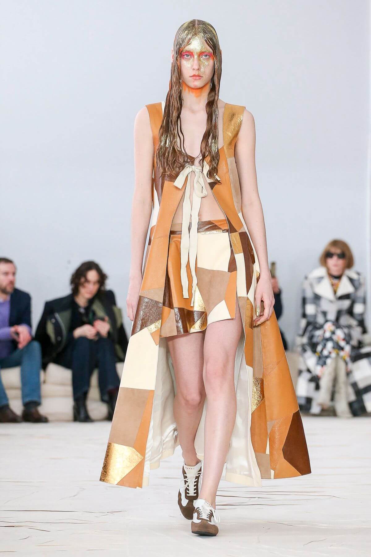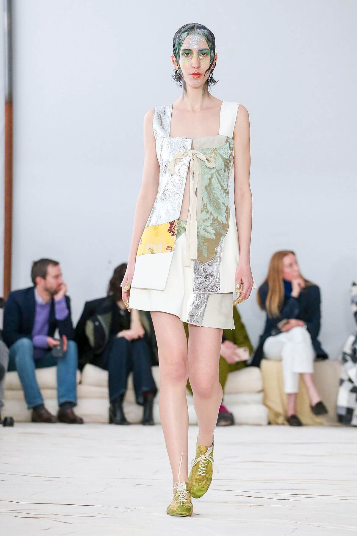 說回系列本身,設計師FRANCESCO RISSO在後台說:「這是我們的《愛麗絲夢遊仙境》版本。」系列今次是「從頭到尾,從宏觀到微觀,都是關於將殘餘物放在一起。」無論是迷你或超長裙、是長靴、褲子或長袍,全部都由皮碎和印花布拼湊而成。還有一些似乎是現成服裝的碎片,例如看似是由幾件不同的針織品製成的開胸連衣裙,每種元素都與手工藝品車間的兒童粗製針線有關。