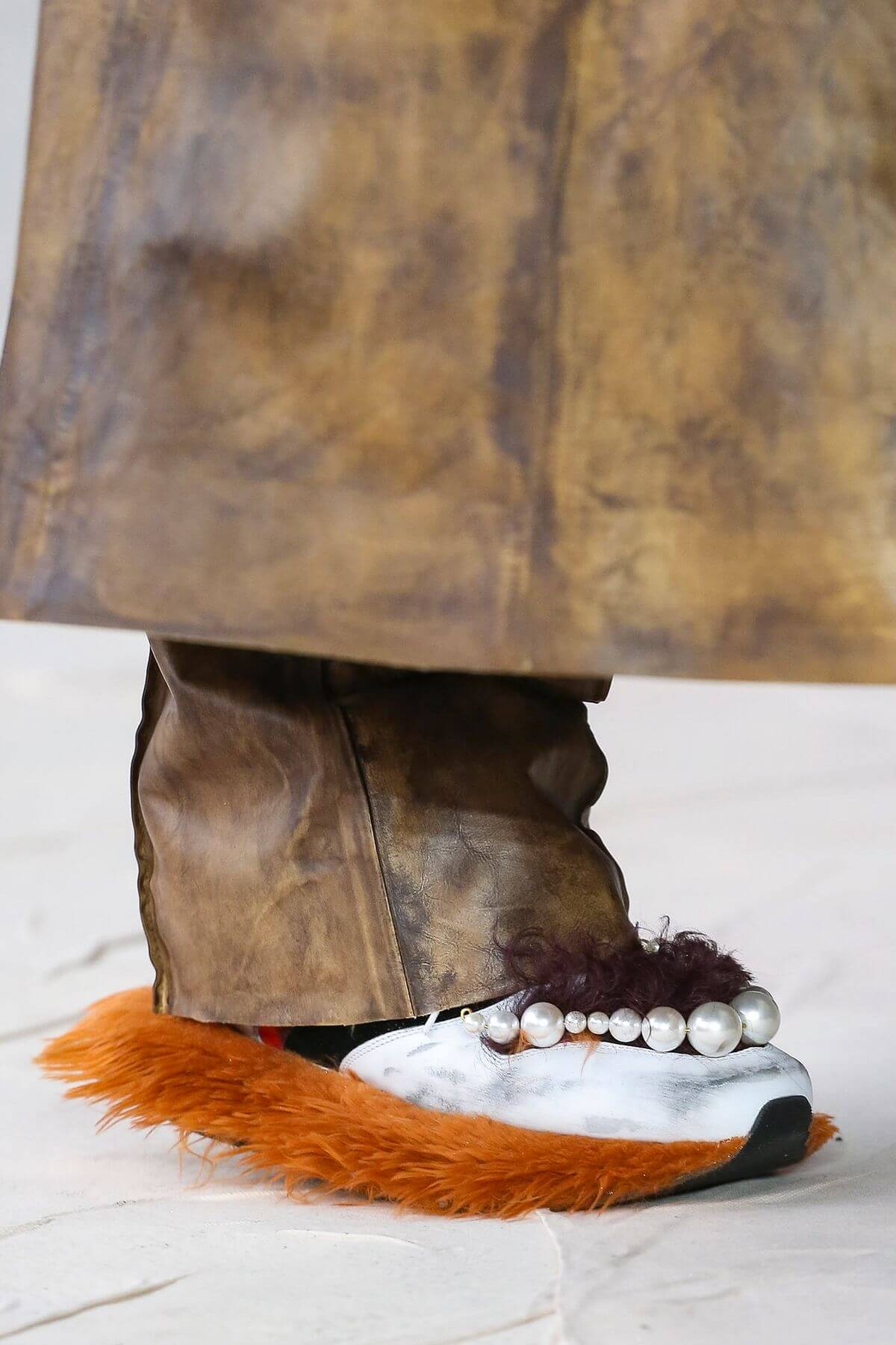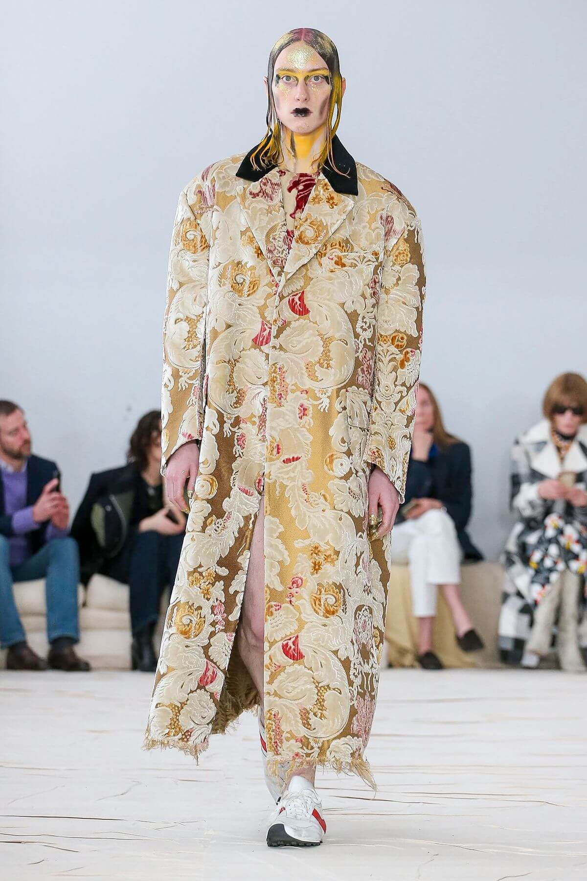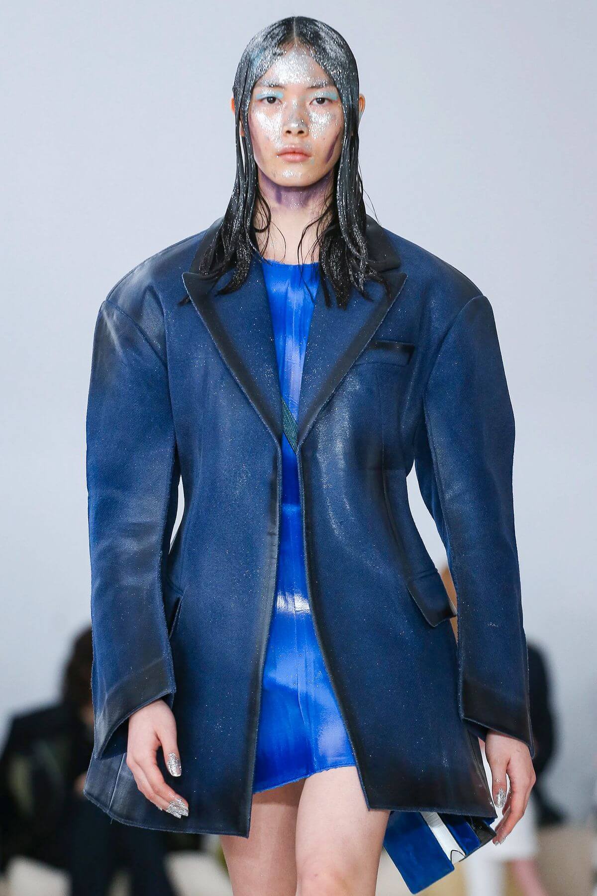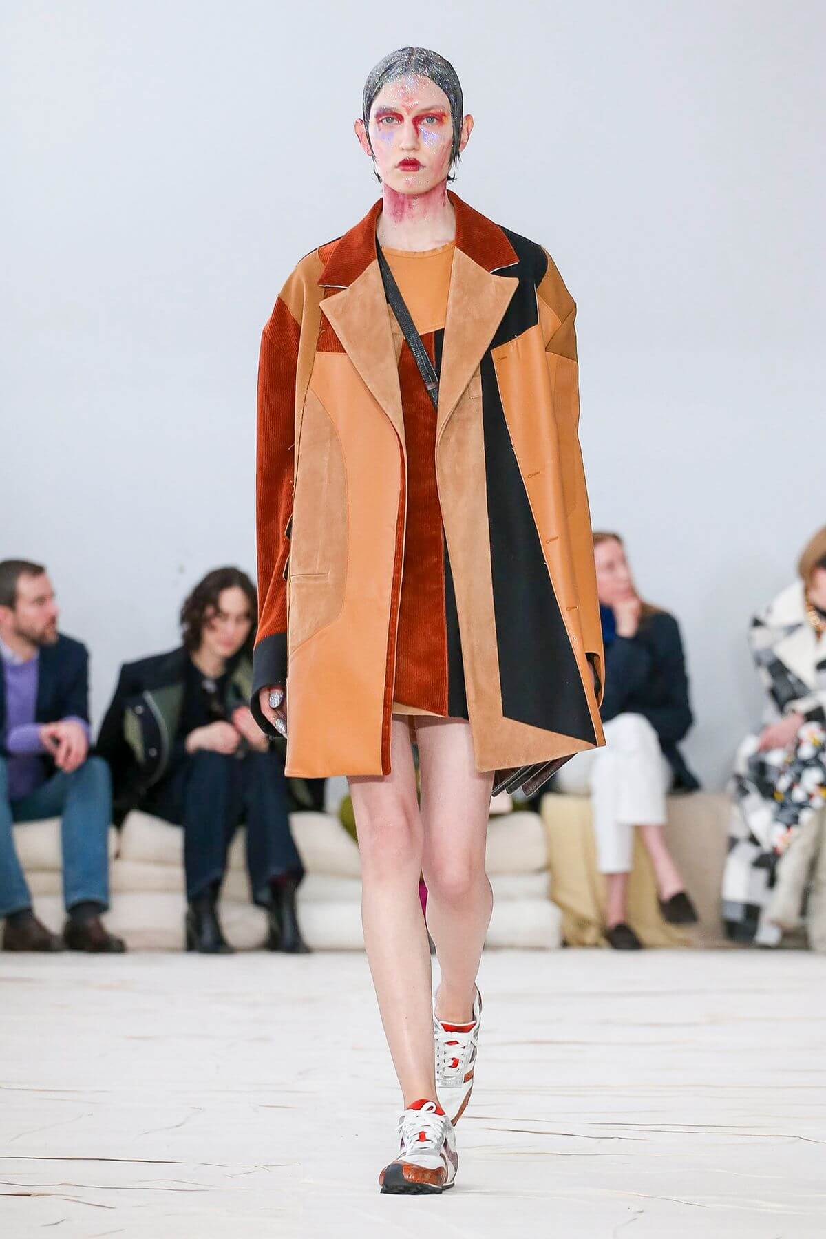 說回系列本身,設計師FRANCESCO RISSO在後台說:「這是我們的《愛麗絲夢遊仙境》版本。」系列今次是「從頭到尾,從宏觀到微觀,都是關於將殘餘物放在一起。」無論是迷你或超長裙、是長靴、褲子或長袍,全部都由皮碎和印花布拼湊而成。還有一些似乎是現成服裝的碎片,例如看似是由幾件不同的針織品製成的開胸連衣裙,每種元素都與手工藝品車間的兒童粗製針線有關。