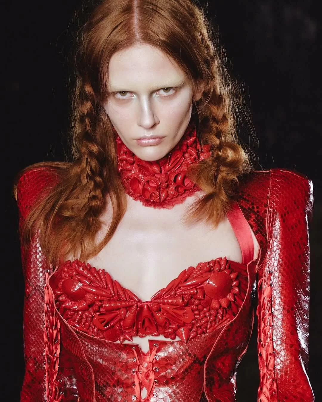 DILARA FINDIKOGLU 把 2025秋冬系列命名為「VENUS FROM CHAOS」(混沌中的維納斯女神),系列以希臘神話中愛與美的海洋女神維納斯為靈感,並以不尋常的物料製作的服飾,像是以不同編織物製成的緊身胸衣、以毛髮製成的服裝、閃閃發光的深紅色天鵝絨、華麗的巴洛克風格裙裝、以及一件飾有數百個安全別針、珍珠和海螺殼的華麗高領緊身胸衣盔甲等等,每一個服飾造型的製作,都有著高級訂製等級的工藝感,讓每一個造型都宛如從大海中誕生的維納斯女神。