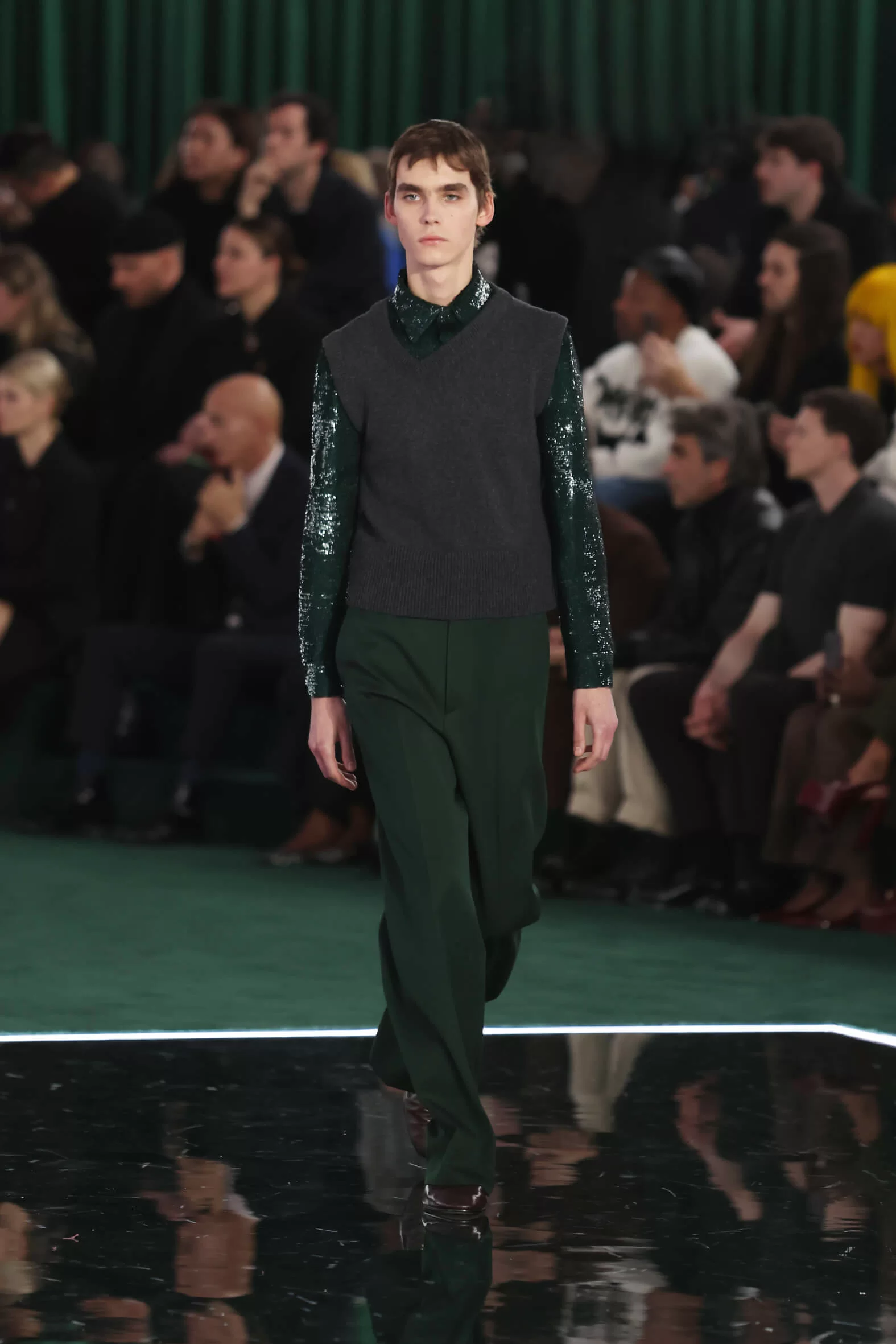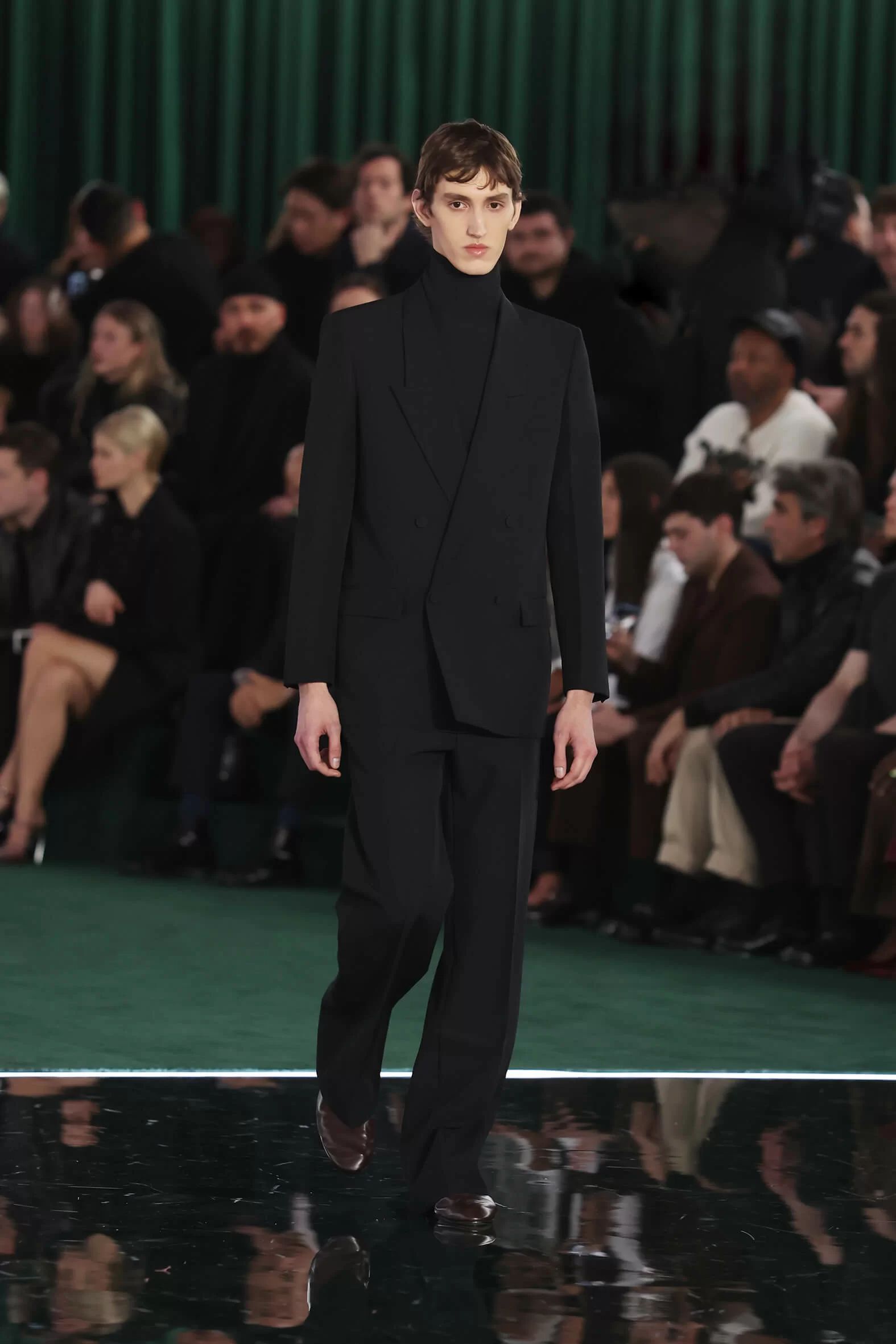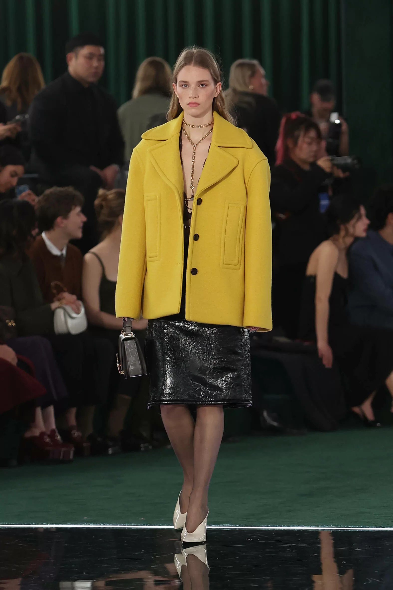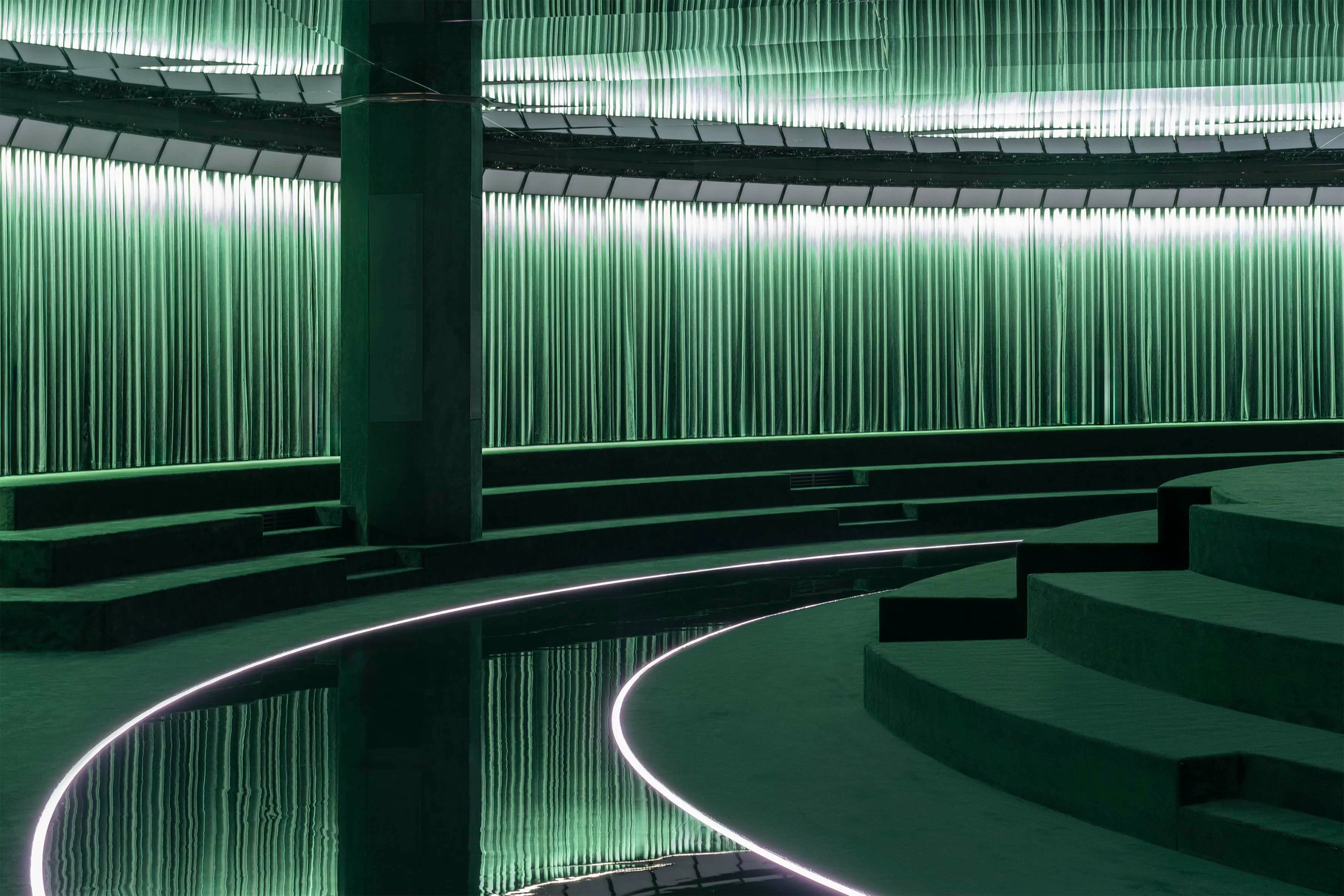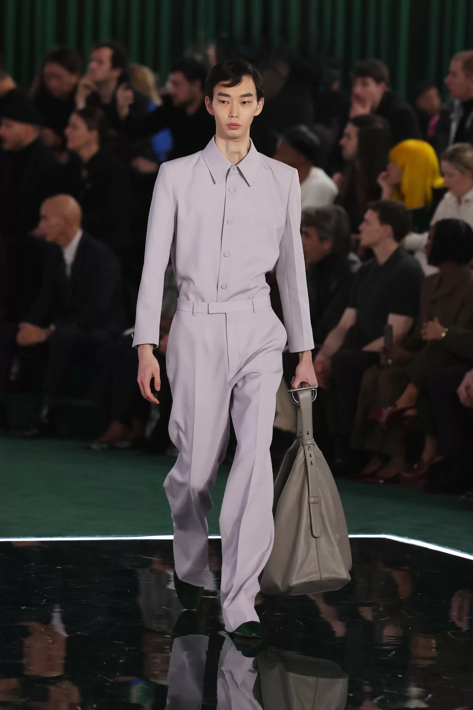 時裝展以「CONTINUUM」為主題,有逐漸、過渡的意思,正好適合處於過度期的 GUCCI,延續過去、現在及未來的設計理念,通過「SPREZZATURA」完美不完美的演繹,展現品牌所頌揚的美學和態度。踏入展場,經典的綠色作為主調,並以今年誕生 50 周年的 INTERLOCKING G 作舞台設計元素,營造出高級而莊嚴的氣勢,這兩個元素也是向品牌創始人 GUCCIO GUCCI 的致敬 —— 回本溯源,尋找新的路向。