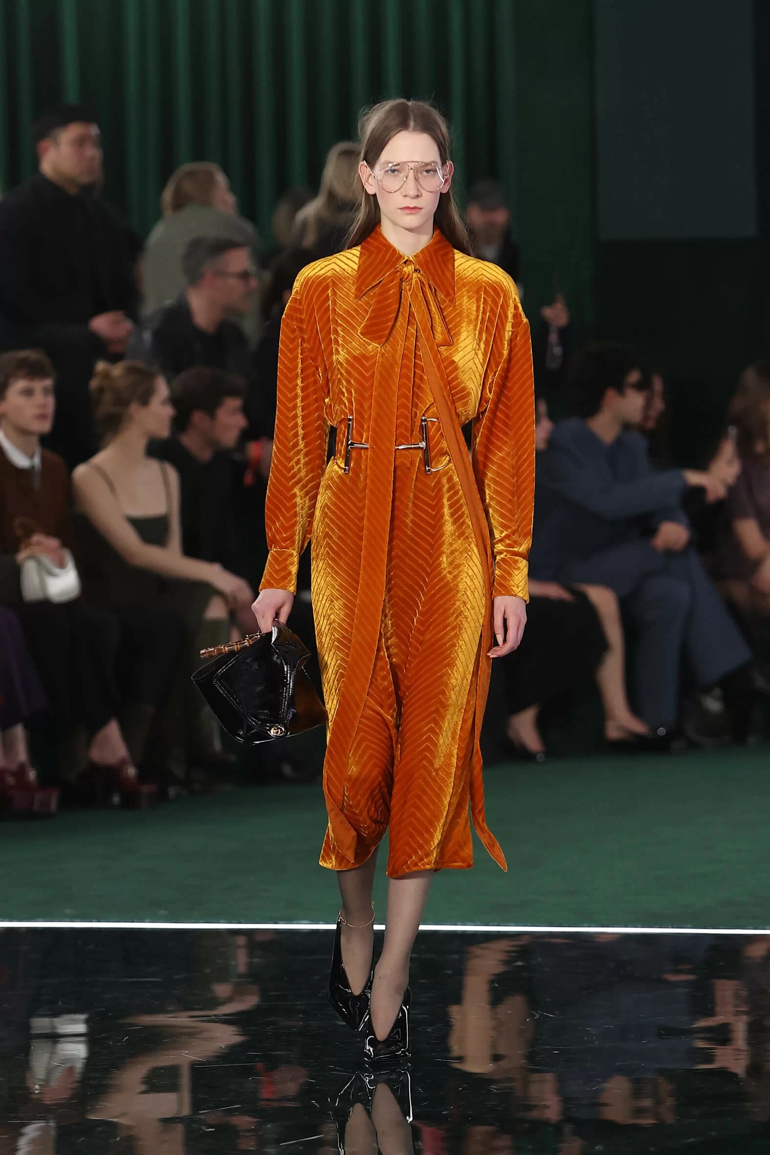 設計團隊以不同時期的 GUCCI 為靈感,從豐富的典藏中尋找新的創作語言,傳統與現代之間遊走,穩中求變。從 60 年代幹練而奢華的修身西裝、仿皮草大衣,到 TOM FORD 時期的性感女郎風格如貼身連身衣、透視蕾絲洋裝,再到 ALESSANDRO MICHELE 的極繁主義如流蘇閃片裙、極高飽和度配色,最後還展現了 SABATO 的極簡輪廓(甚至可能是 SABATO 在 GUCCI 的最後設計),這些都在時裝展上得以一一呈現。