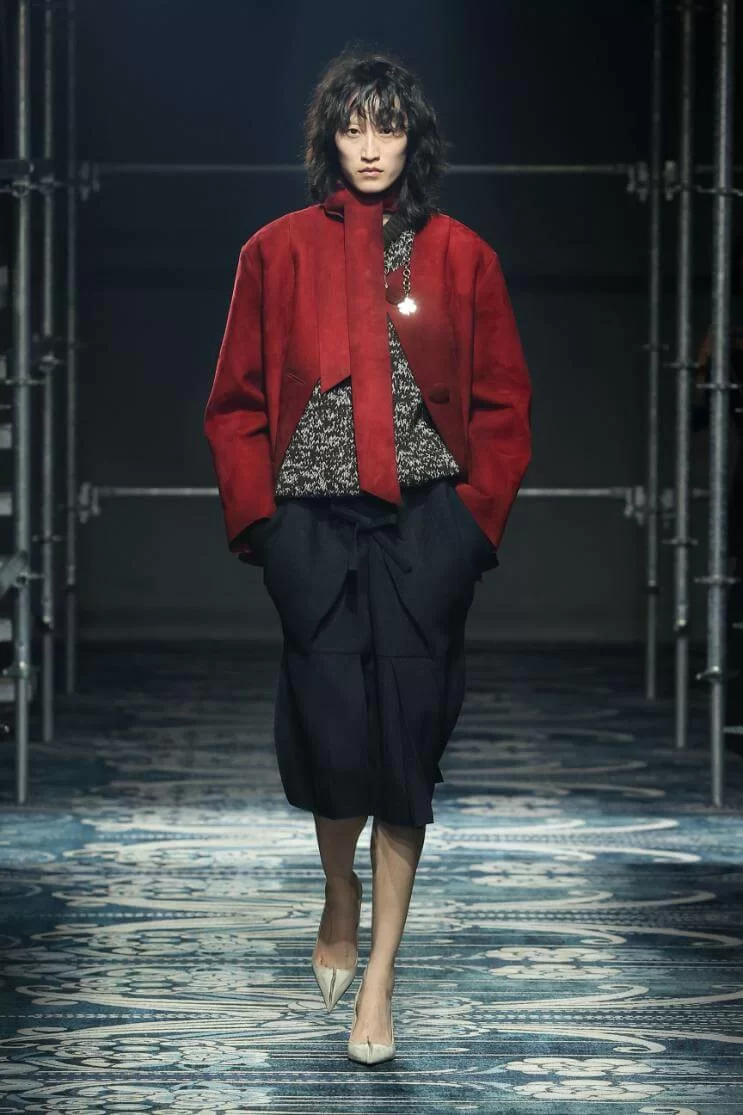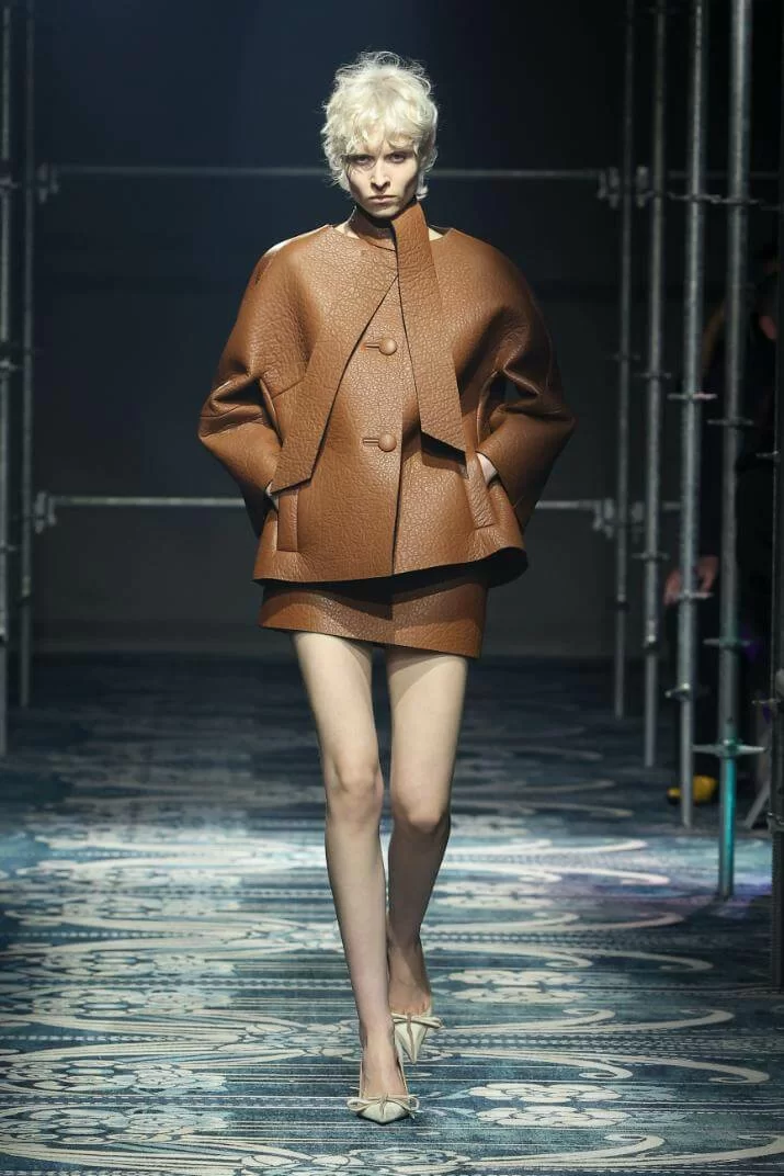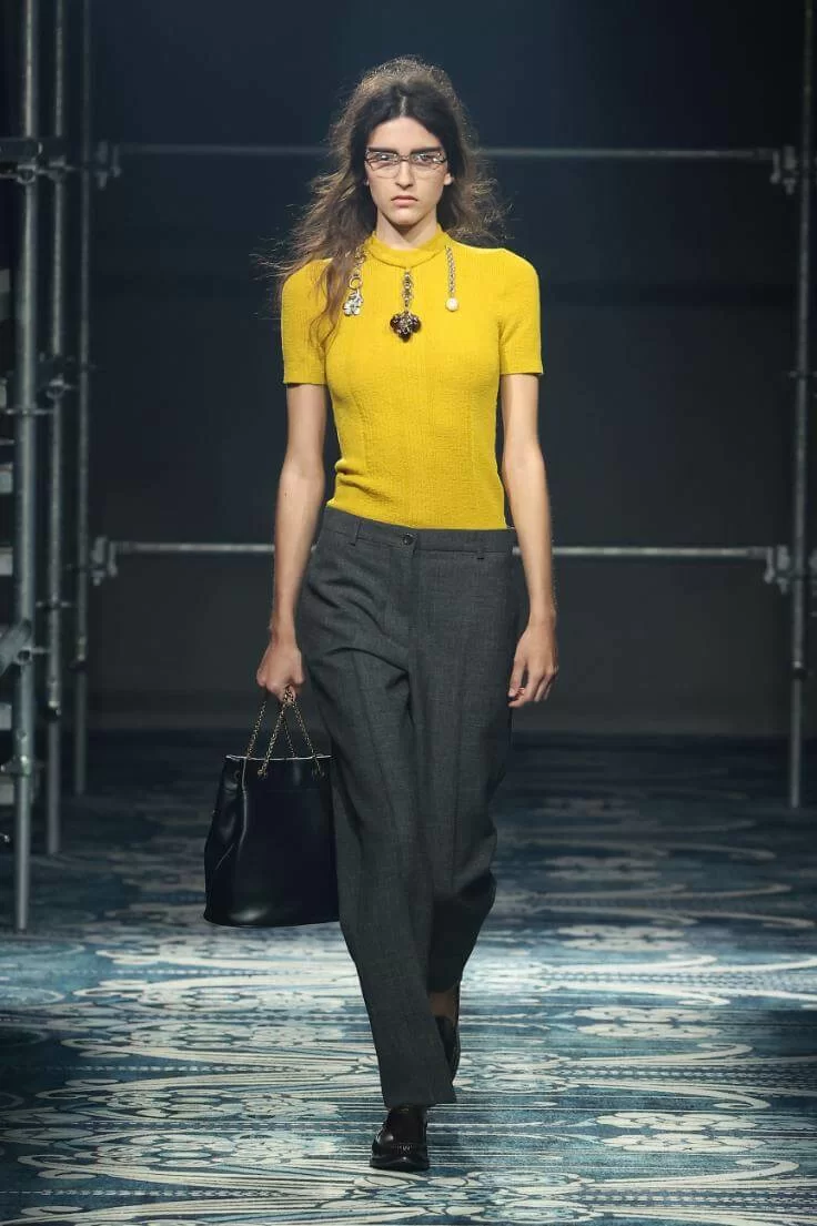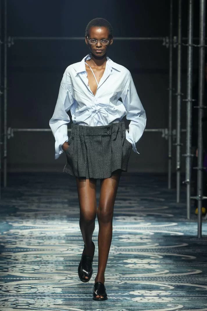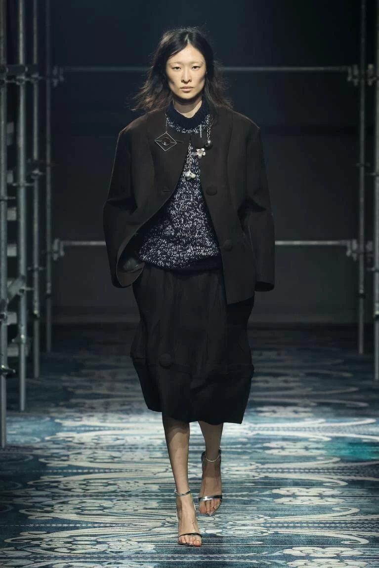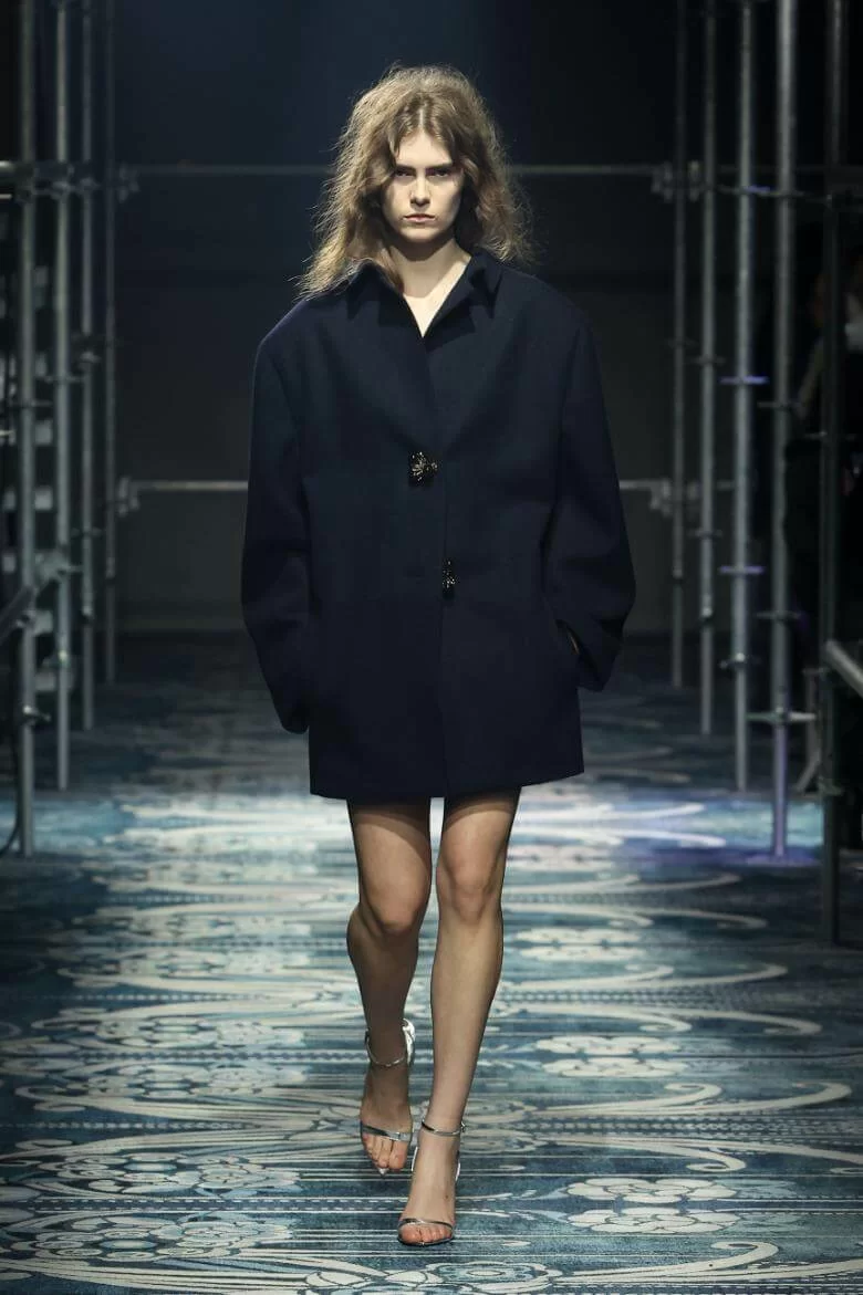 MIUCCIA PRADA 和 RAF SIMONS 大膽改變了衣物的比例,OVERSIZED 的西裝外套與短裙、不合身甚至不對稱的衣領,營造出「五五身」的恤衫和半截裙。此外,衣襬的不修飾邊緣讓人摸不著頭腦,卻又無法將目光移開。雖然是「RAW GLAMOUR」,但設計師特意加入蝴蝶結、珠寶裝飾等,在 UGLY 中增添華麗視覺,混亂中營造出強烈的反差,反映女性特質的多樣性。
