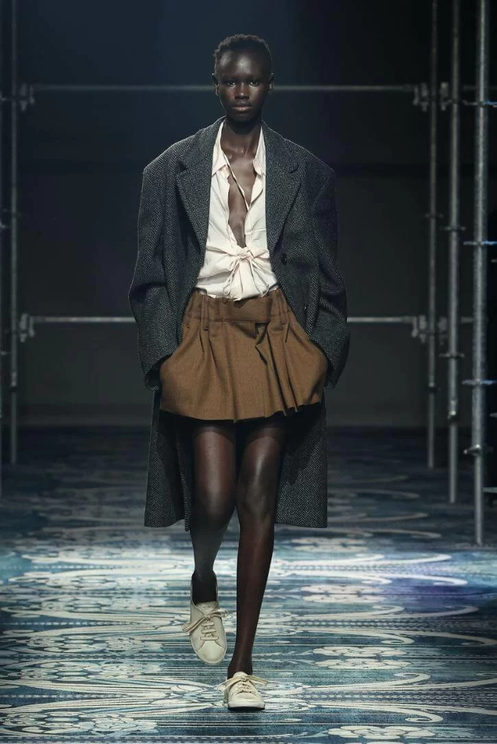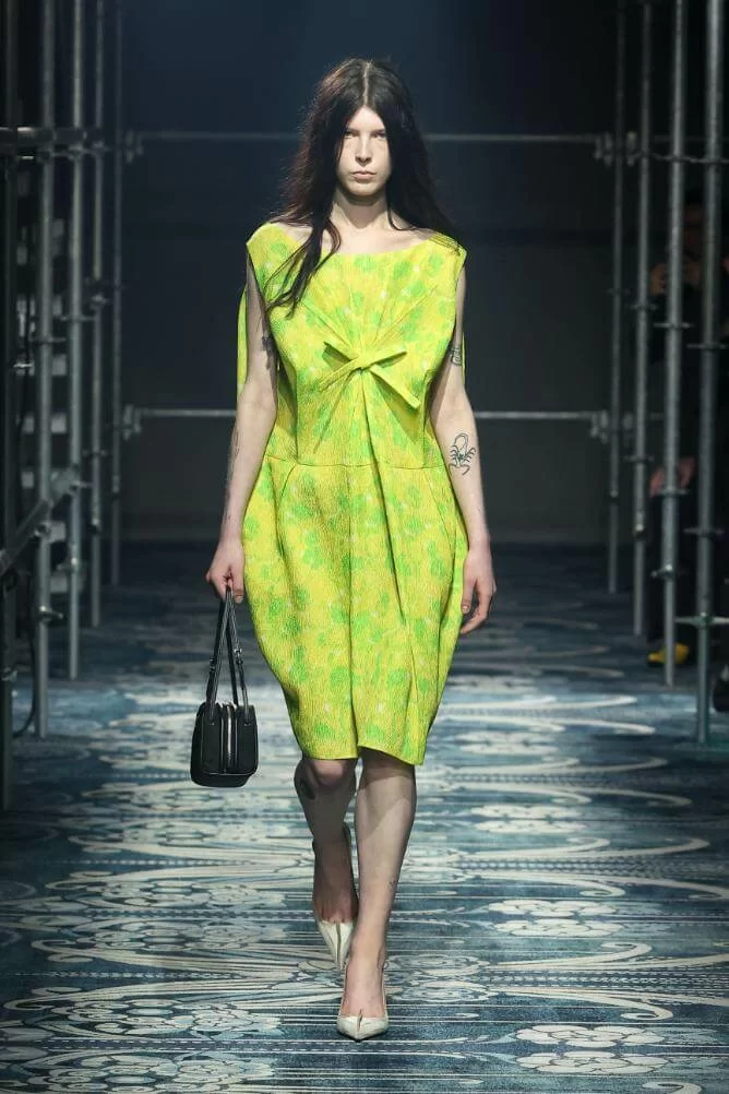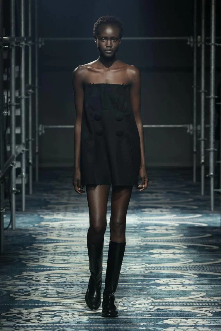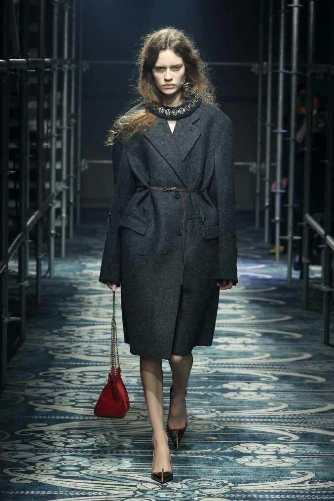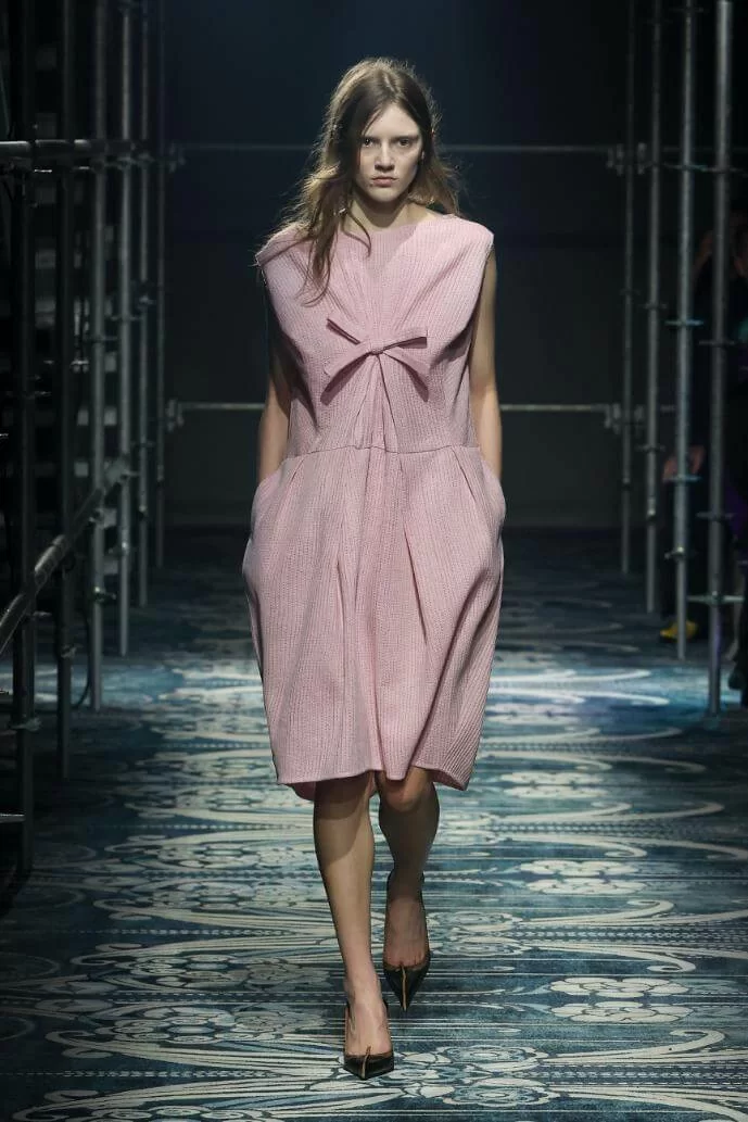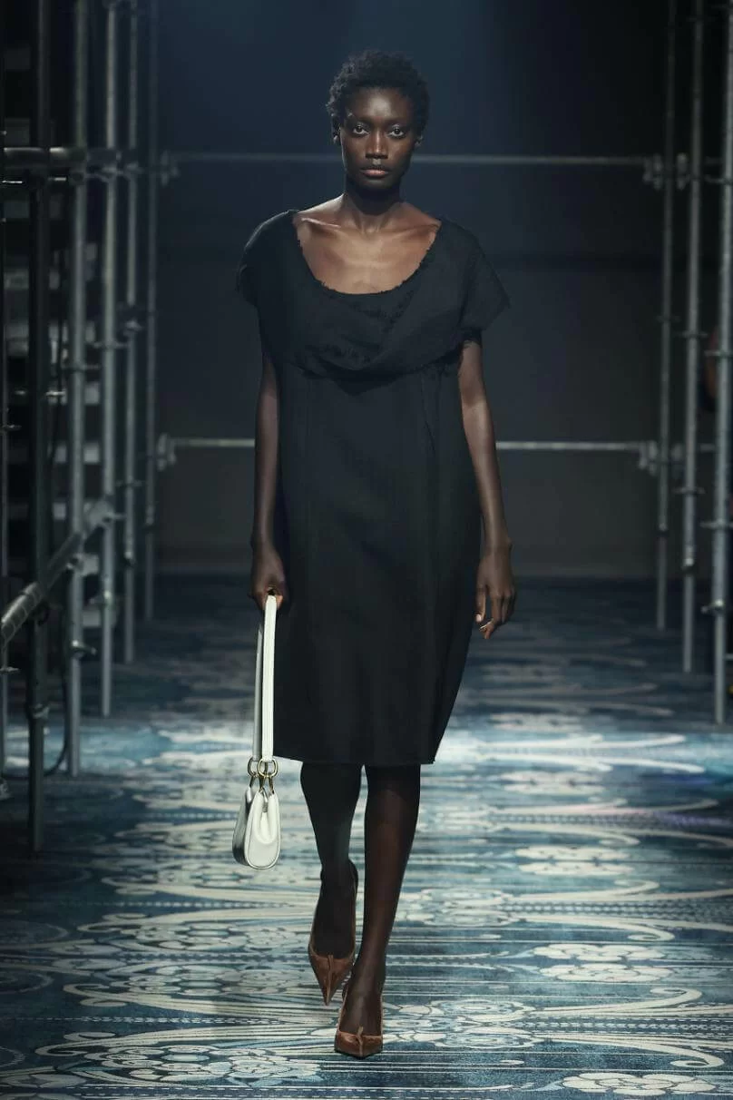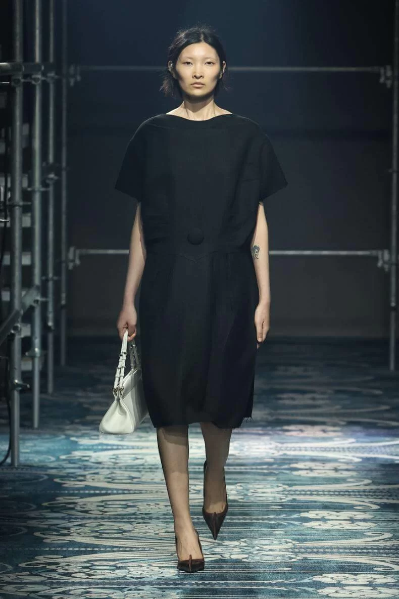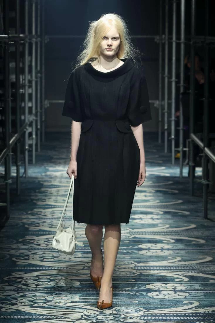 UGLY CHIC 是 MIUCCIA PRADA 一直推崇的設計美學,挑戰傳統審美觀,模糊美與醜的界線。在全新系列中也不例外。開場的四個造型皆以女生必備的小黑裙為靈感,不修腰的寬鬆設計,削弱傳統小黑裙的精緻柔美,帶來隨性的感覺。