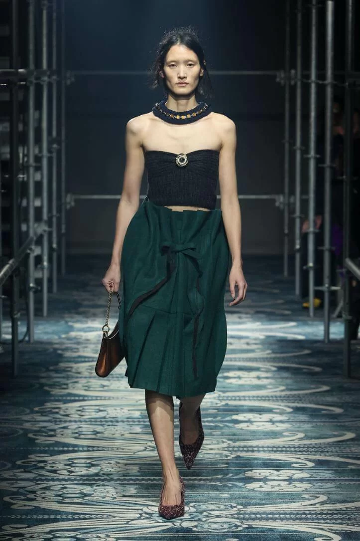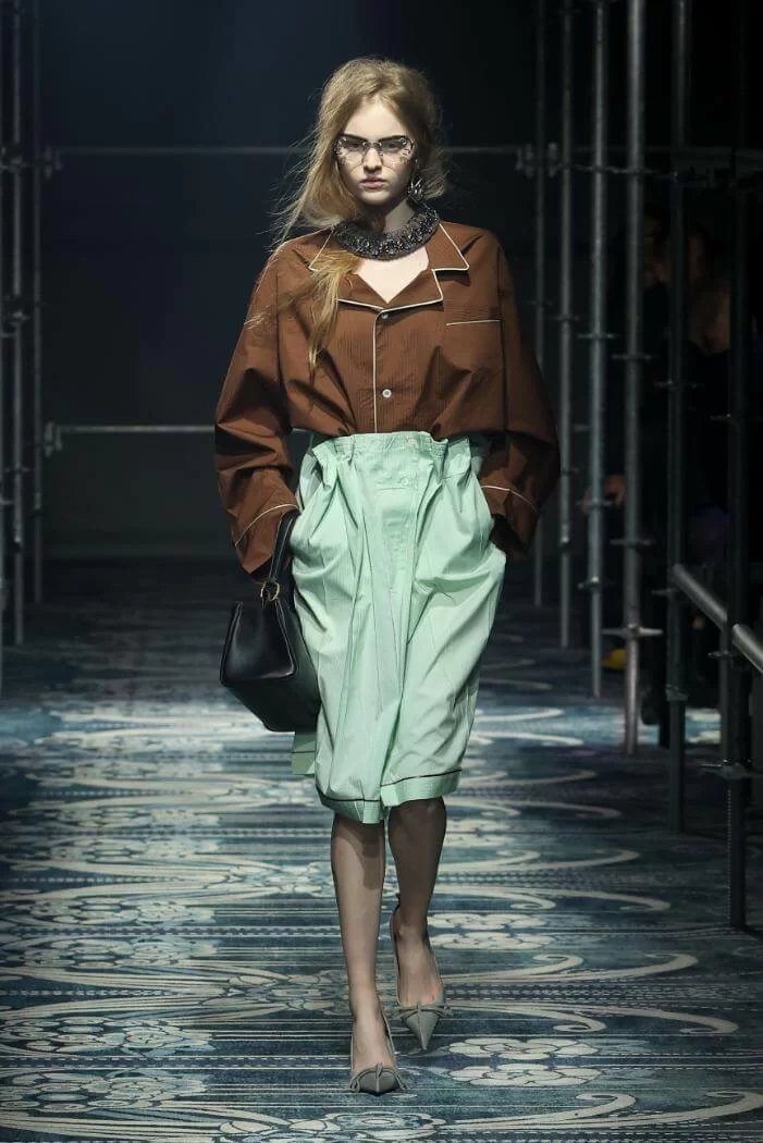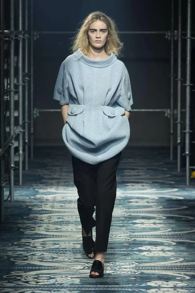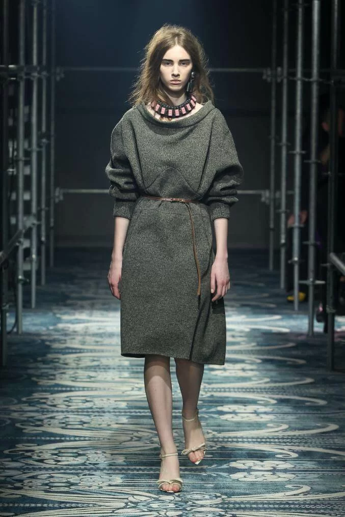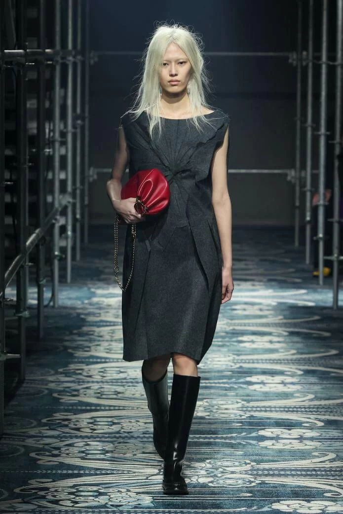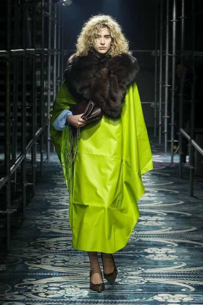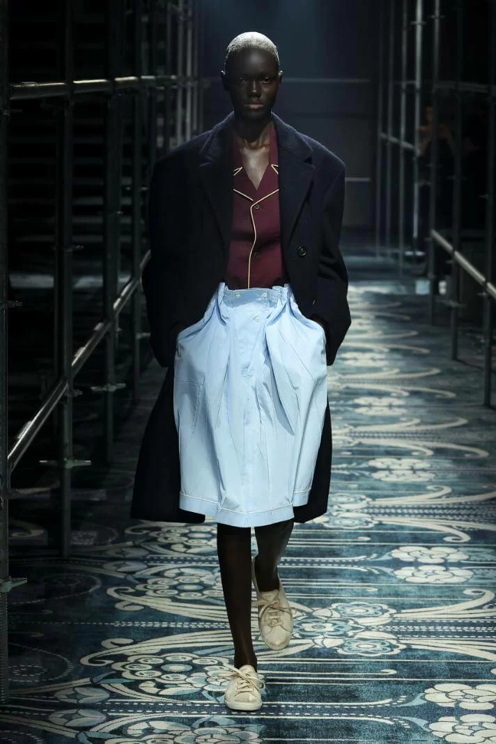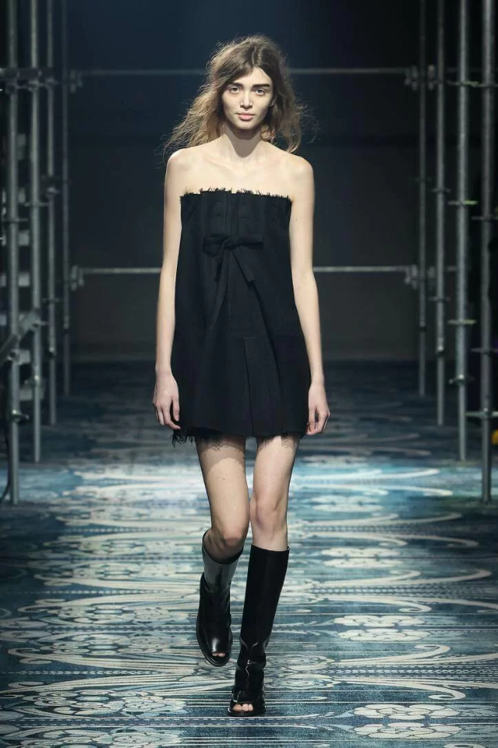 UGLY CHIC 是 MIUCCIA PRADA 一直推崇的設計美學,挑戰傳統審美觀,模糊美與醜的界線。在全新系列中也不例外。開場的四個造型皆以女生必備的小黑裙為靈感,不修腰的寬鬆設計,削弱傳統小黑裙的精緻柔美,帶來隨性的感覺。