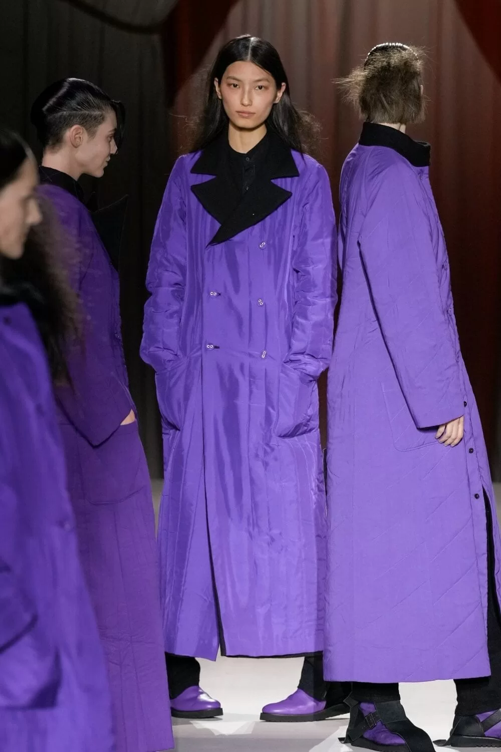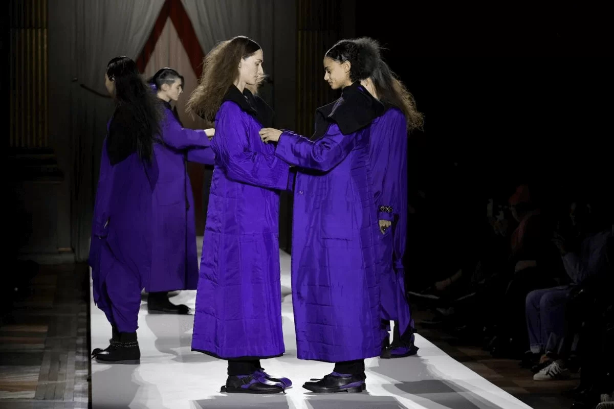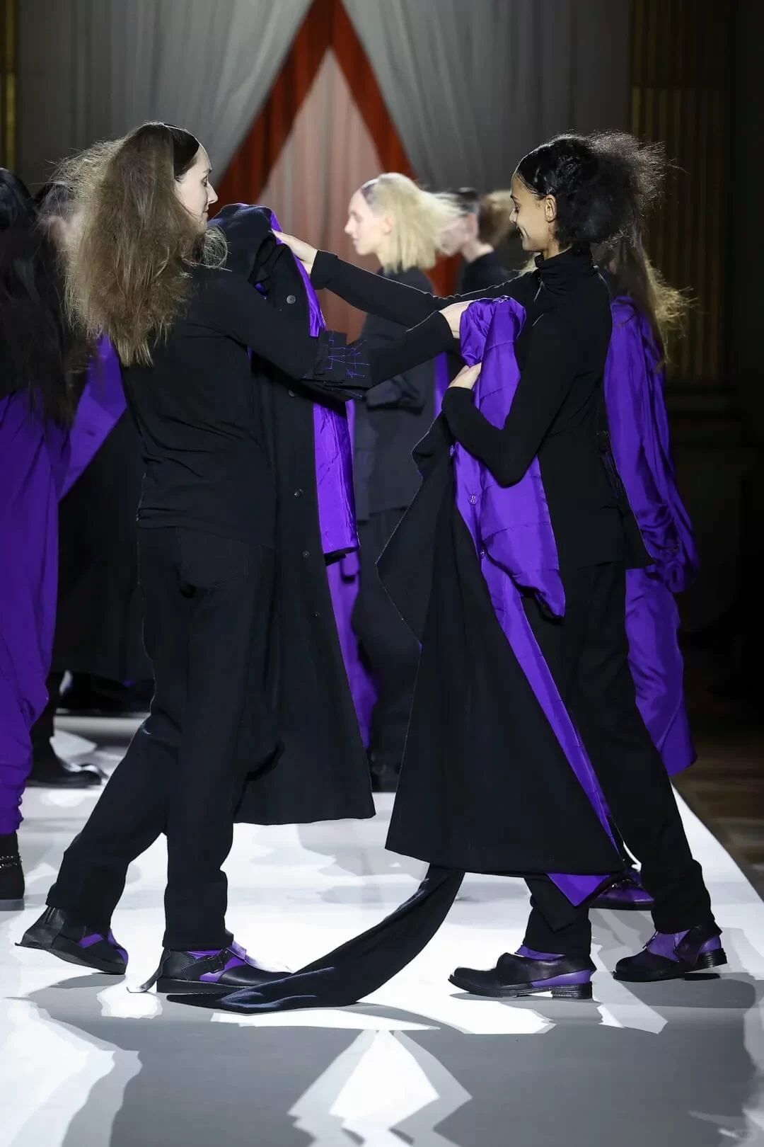 在 YOHJI YAMAMOTO 2025 秋冬系列女裝大秀的尾聲,上演了一小段讓人意想不到的戲劇性時刻:伸展台上的模特兒們為對方脫下身上的黑色大衣,並把大衣翻過來,露出其內部高貴而華麗的紫色絎縫,寓意着服裝的流動性。