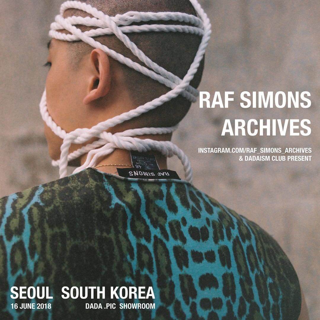 撇除這幅舊照之外,不難發現吳赫的好友也是RAF SIMONS 忠實粉絲。吳赫最不可缺少的時尚單品要數好友創立的DADAISMCLUB專為他打造的「多多」帽,這頂標記多多兩字的黑帽一直以來成為吳赫代名詞。韓國潮牌DADAISMCLUB(다다DADA多多)向來以潮牌方向深入人心,而令人意外的是DADAISMCLUB曾經與RAF_SIMONS_ARCHIVE握手合作,把RAF SIMONS 的影響力播及更廣。去年他們便合作展覽,並把RAF_SIMONS_ARCHIVE最標誌性的圖像印製出來。時裝界的確無界限,RAF SIMONS的設計元素能夠為成後人不斷激發創作的動力,正正提醒我們經典的重要。