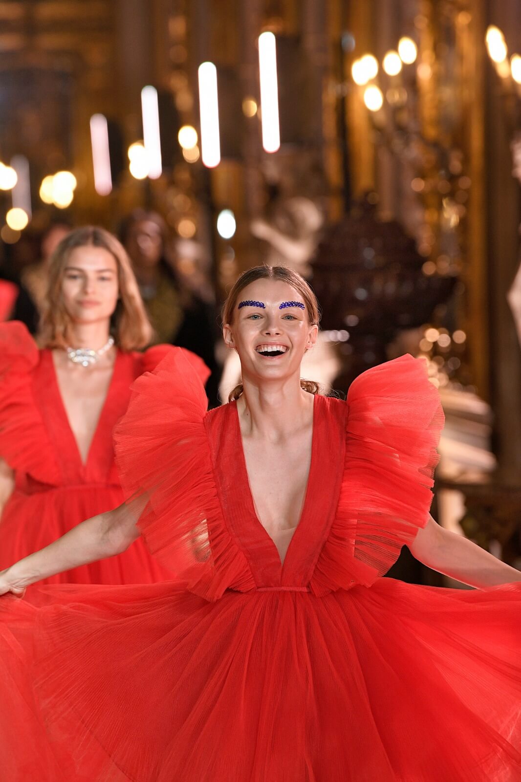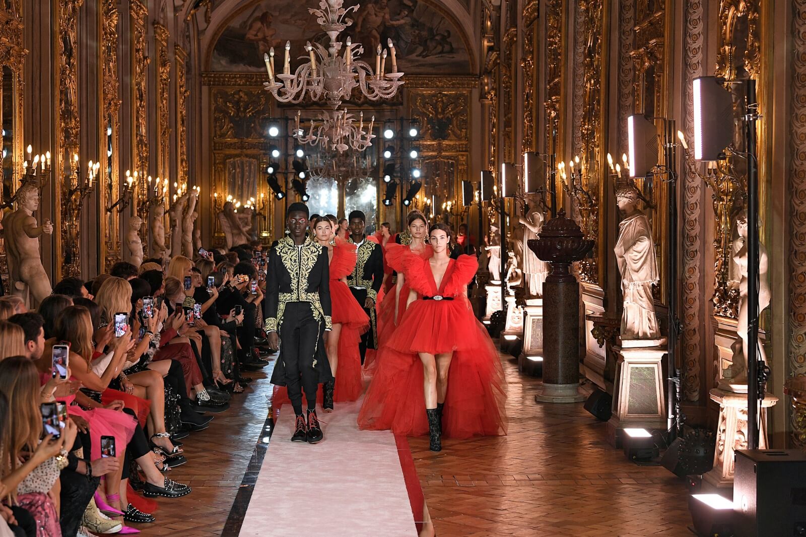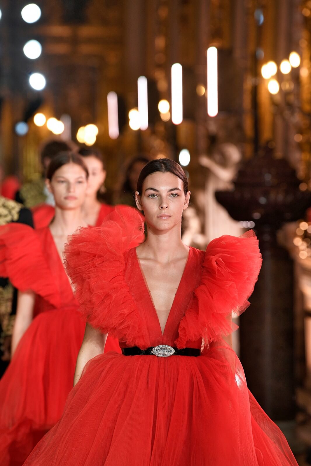 時裝展選址羅馬的一所藝術館:PALAZZO DORIA PAMPHILJ。最後出場的VITTORIA CERETTI穿著一條鮮紅色V領TULLE EVENING DRESS。