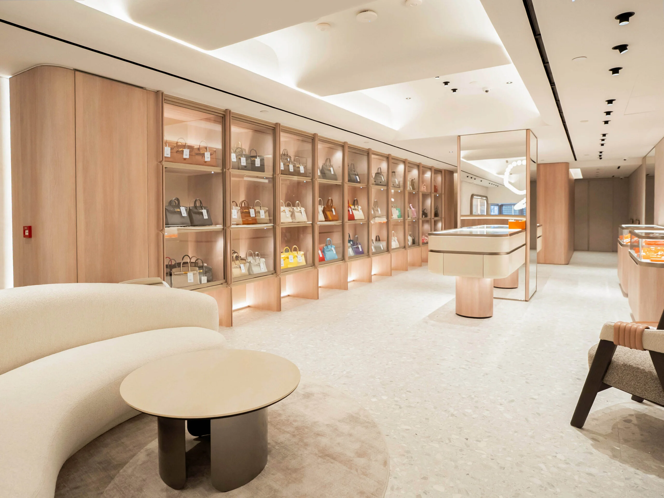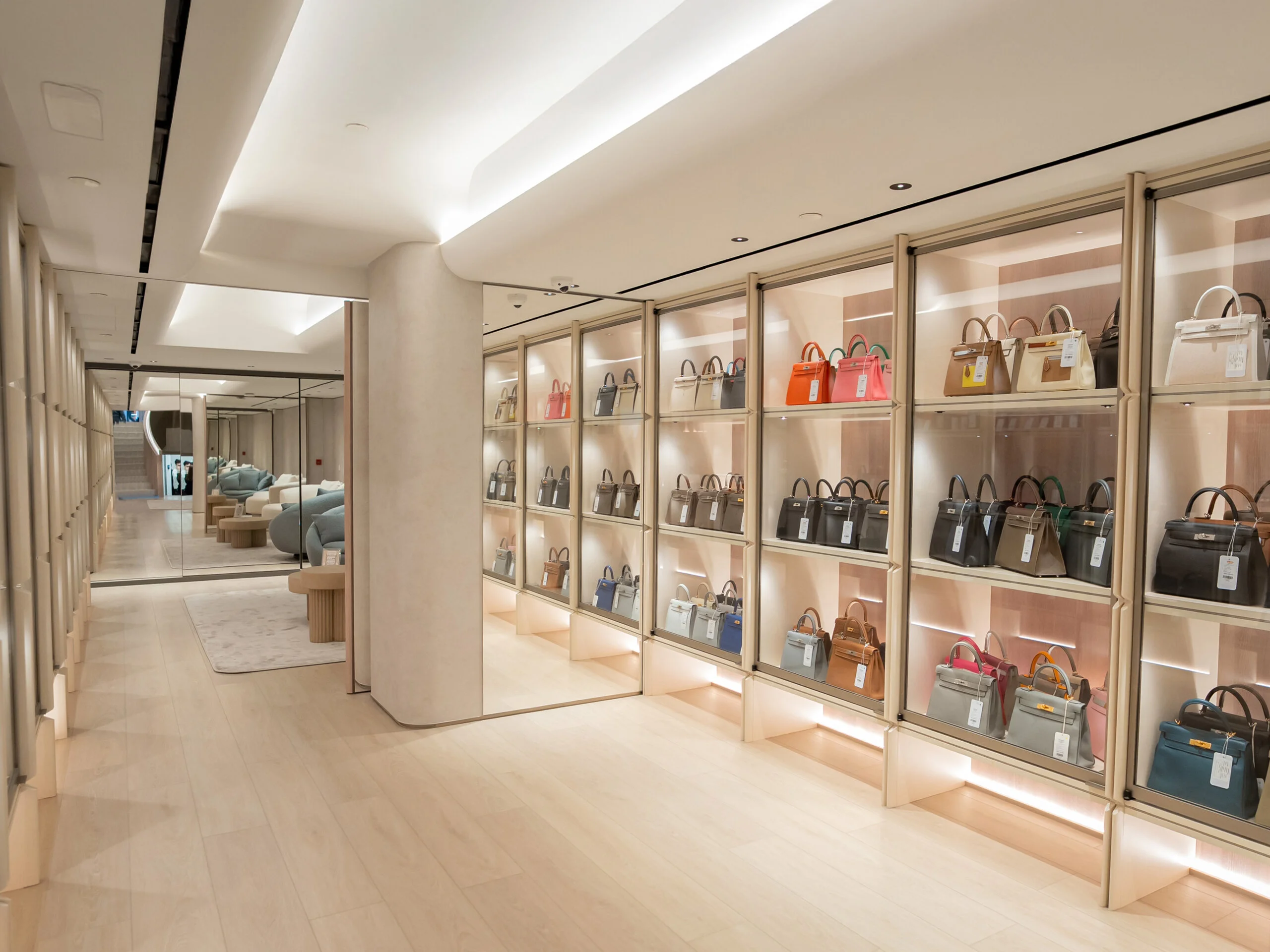 步入店內,空間彷彿展開一場關於細節的靜心對話:柔和弧形牆面自然延展,水磨石地面映出溫潤光澤,一列列色彩鮮明的愛馬仕手袋,如藝術品般被細心陳列。超過1,000件精選藏品匯聚於此,變身沉浸式展廳,恍如一道通往愛馬仕收藏世界的入口。
