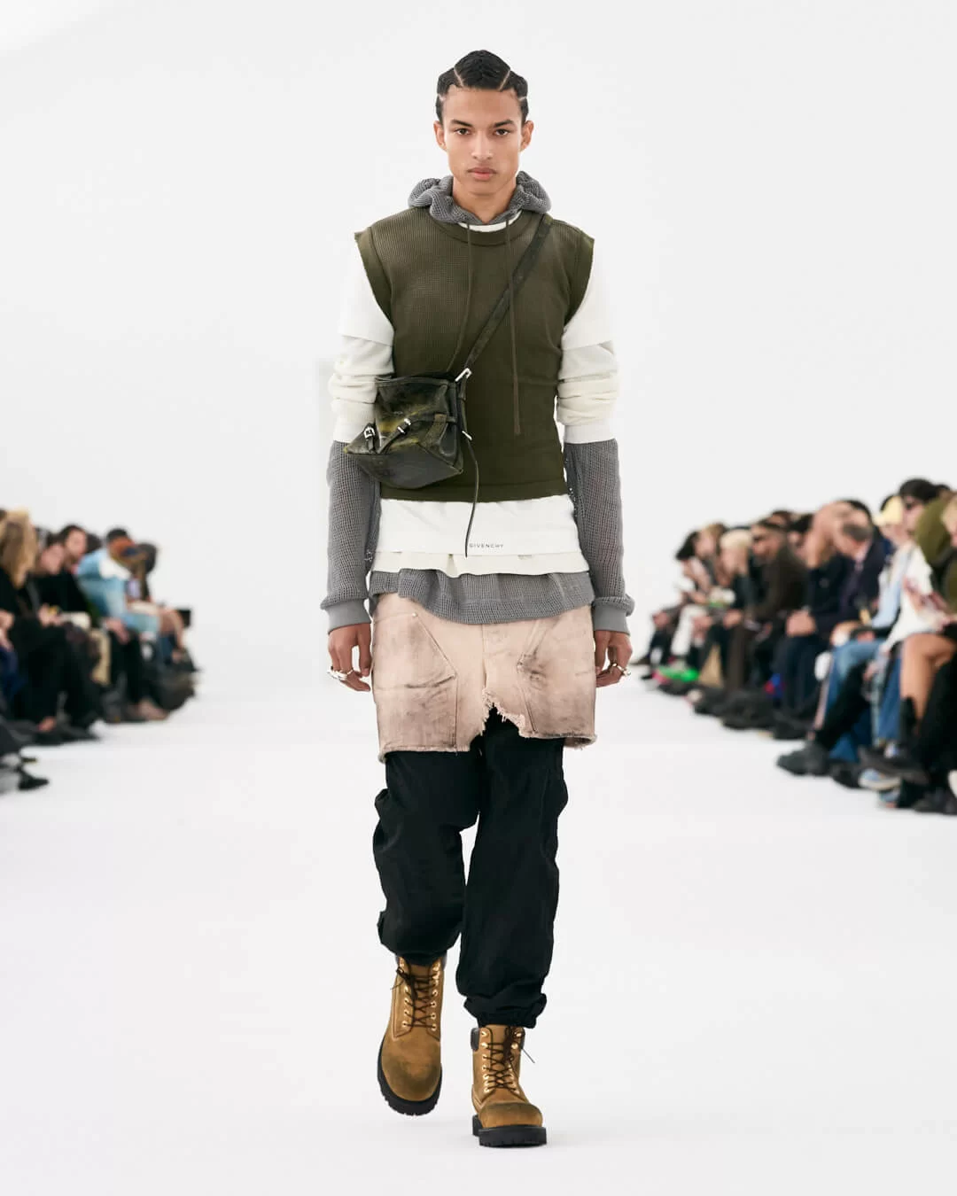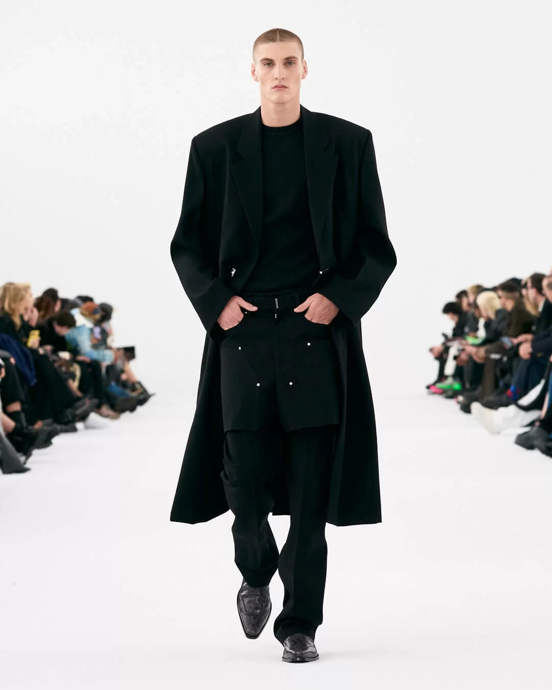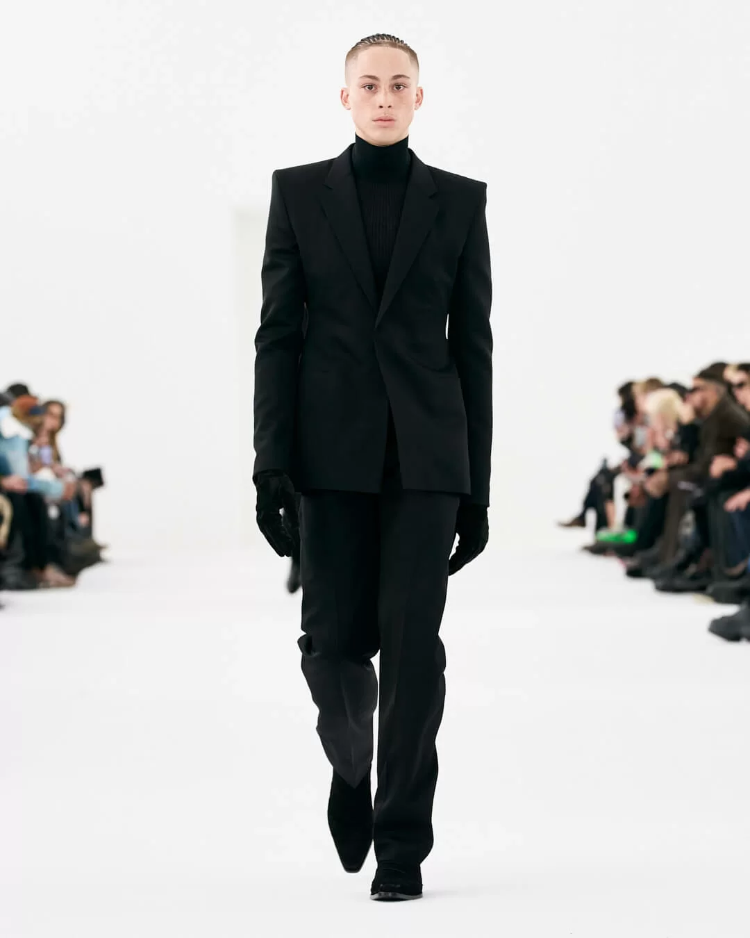 GIVENCHY 將時裝展場地打造成一個純白的箱子,突顯了破格的剪裁和複雜的布料處理技術。而這些街頭概念亦體現於西裝上,GIVENCHY 帶來於高訂工坊製作的四套黑色西裝,縫合位置刻意不留褶邊,任由布料披散,形成更修長的輪廓。而這項技巧也啟發了設計師鑽研立體的比例,打造出更豐富的層次,極致演繹比例的全新概念。