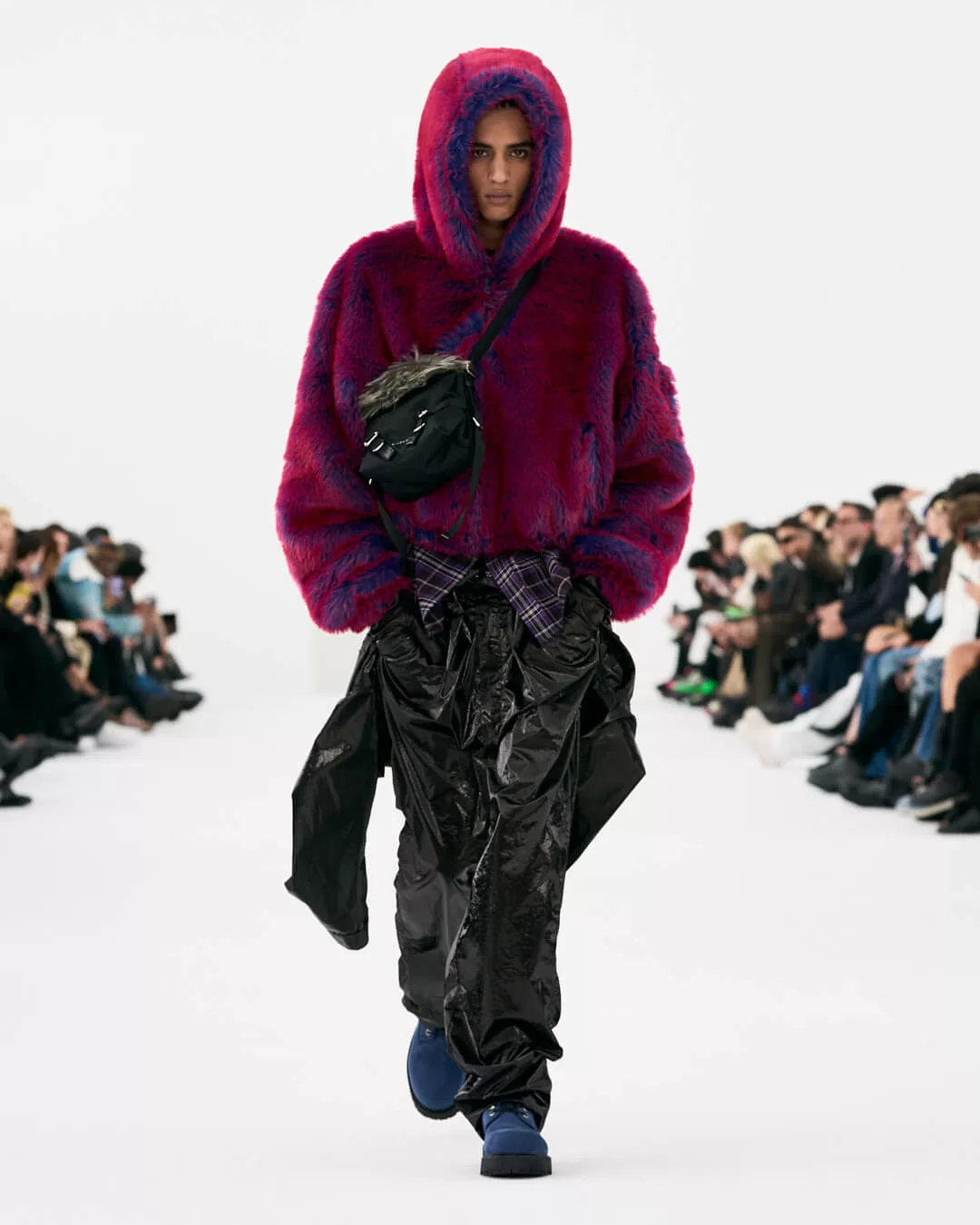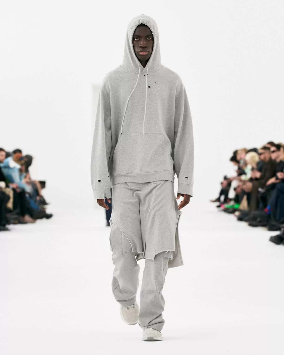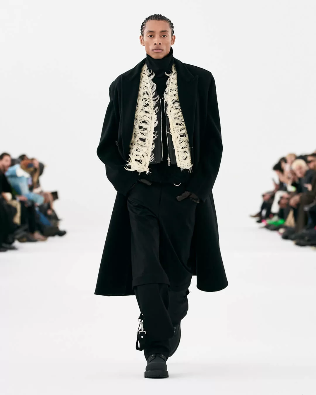 GIVENCHY 將時裝展場地打造成一個純白的箱子,突顯了破格的剪裁和複雜的布料處理技術。而這些街頭概念亦體現於西裝上,GIVENCHY 帶來於高訂工坊製作的四套黑色西裝,縫合位置刻意不留褶邊,任由布料披散,形成更修長的輪廓。而這項技巧也啟發了設計師鑽研立體的比例,打造出更豐富的層次,極致演繹比例的全新概念。