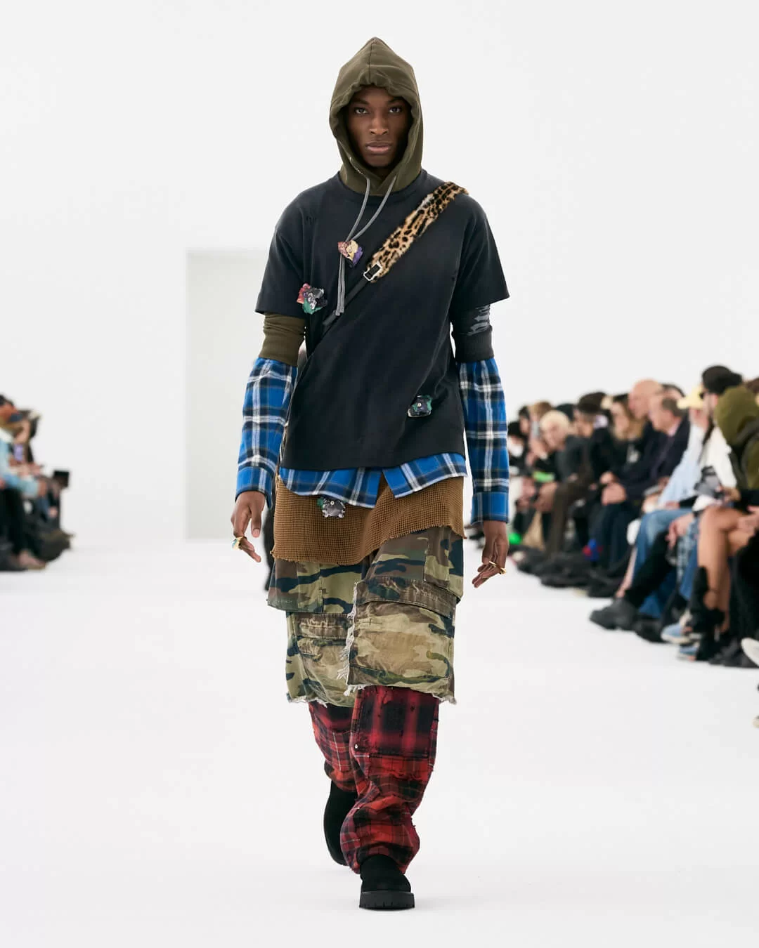 今季層次極多佐卻不顯累贅,例如解構衛衣;短衫內搭多層鬆身的運動服;工裝褲隨意剪開變成披於運動褲外的半截裙,全都以出奇不已的層次塑造出讓人驚艷且優雅的輪廓。同時,美國文化的圖案,包括格紋、迷彩、火焰圖案、牛仔布、染白帆布、麻灰色、螢光色調和青春的粉色也隨處可見,富都市活力的氣氛十足。
