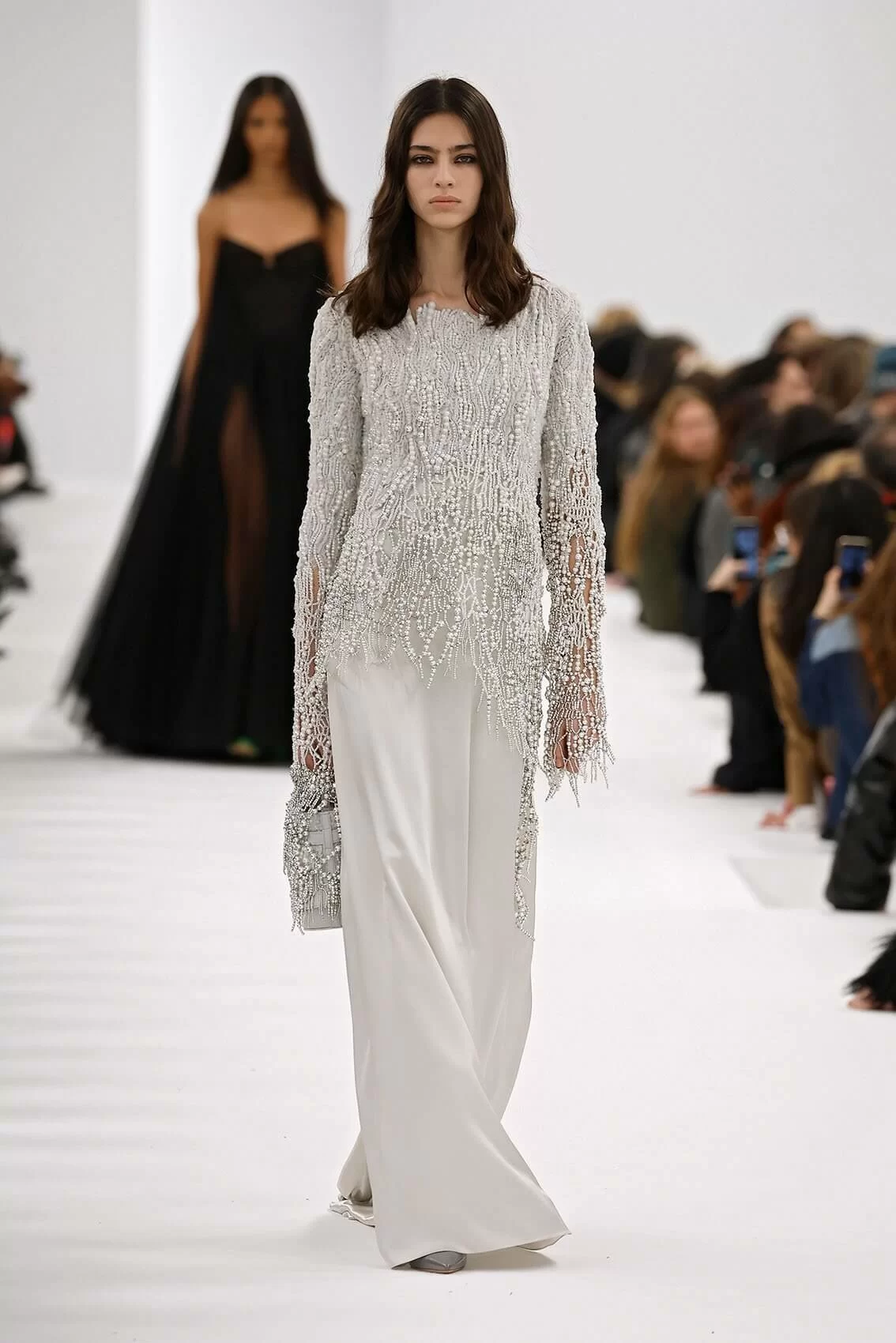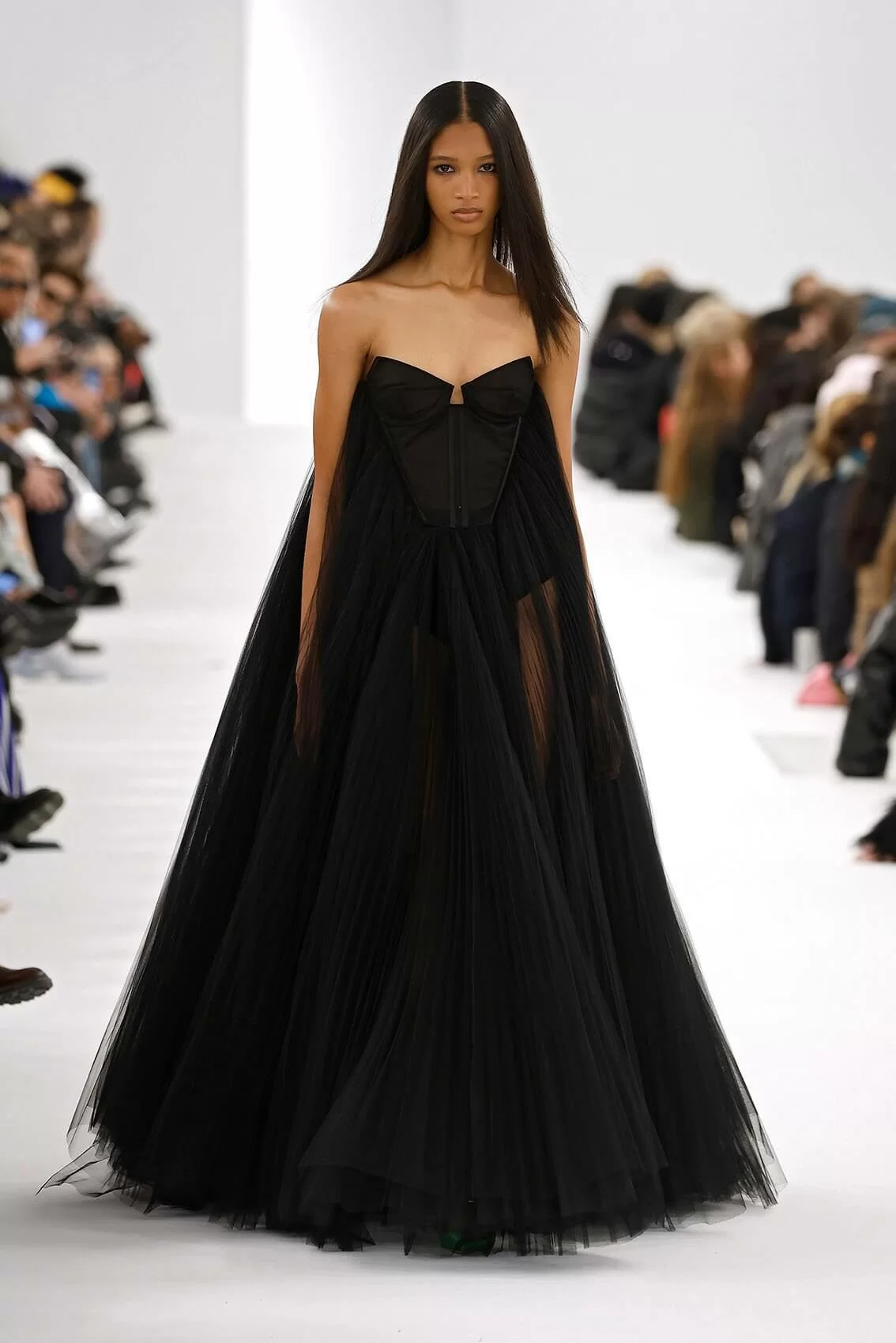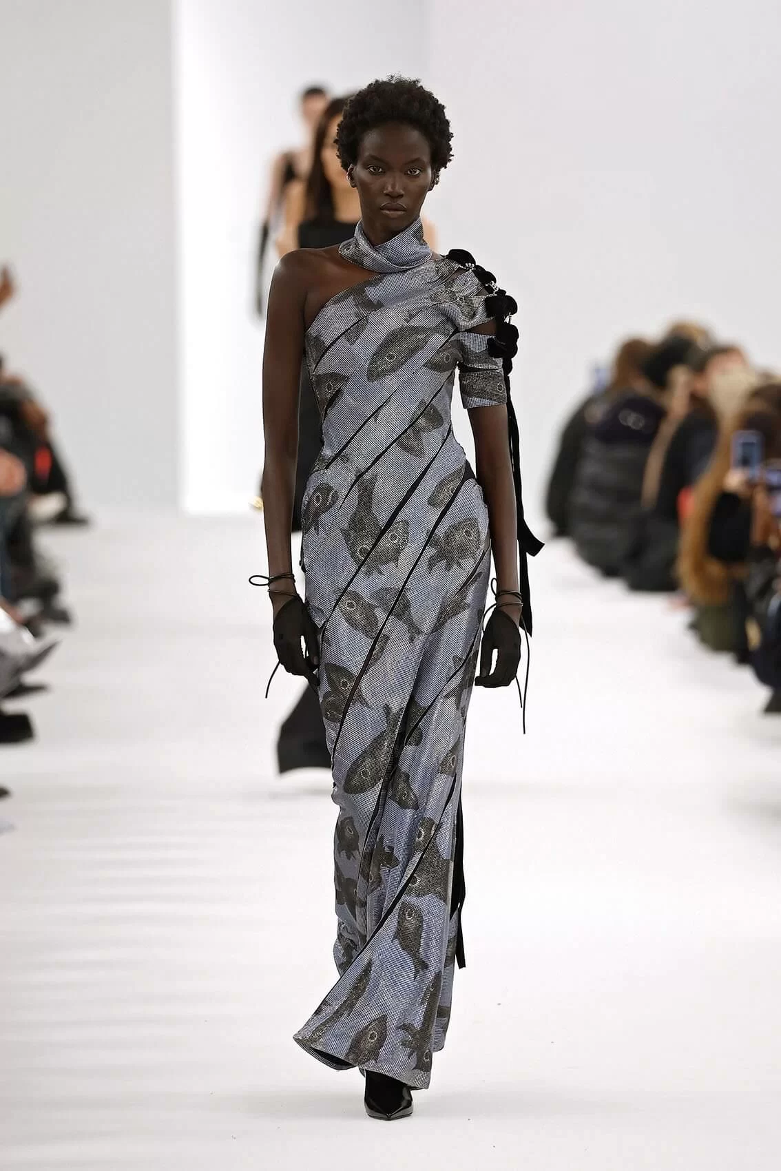 同樣在高級訂造服工坊創造的還有從昔日設計取材的晚裝,華麗的雪尼爾傘裙繡滿迷你花朵尼龍貼花,而由緊身胸衣變奏而成的立體黑色三角形薄紗連身裙的褶襇則以全人手製作,展現豐富層次感。取材自 HUBERT DE GIVENCHY 設計的花朵圖案換上重度染色的鐳射切割尼龍。魚和花朵圖案反映品牌對隨機或象徵性意象的研究,以華麗魅力引起共鳴。經典設計圖案巧 妙融入褶飾拖尾長裙、亮片連身裙,以及由圍繞身體的飾帶交織而成的晚裝之中。添上繽紛細節的皮革或錘面緞料企領連身裙, 亦保持與純淨色彩的平衡。