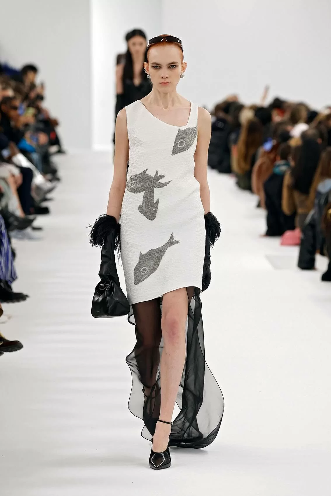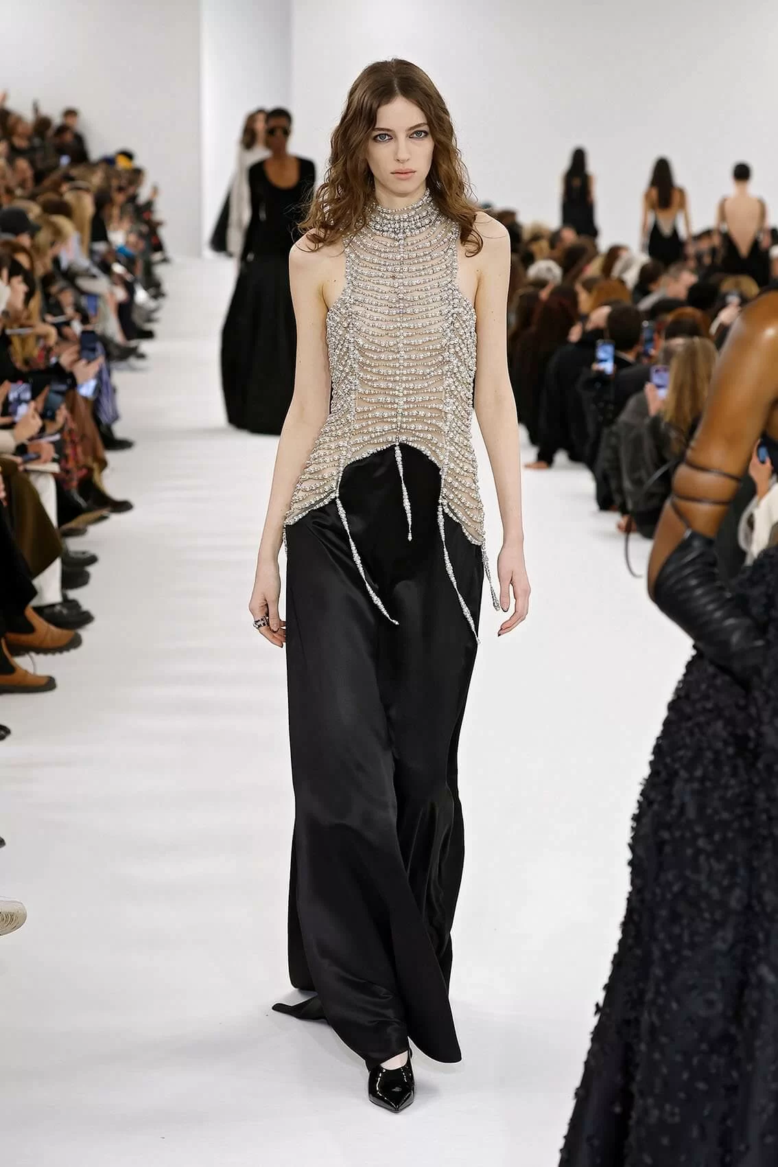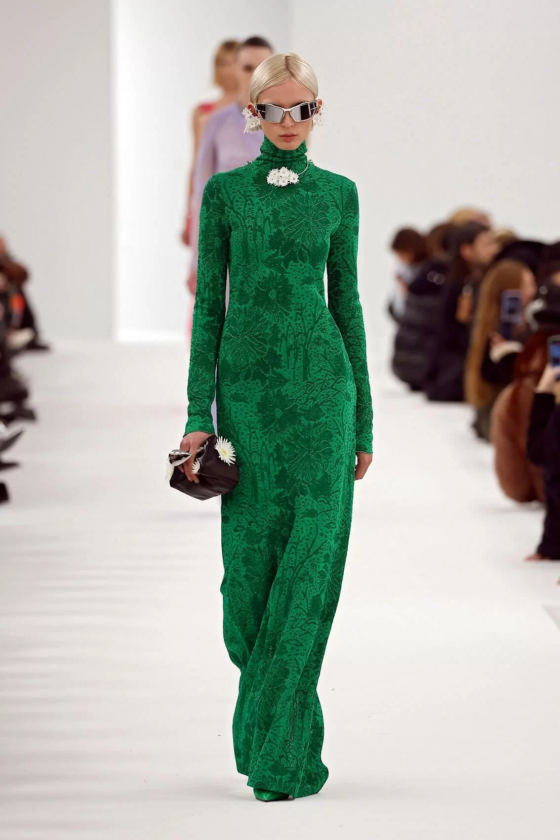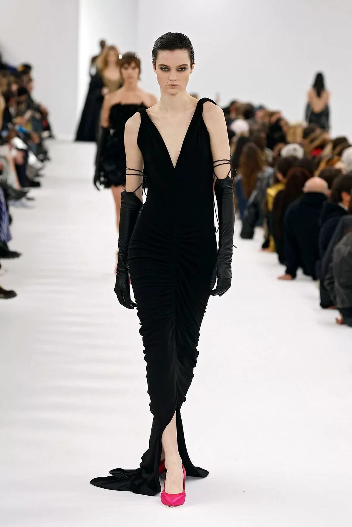 同樣在高級訂造服工坊創造的還有從昔日設計取材的晚裝,華麗的雪尼爾傘裙繡滿迷你花朵尼龍貼花,而由緊身胸衣變奏而成的立體黑色三角形薄紗連身裙的褶襇則以全人手製作,展現豐富層次感。取材自 HUBERT DE GIVENCHY 設計的花朵圖案換上重度染色的鐳射切割尼龍。魚和花朵圖案反映品牌對隨機或象徵性意象的研究,以華麗魅力引起共鳴。經典設計圖案巧 妙融入褶飾拖尾長裙、亮片連身裙,以及由圍繞身體的飾帶交織而成的晚裝之中。添上繽紛細節的皮革或錘面緞料企領連身裙, 亦保持與純淨色彩的平衡。