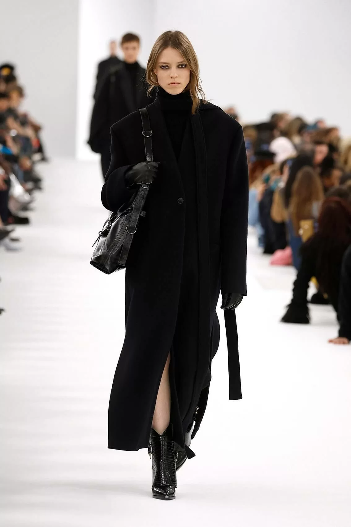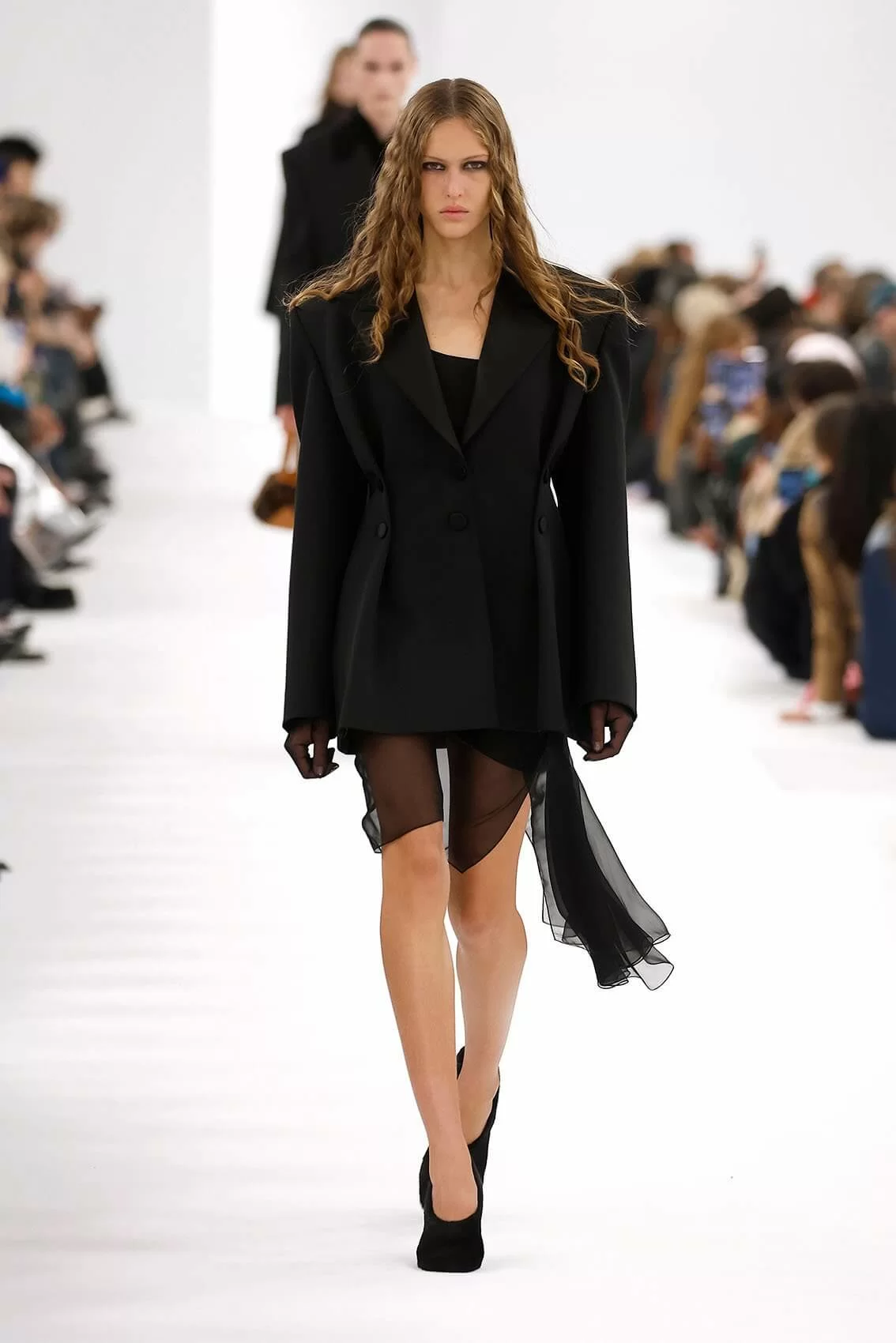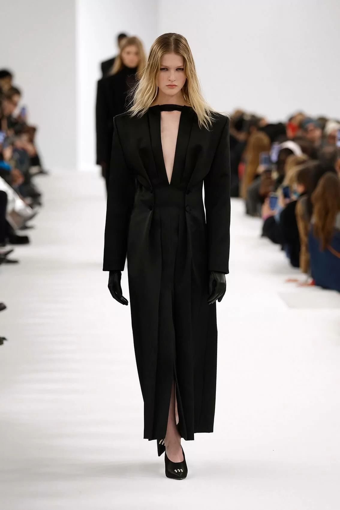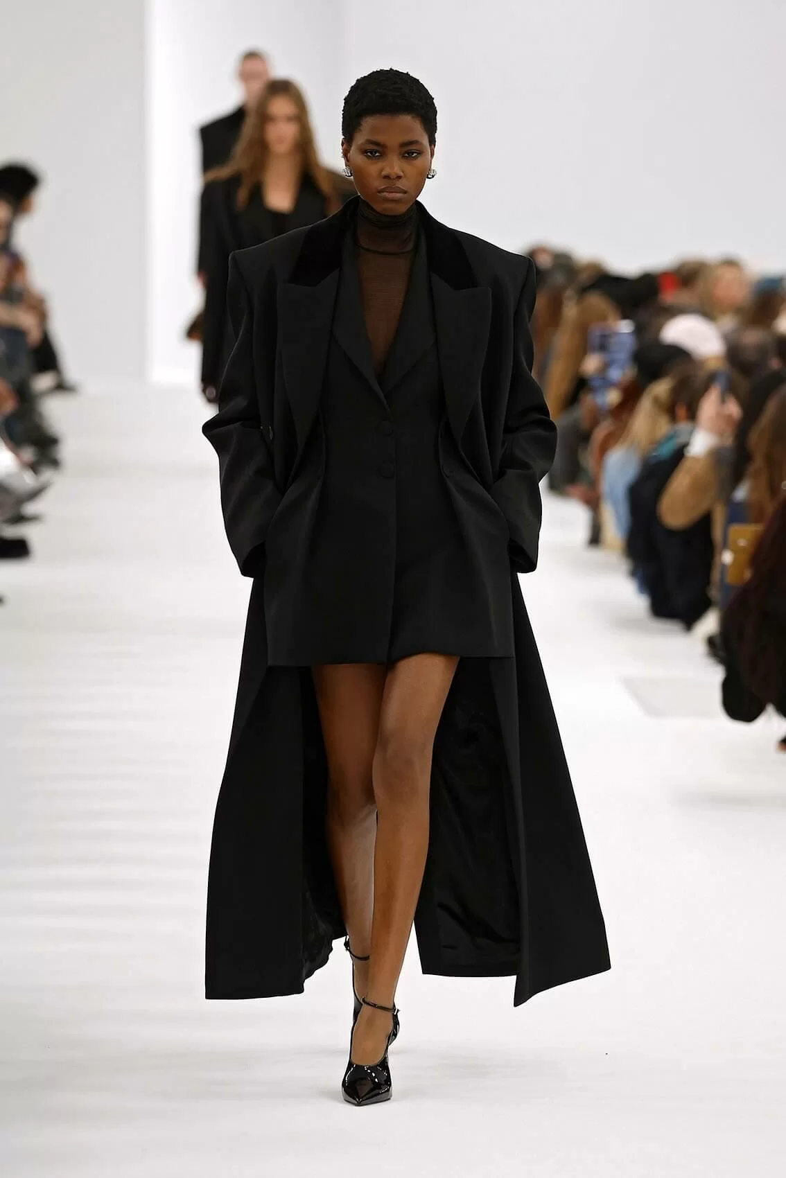 系列以一系列的黑色外套打開序幕,不同的變奏版本定下今次的優雅基調。西裝的比例被放大,線條 俐落的肩膊配上微微修腰的設計,毫不束縛。由高級訂造服工坊主理的黑色大衣以緞料、斜紋布、茄士咩或馬海毛匠心打造, 並在背幅添上倒轉的褶襇或以衣鈕點綴腰部。採用同一剪裁的西裝外套僅以透薄的物料支撐,透現連身迷你裙的誘人魅力。
