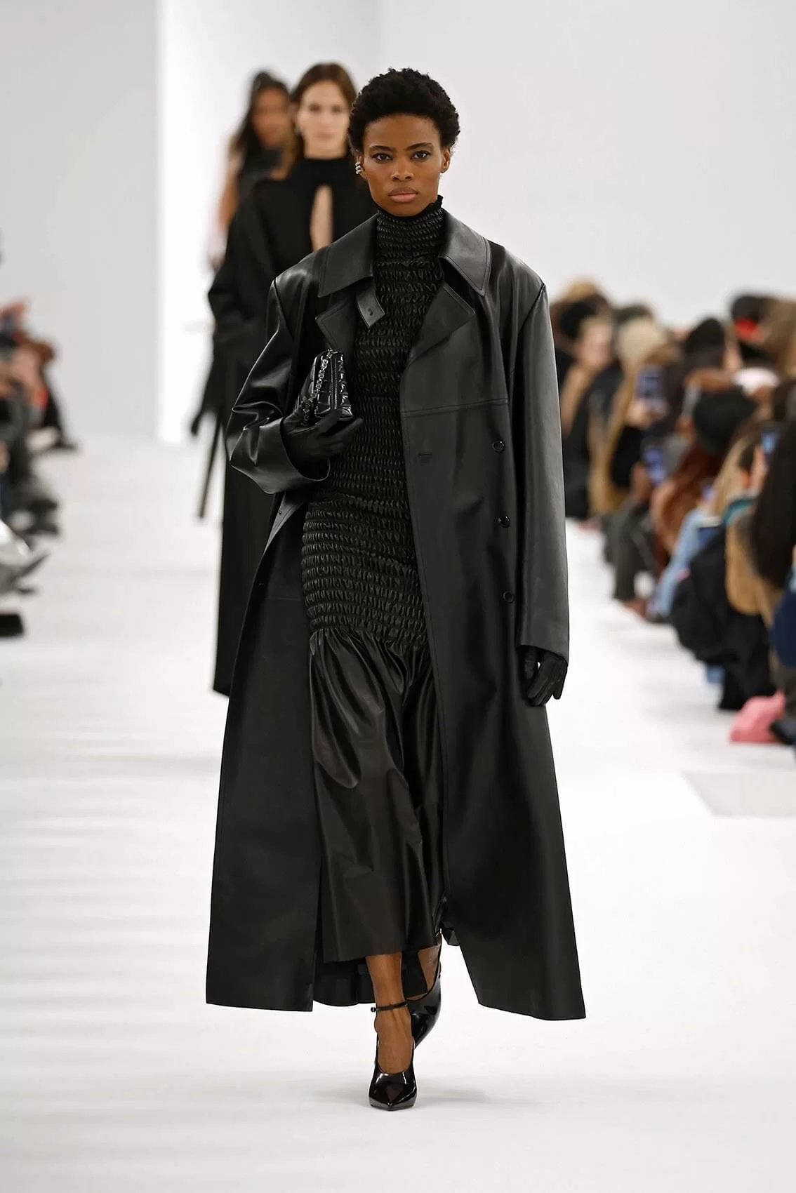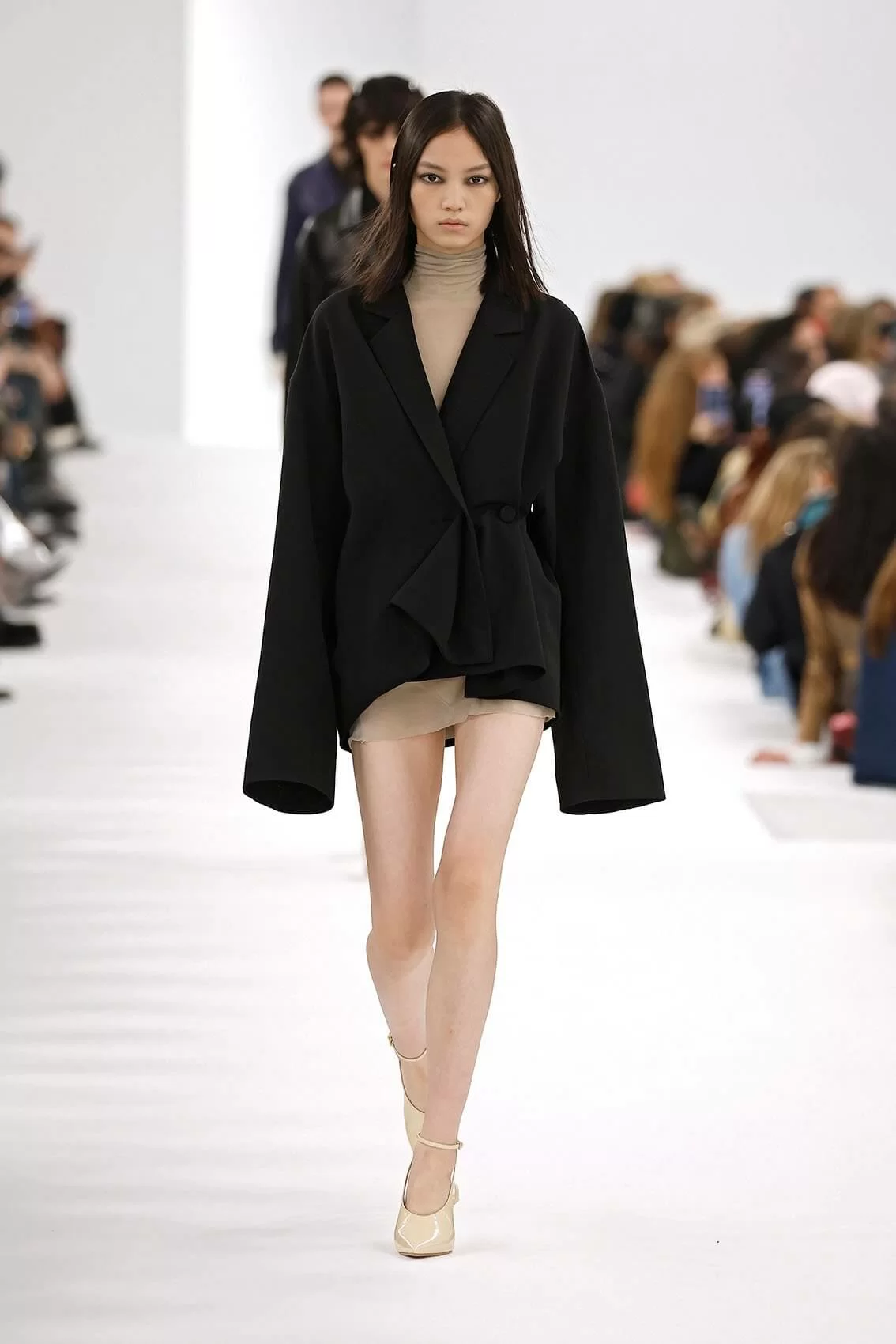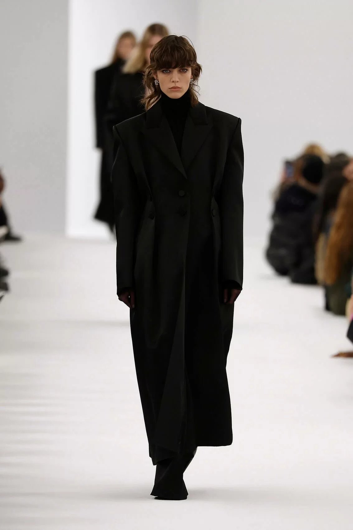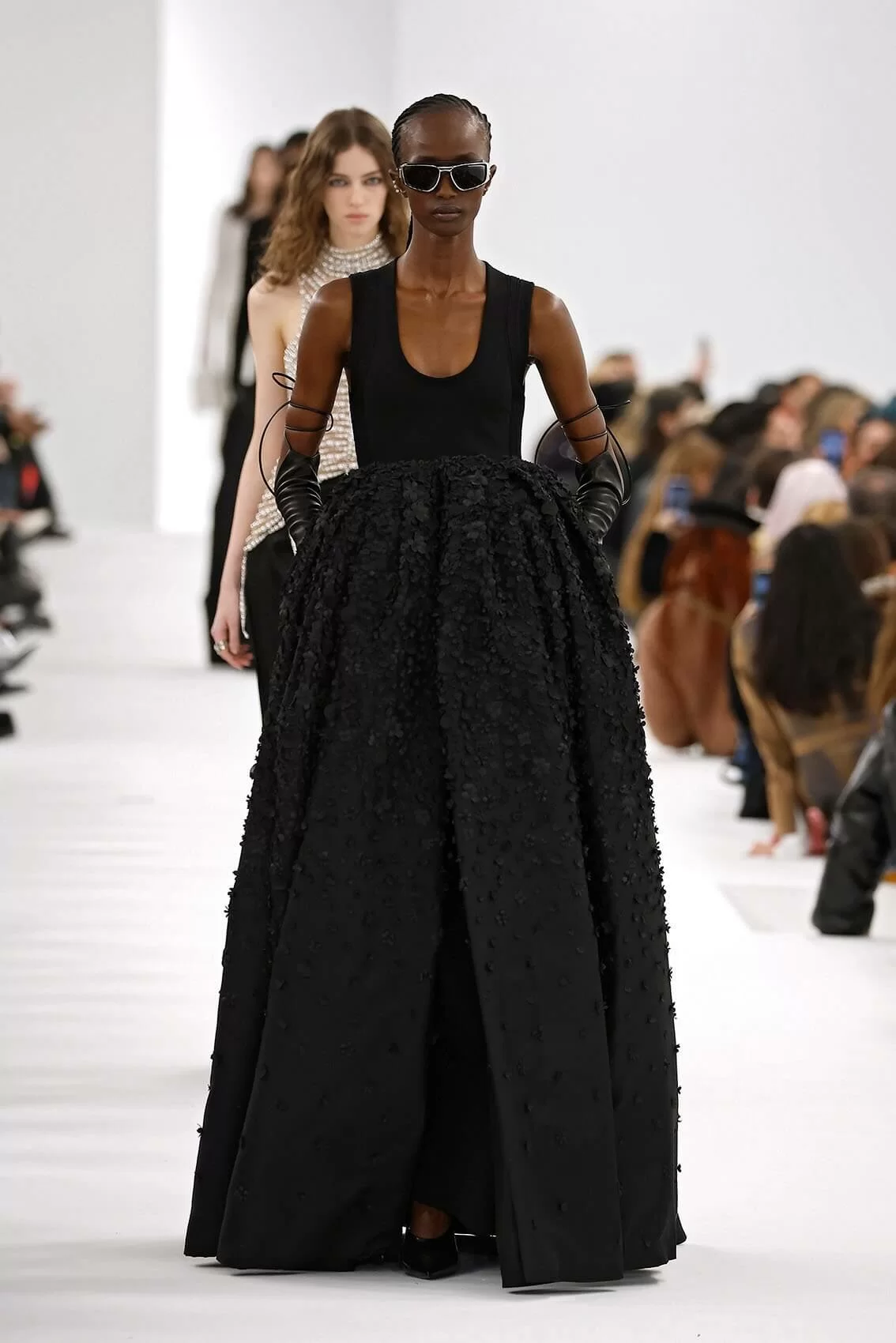 系列以一系列的黑色外套打開序幕,不同的變奏版本定下今次的優雅基調。西裝的比例被放大,線條 俐落的肩膊配上微微修腰的設計,毫不束縛。由高級訂造服工坊主理的黑色大衣以緞料、斜紋布、茄士咩或馬海毛匠心打造, 並在背幅添上倒轉的褶襇或以衣鈕點綴腰部。採用同一剪裁的西裝外套僅以透薄的物料支撐,透現連身迷你裙的誘人魅力。