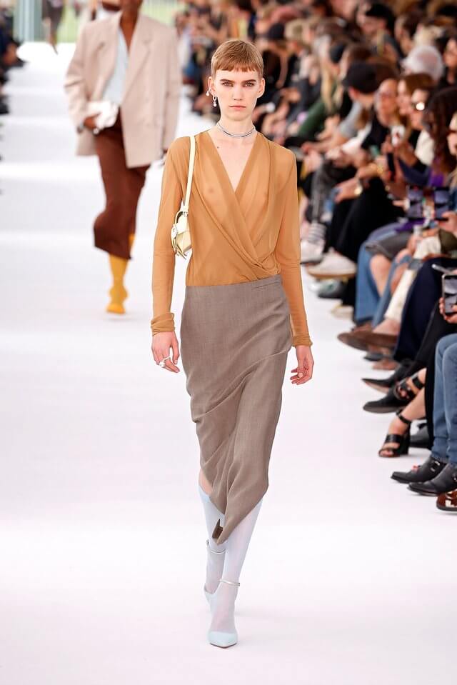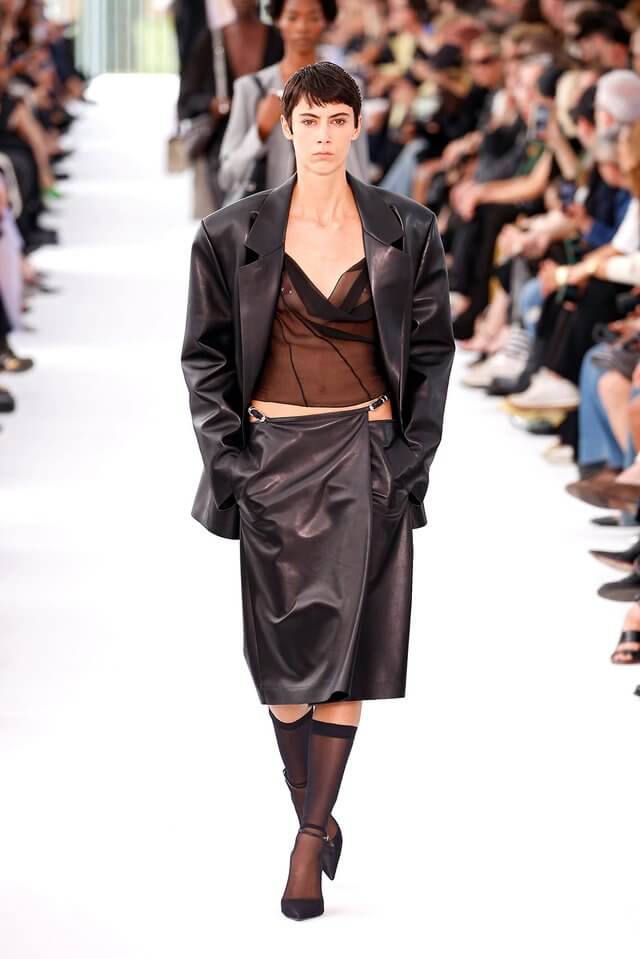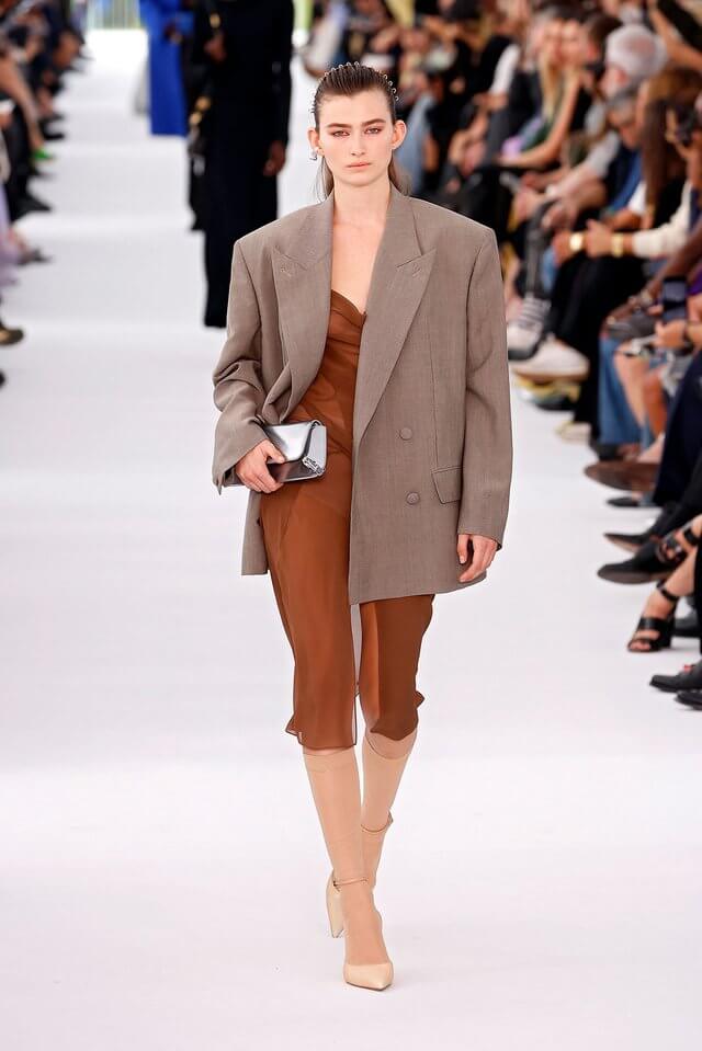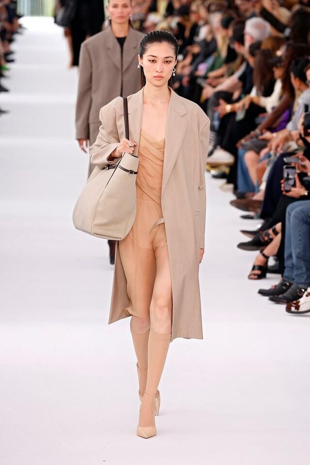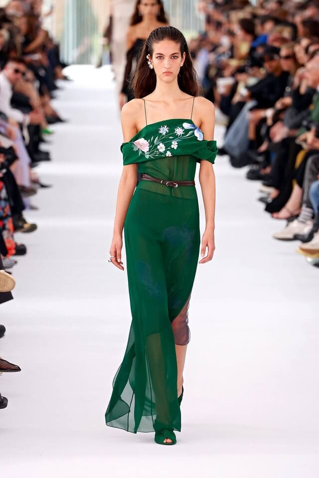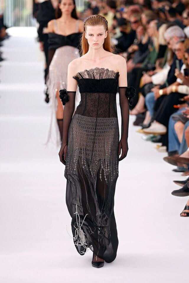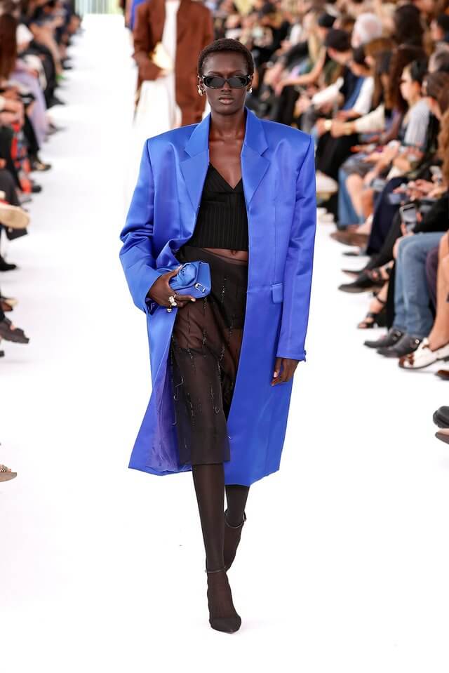 系列共帶來 52 套造型,除了經典黑白色之外,還加入了許多奶油黃、淡藍、香芋紫及藕粉等低飽和度的柔和色調。 闊膊長款大衣採用優質緞料精心製作,而立挺輪廓的西裝外套則使用男裝羊毛布料打造,收腰設計凸顯女性線條。 各式外套下搭配雪紡、塔夫綢和歐根紗,輕盈飄逸面料堆疊的裙裝,營造柔焦濾鏡效果,演繹品牌的矇矓美學,而 MATTHEW 還在這些透視感的面料上利用刺繡 、手繪圖案、印花、褶飾和扭結等技術將花卉元素融入其中,注入多一分浪漫氣息,使得整體造型遊走於硬朗俐落與優雅隨性之間,展現女性剛柔並濟的獨特魅力。