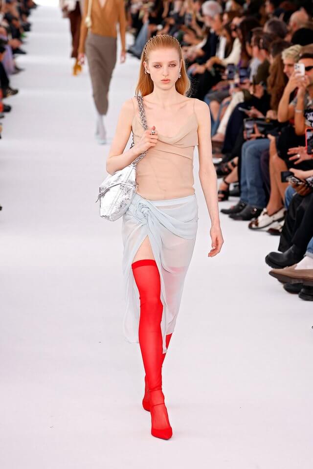 MATTHEW 更將洋裝的柔焦疊層效果延長,將尖銳的高跟鞋藏在黑及粉紅色網布中,變成附有足踝搭帶的長靴,鞋款以皮革和水晶交織而成,為每一步增添一抹優雅。
