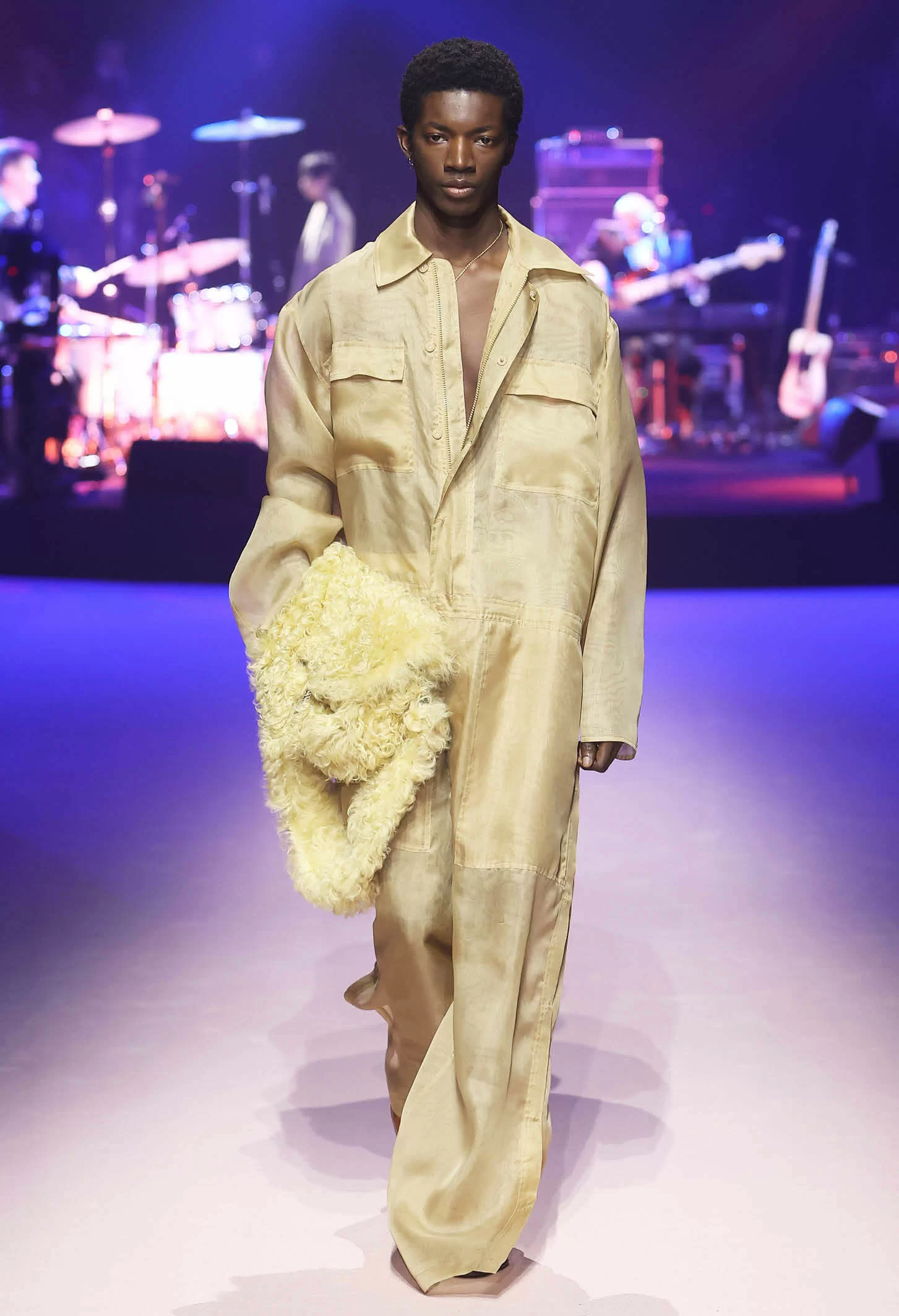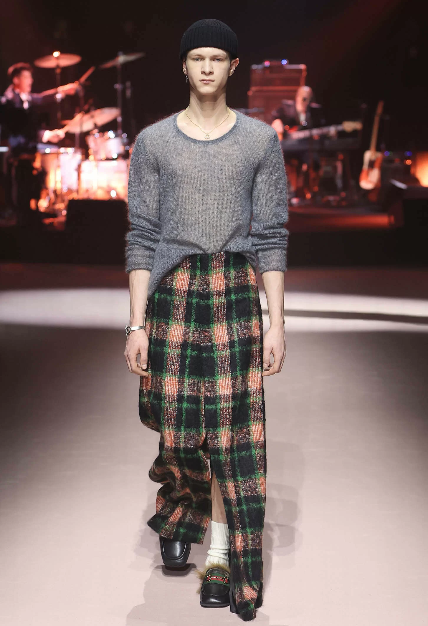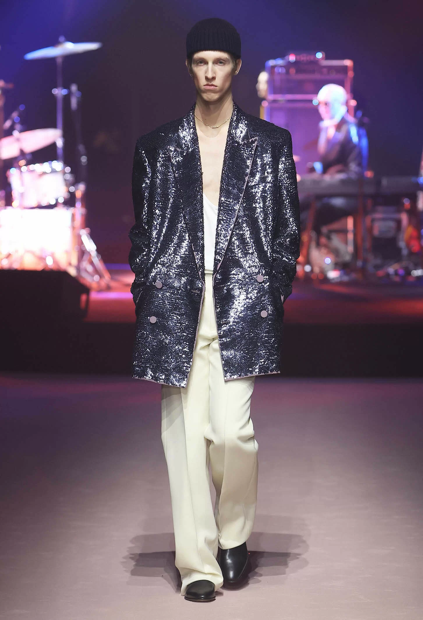 今季大騷上,GUCCI 找來噪音搖滾(NOISE ROCK)三人組 MARC RIBOT’S CERAMIC DOG 表演,以爵士樂及龐克(PUNK)等即興音樂創作常用的類型元素演繹系列的能量,而服裝由不同人演繹,多元個性透徹地呼應 GUCCI 不同面向的男性魅力。