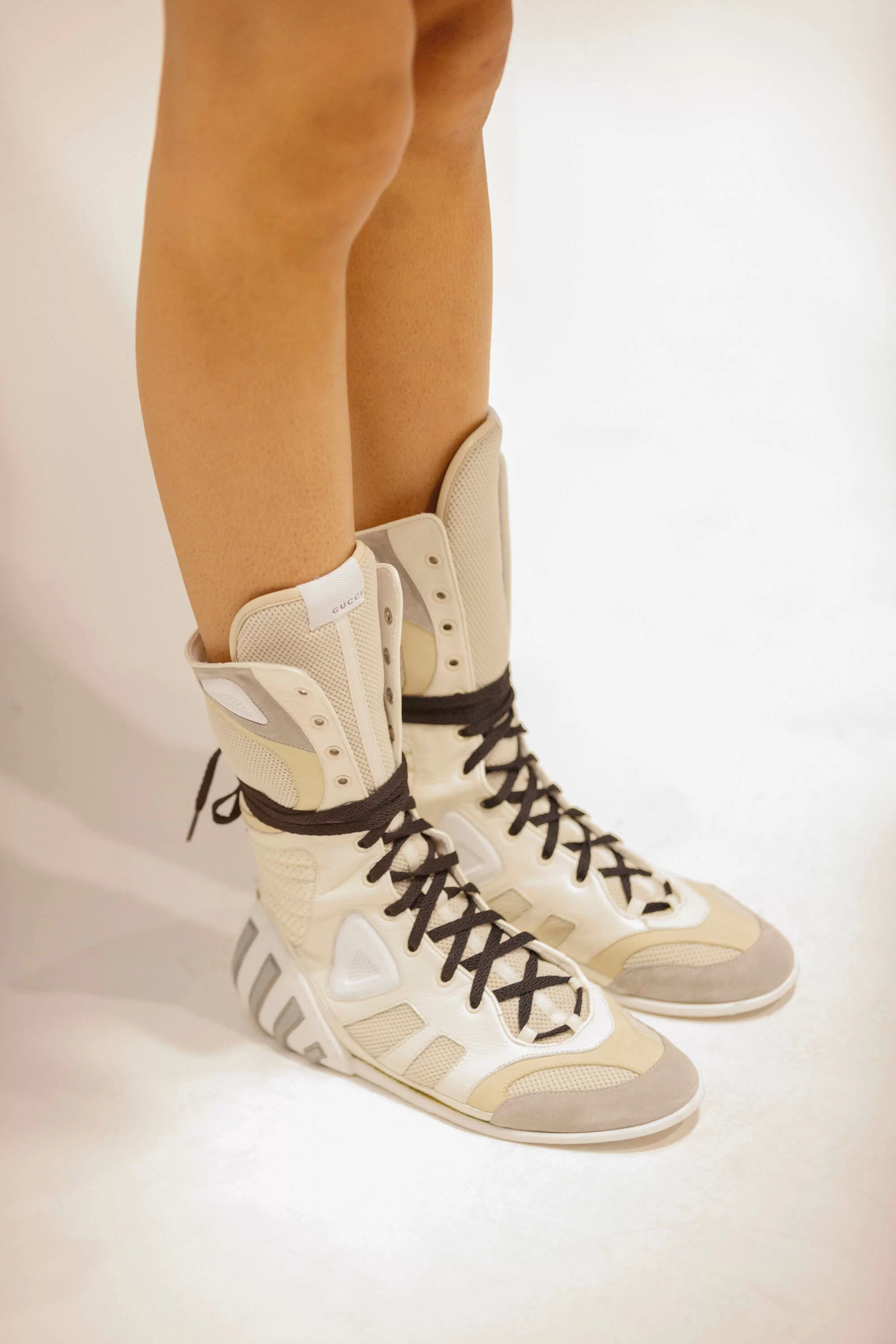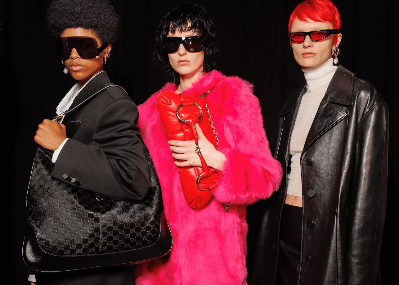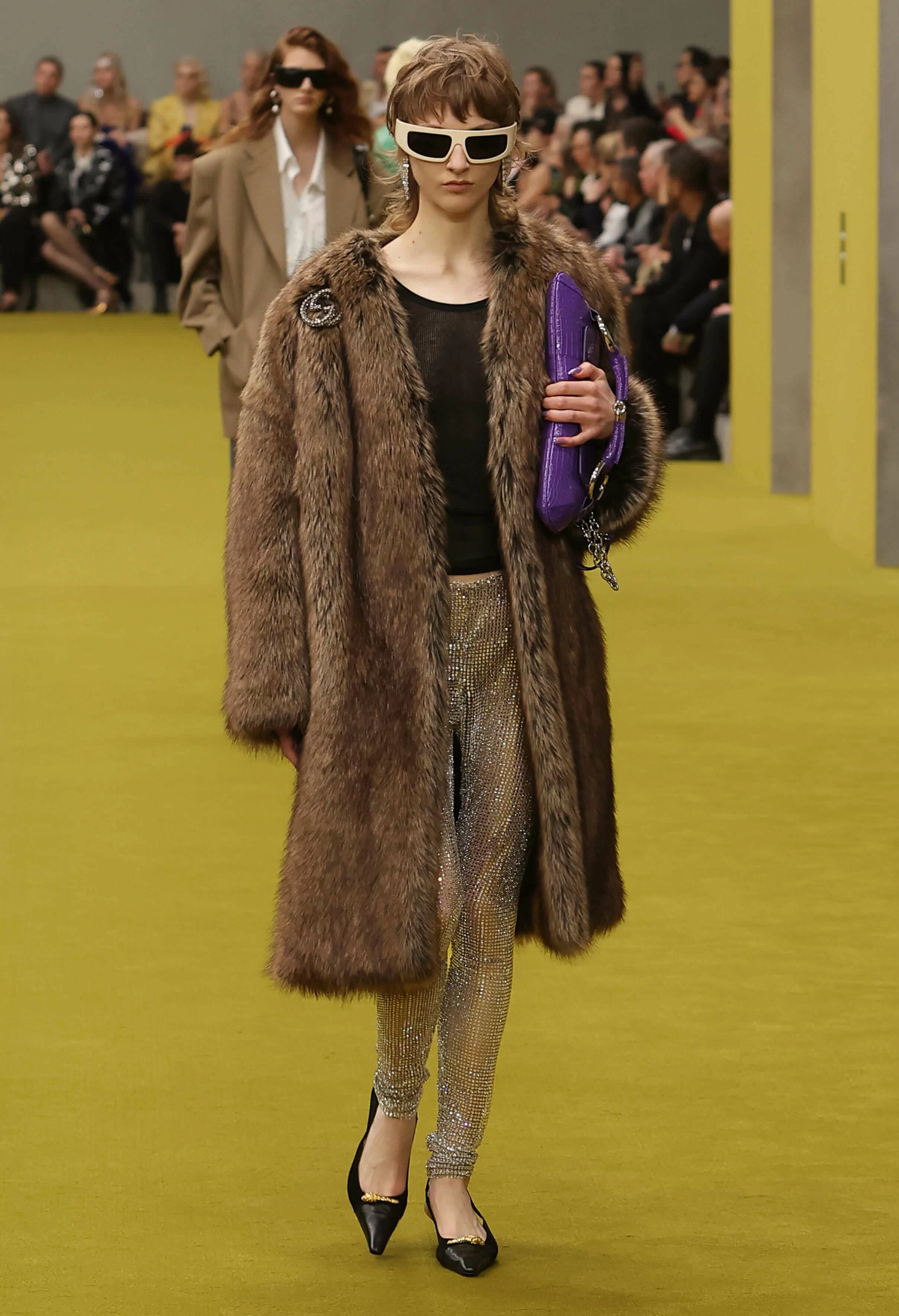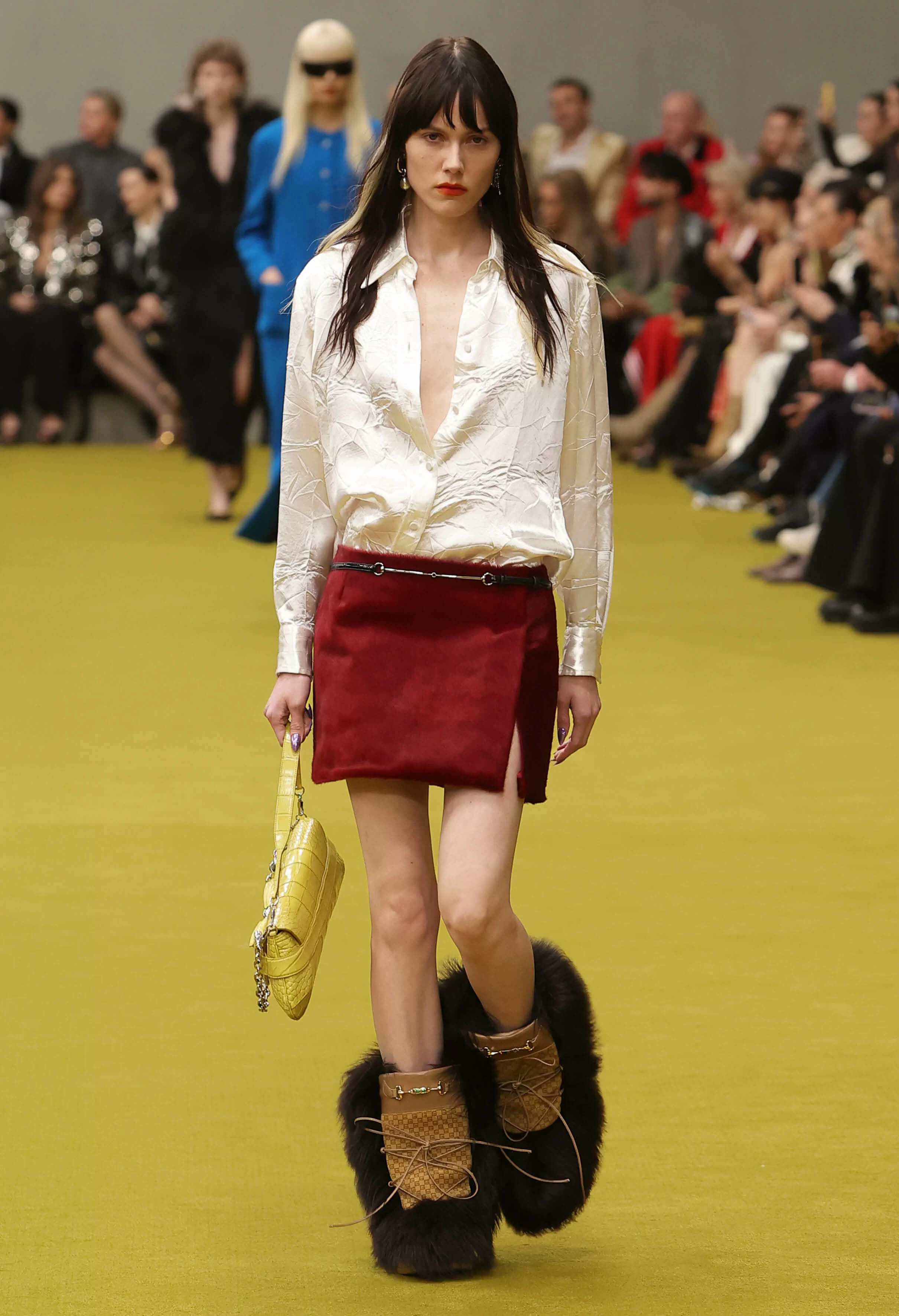 品牌圓邊梯形飾鍊手袋綴有馬銜扣,並以厚墊、羊絨皮、水晶及對比色皮革重塑。1960 年代滑雪系列原創的雪地靴則以羊毛和 GG 帆布重現,配搭馬銜扣。方頭涼鞋、寬筒靴和靈感源自 DIONYSUS 手袋的虎頭綴飾涼鞋均採用 KITTEN HEELS 小貓踭。