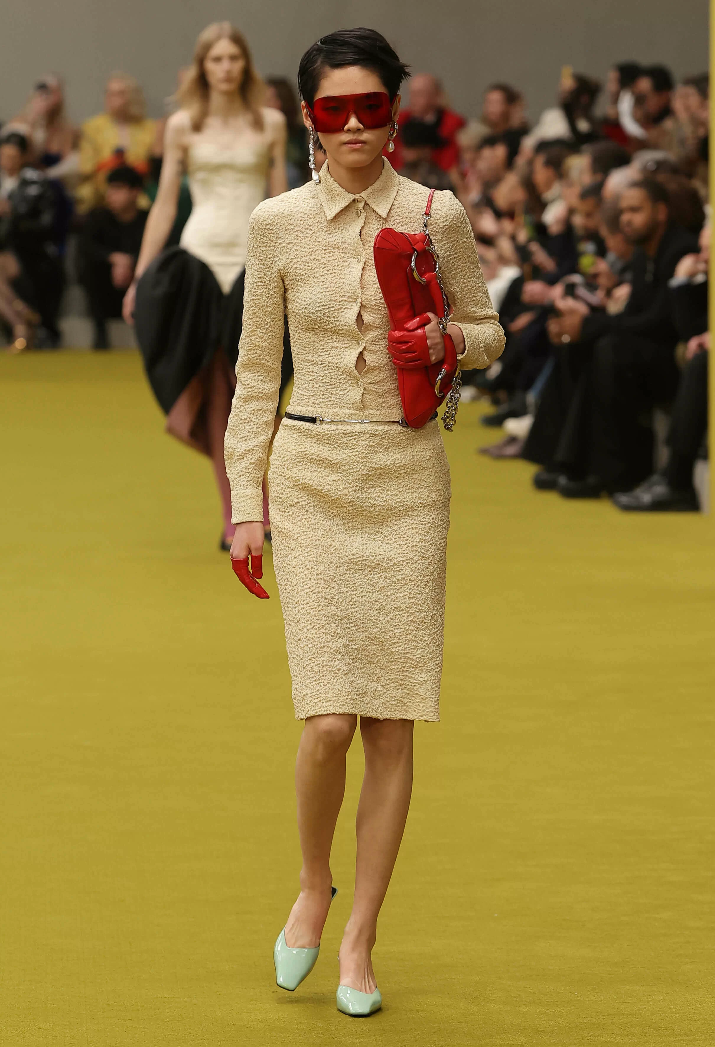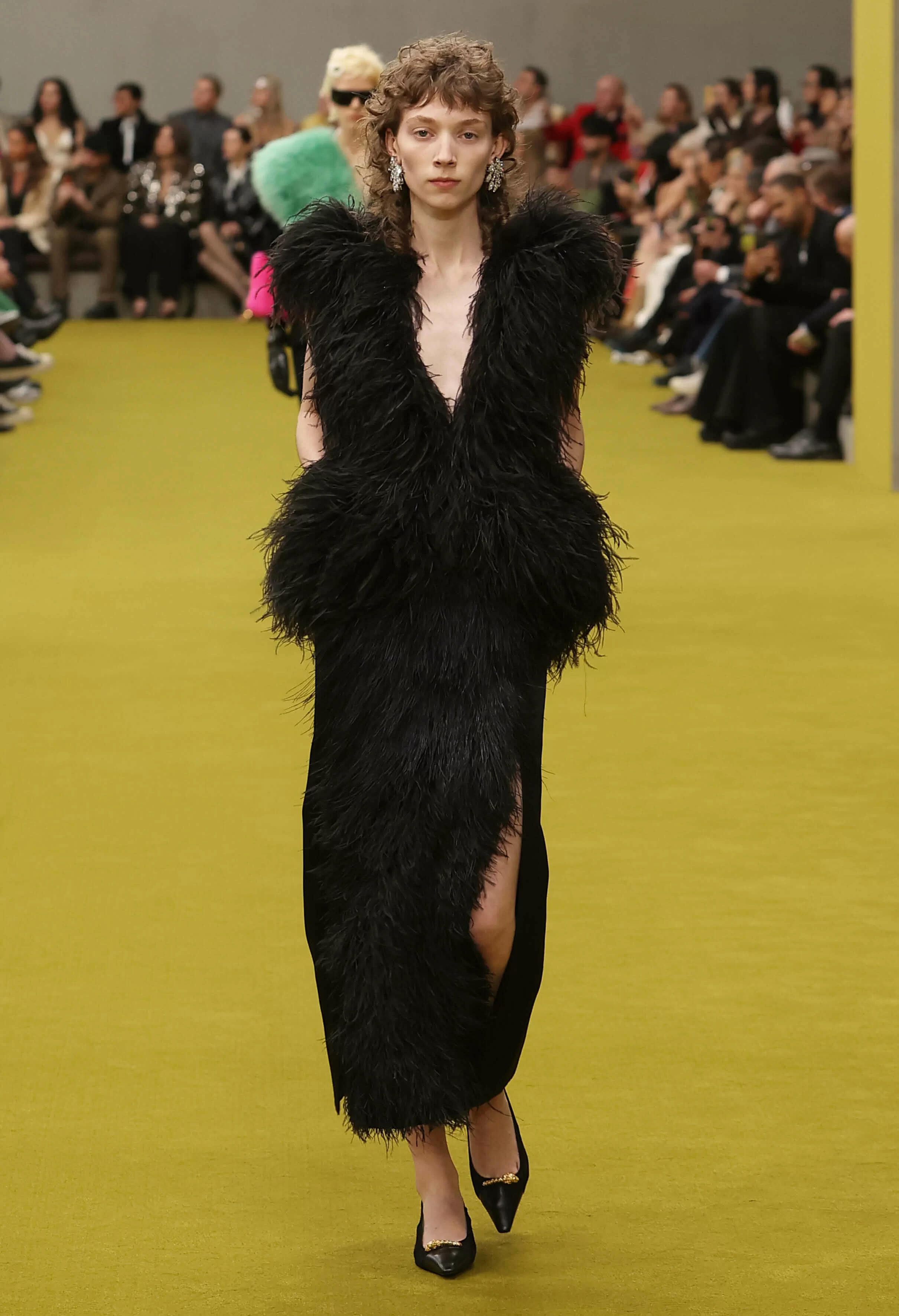拉絨馬海羊毛和環紗織成的寬鬆針織衫質感豐富,羊絨皮或人造皮縫製的大褸和翻領染上繽紛色彩,進一步昇華感官體驗。晚裝運用精湛工藝巧製,無論是雙層公主緞緊身連身裙的低腰裙身,抑或洋溢活力的全幅對比色羽毛刺繡連身裙或 EMPIRE 晚裝的胸線,均有教人聯想到品牌經典符號的心形設計。