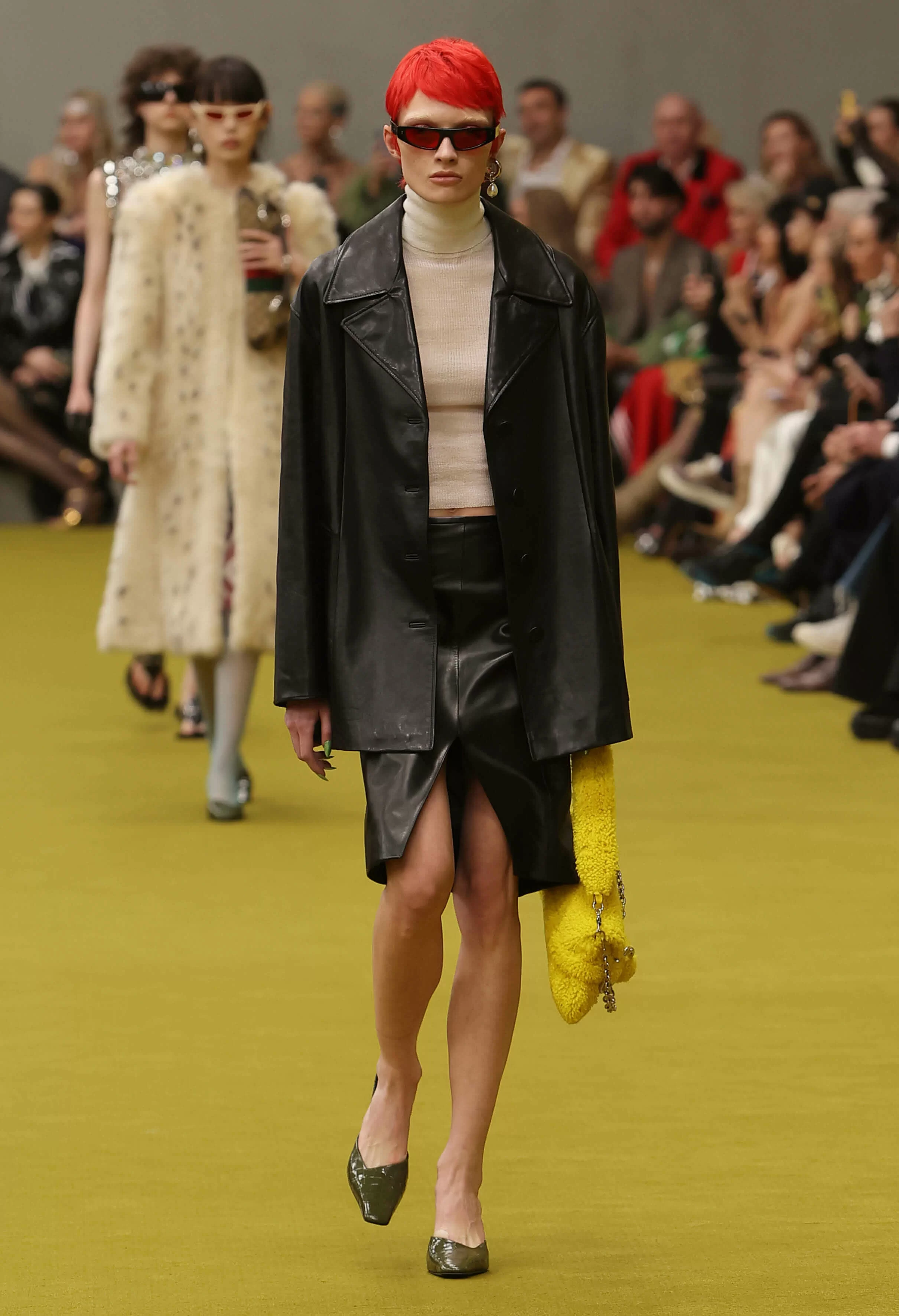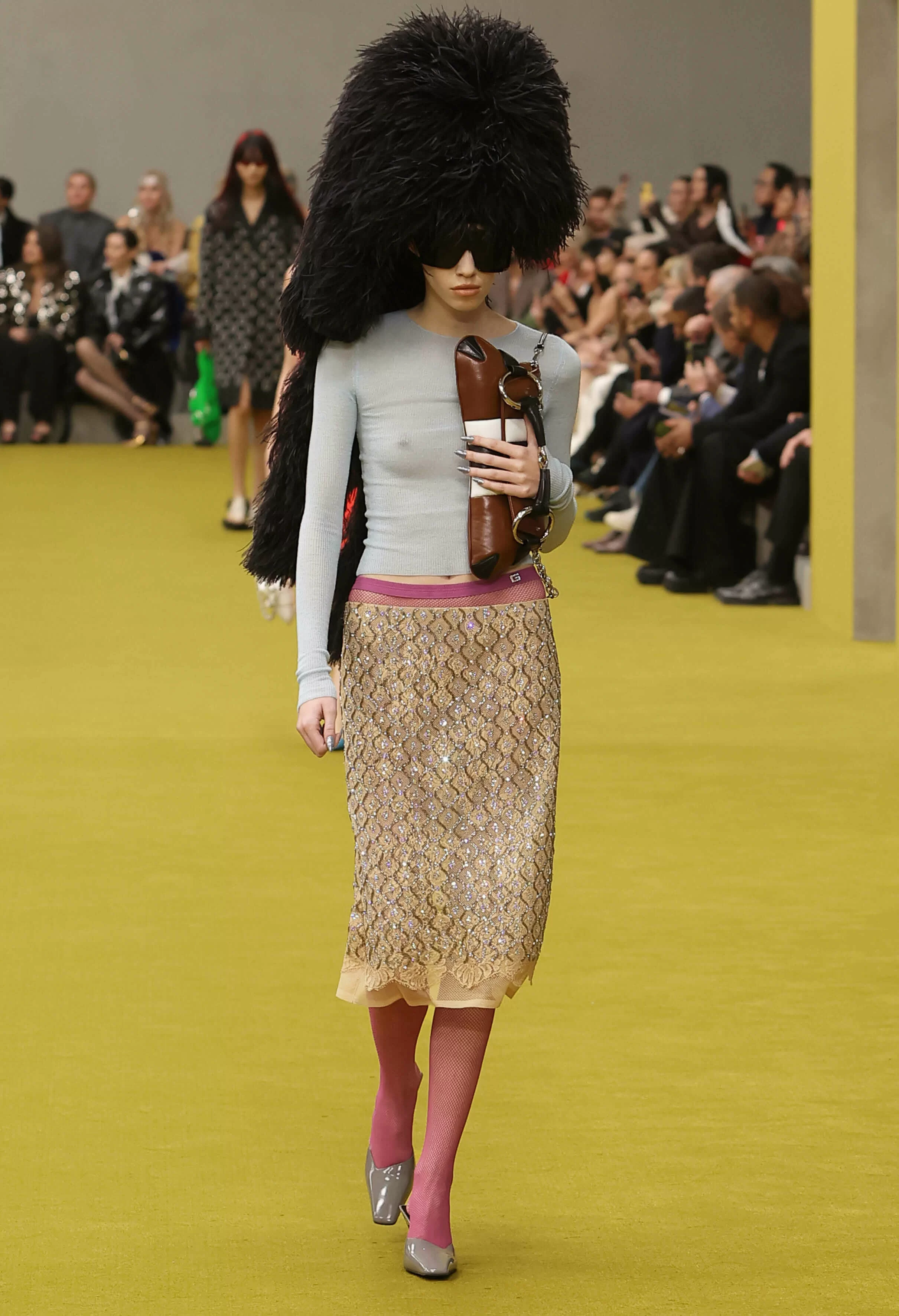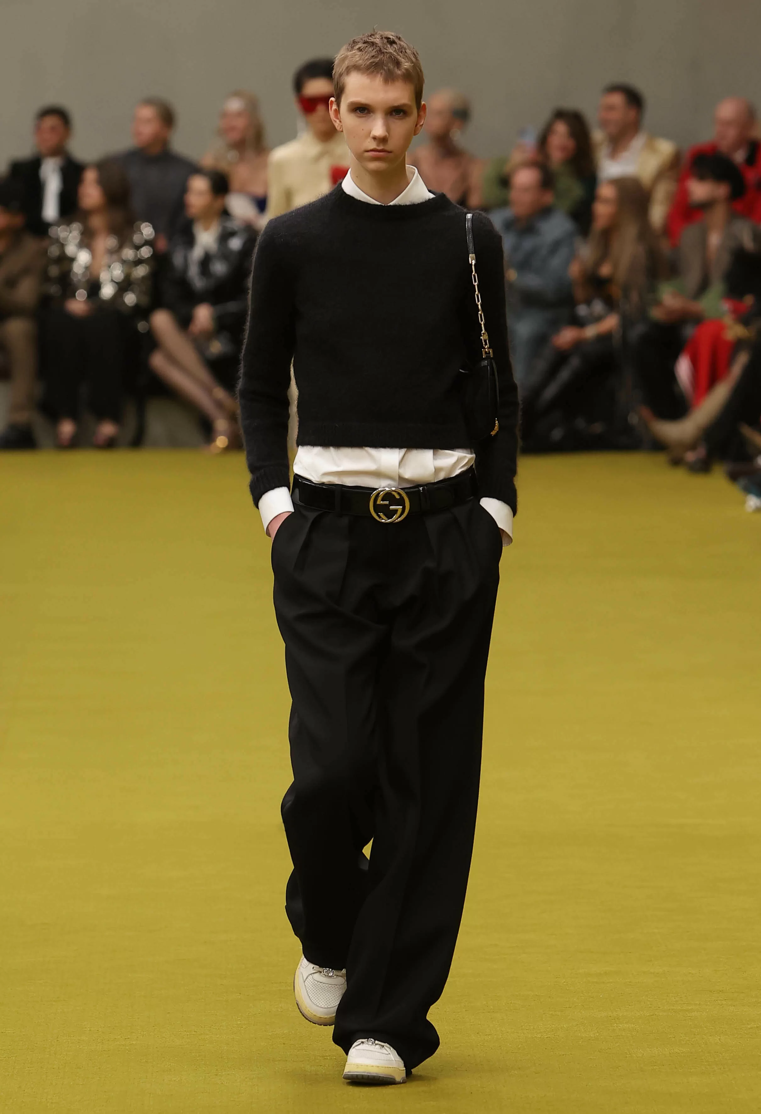 一起穿梭於時間,看着眼前上演1990S、2010S以至今天的 GUCCI。2010 年代攝人奢華的色調遇上1990 和 2000 年代初以情色元素迷惑人心的設計語言,大玩熟悉的復古感。西裝剪裁寬鬆,恤衫、兩件式上衣和半截裙卻看似縮細。羊毛或皮革西裝裁剪成寬大輪廓,配以富層次感的肩部、低領口和低腰褲。半截裙推出長款或及膝款式,以透薄面料縫製,綴以教人聯想到內衣的蕾絲。鑲嵌水晶的 GG 金屬胸圍既呼應前者,亦為浮誇華麗的雞尾酒會珠寶定調,垂墜在領口和胸前的首飾營造傾瀉至地面的矚目景致。