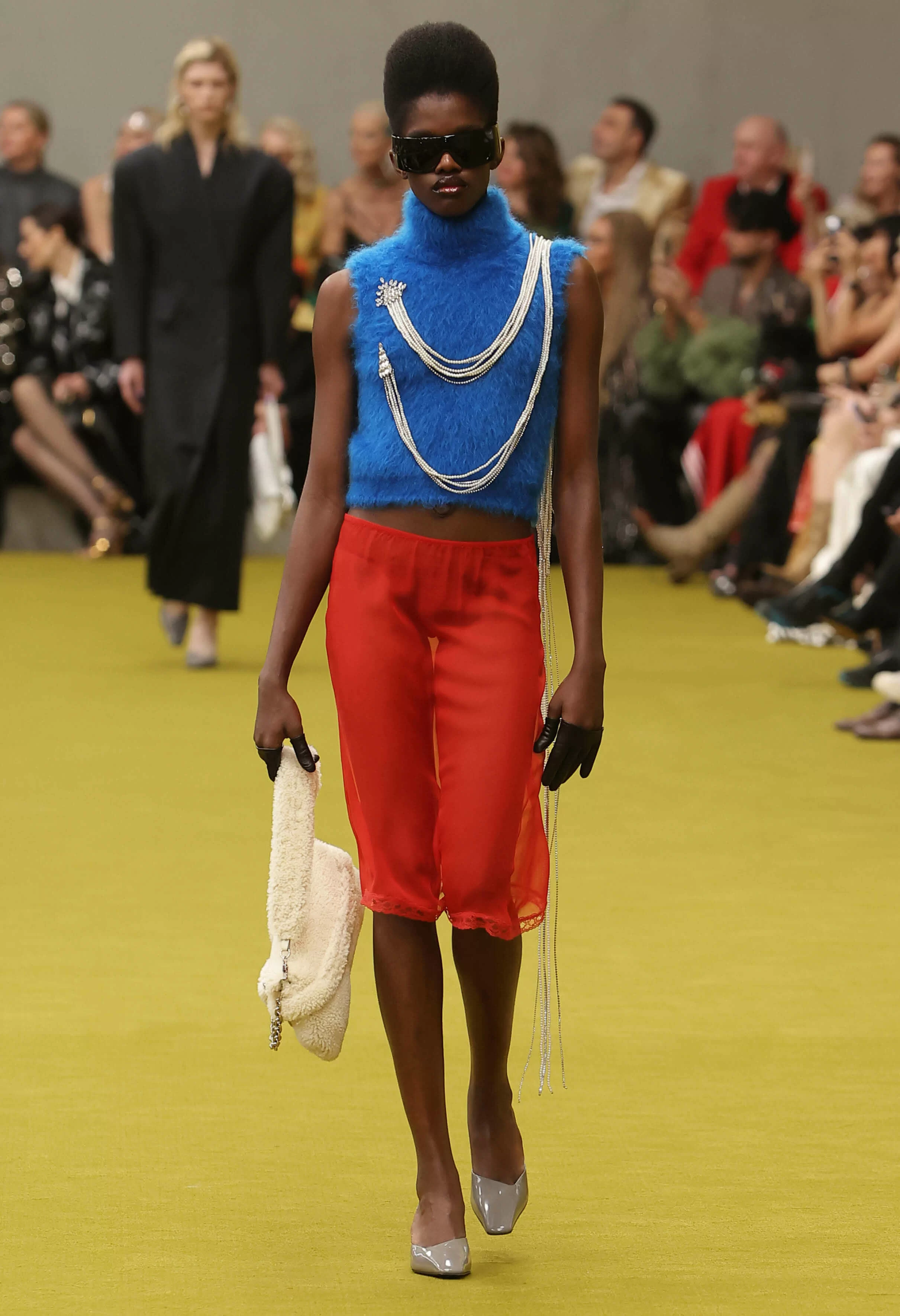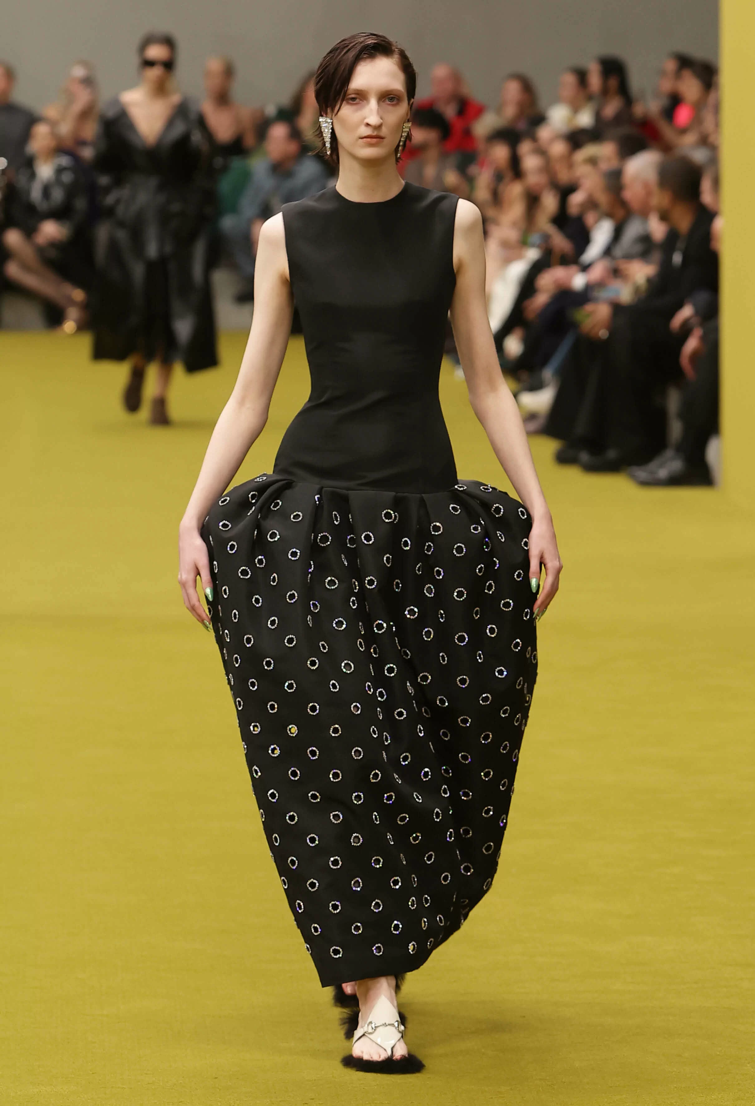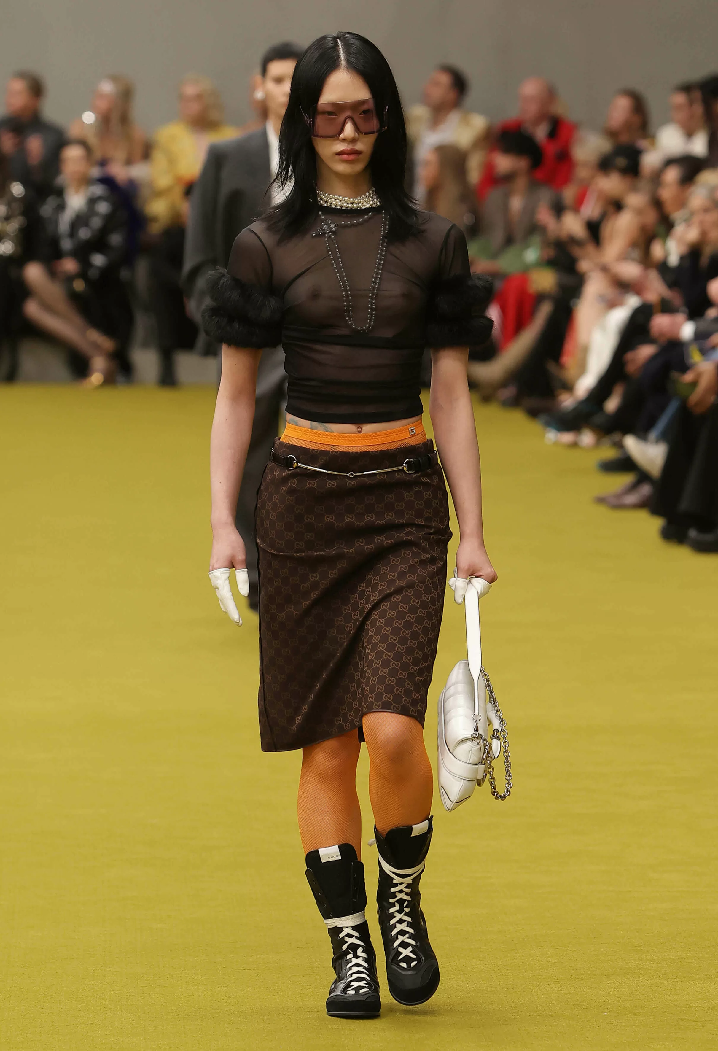 一起穿梭於時間,看着眼前上演1990S、2010S以至今天的 GUCCI。2010 年代攝人奢華的色調遇上1990 和 2000 年代初以情色元素迷惑人心的設計語言,大玩熟悉的復古感。西裝剪裁寬鬆,恤衫、兩件式上衣和半截裙卻看似縮細。羊毛或皮革西裝裁剪成寬大輪廓,配以富層次感的肩部、低領口和低腰褲。半截裙推出長款或及膝款式,以透薄面料縫製,綴以教人聯想到內衣的蕾絲。鑲嵌水晶的 GG 金屬胸圍既呼應前者,亦為浮誇華麗的雞尾酒會珠寶定調,垂墜在領口和胸前的首飾營造傾瀉至地面的矚目景致。
