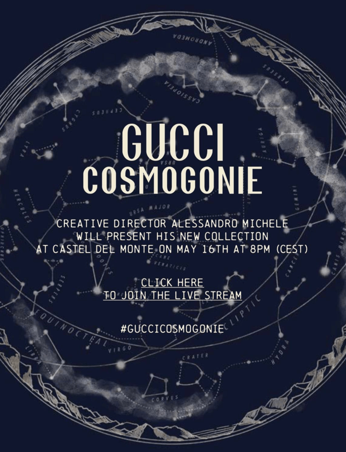 GUCCI COSMOGONIE 系列時裝騷將於香港時間 5 月 17 凌晨 2:00 舉行,MING’S 為你實時直播,敬請鎖定時間觀賞。