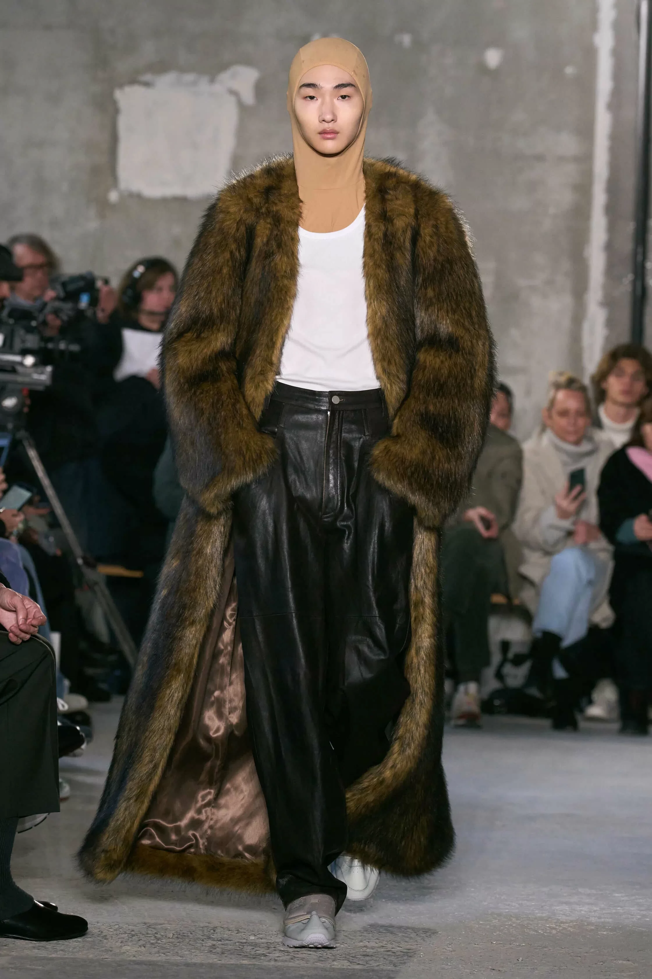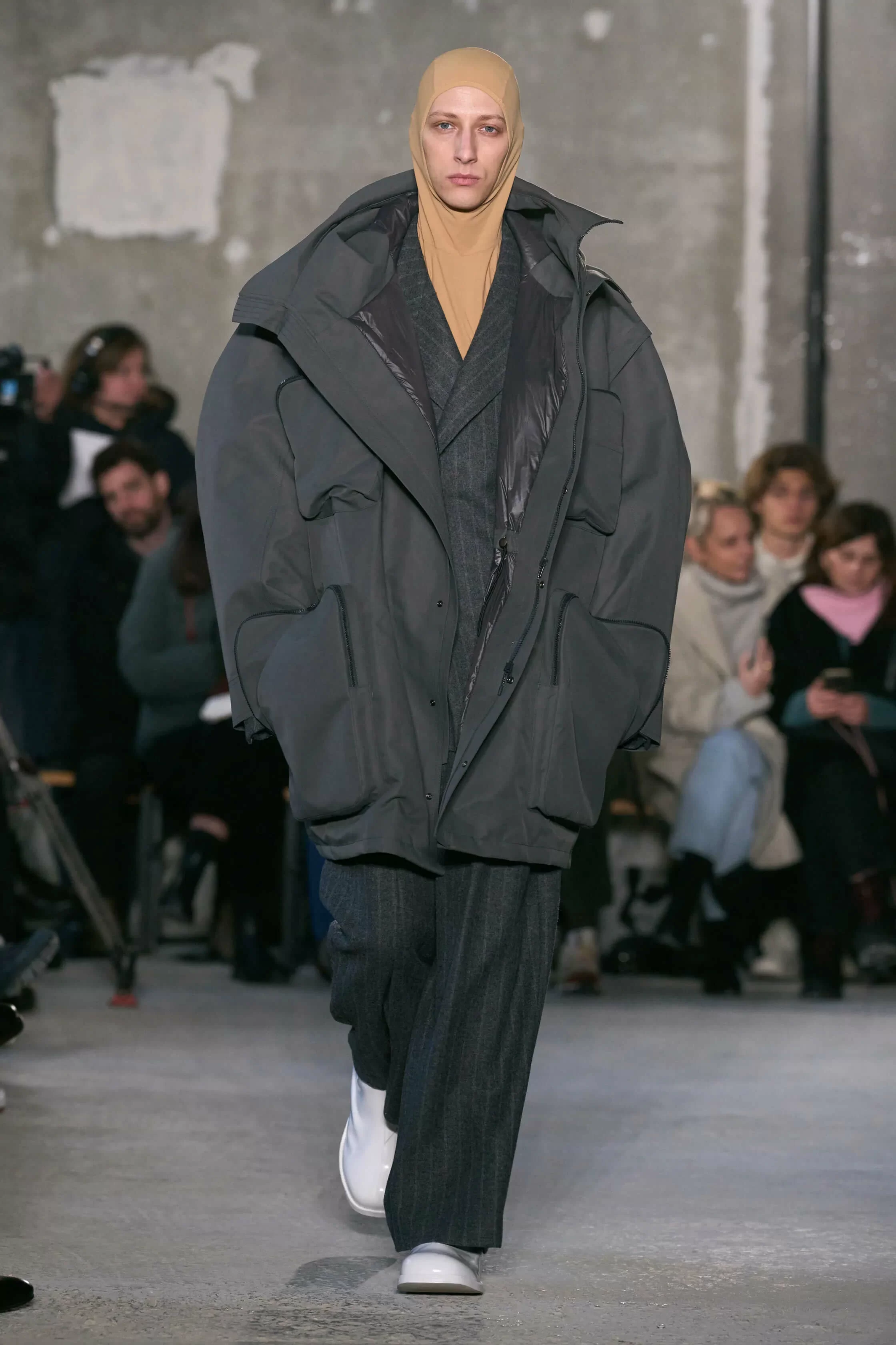 少年時因從事西裝店裁縫工作關係,HED MAYNER 充分顯示他對西裝的知識。他以輪廓貼身和縮細的西裝造型作為開場。這是與以往的「超大號」設計大有不同,沒有多餘線條,但展現了女性化的元素。此外,秀場上一套面翻領燕尾服夾克亦成亮點,搭配寛鬆七分褲和超大號鞋子,帶出飄逸的擺動和奢華感。