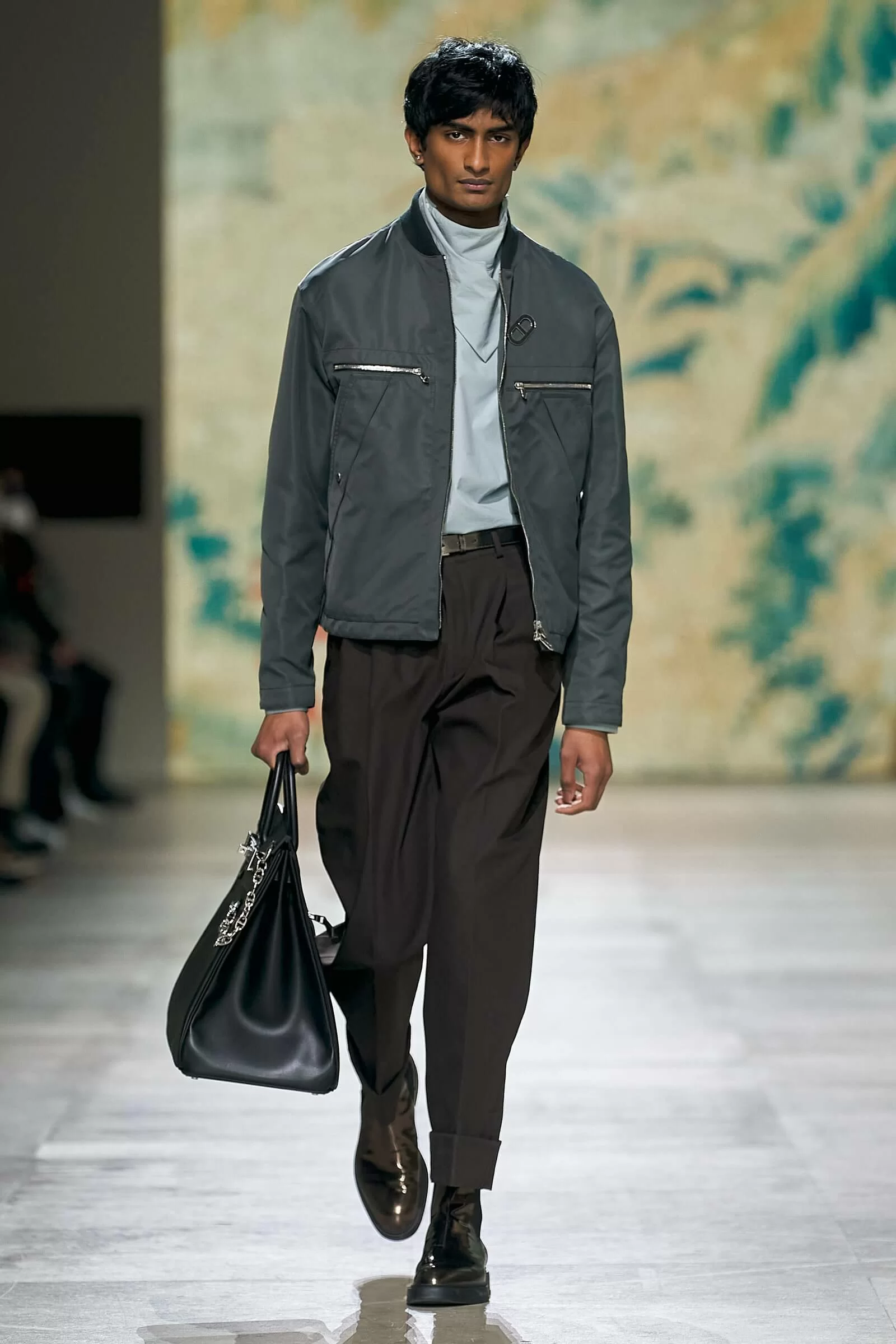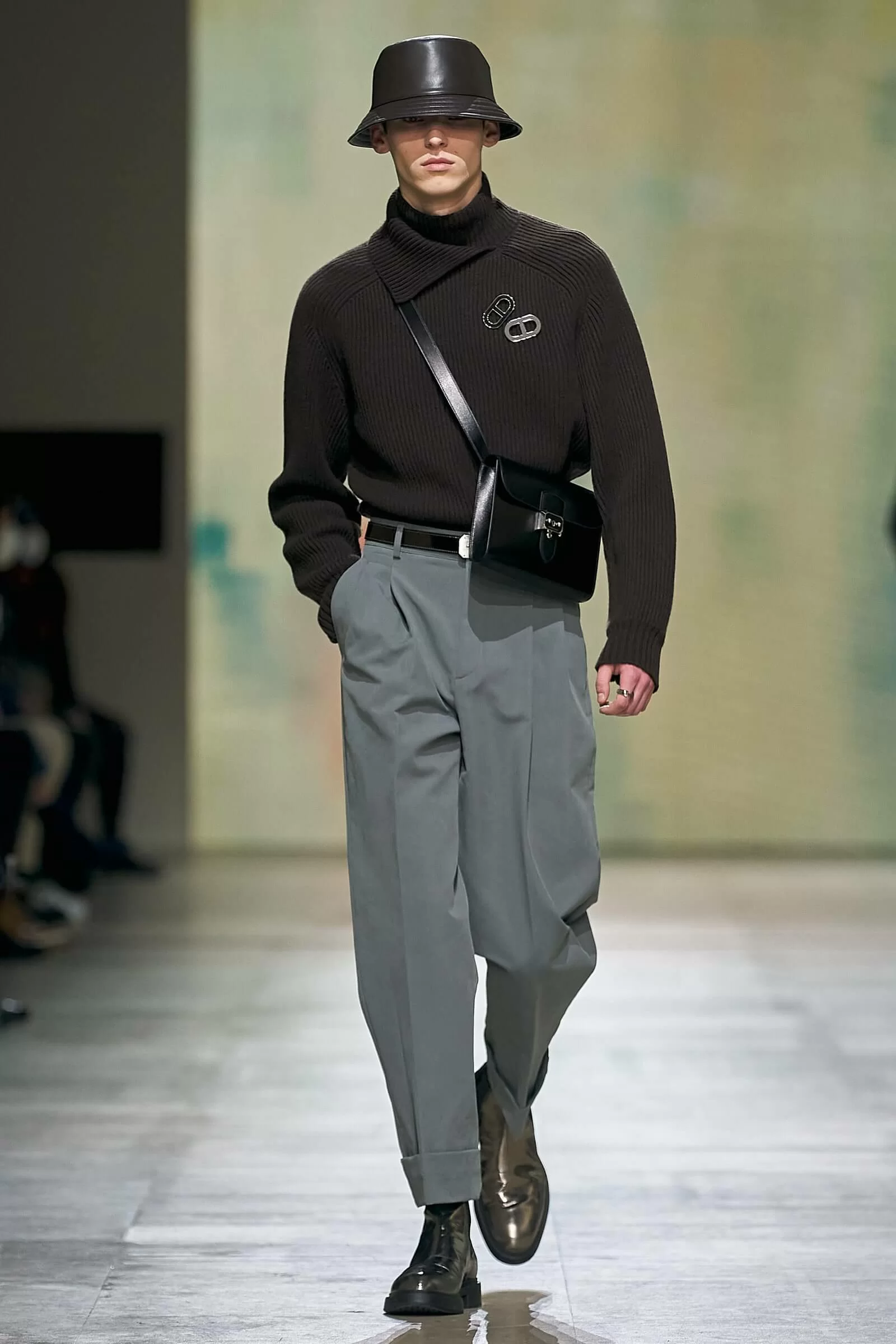 從自然而溫和的灰銅、霧藍、灰白,到色調醒目的亮橙、鮮綠、薑黃。 HERMÈS 傳統的法蘭絨西裝搭配粉紅色的絲綢圍巾;羊毛反領大衣中亮出鮮綠色恤衫內搭……皮革、羊絨、牛仔布、羊毛、絲綢,各種物料的互相調和與結合,材質變化極具誘惑魅力,難怪被稱充滿「DANDY」氣質,乍看簡約的設計中都別具匠心。另外,HERMÈS 袋款方面為經典 HAUT À COURROIES 袋款注入叛逆精神,以拉鏈、多口袋設計加強了機能感;SAC À DÉPÊCHES MESSENGER BOX 手袋亦以更輕鬆休閒的面貌示人。