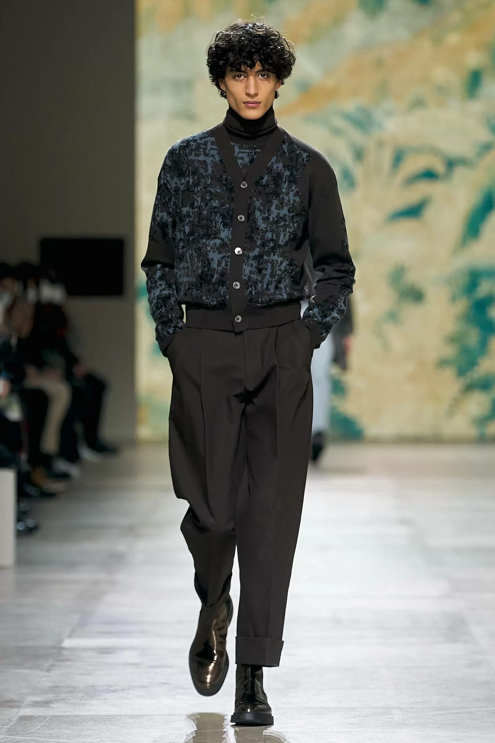 今次 HERMÈS 借用了巴黎法國國家家具管理館收藏的古董掛毯,設計師 VÉRONIQUE NICHANIAN攜手導演 CYRIL TESTE,將掛毯的圖紋投射至牆面螢幕,模特兒穿梭在走廊,而掛毯的映像亦隨時間流逝而變化,與服飾互相揮映。