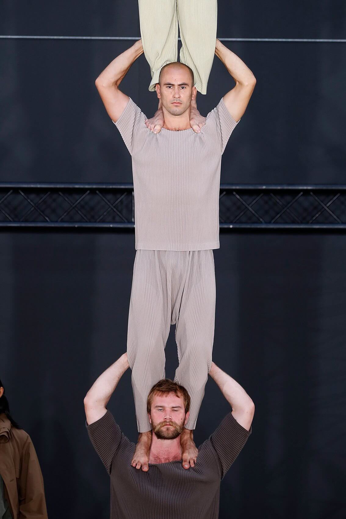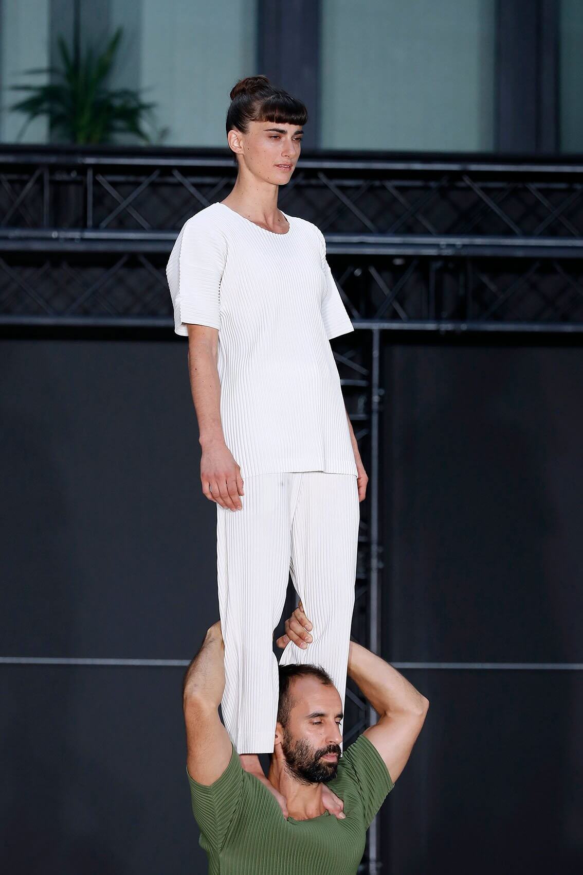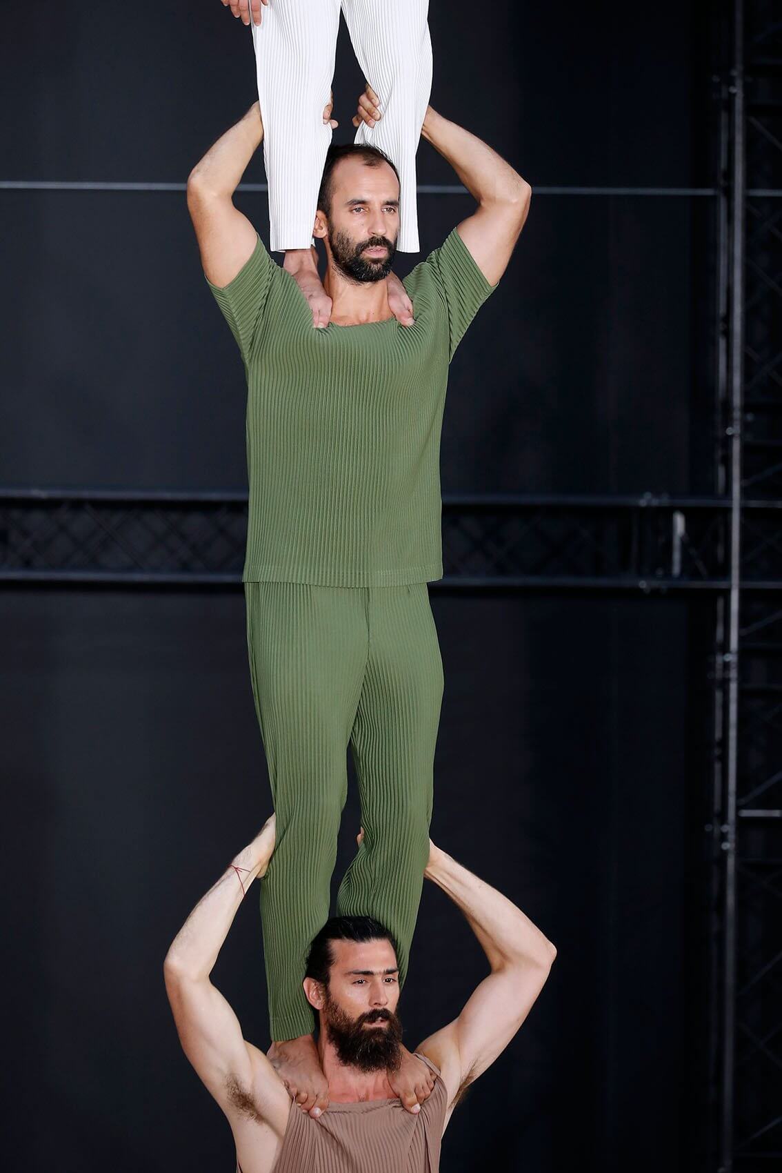 今次 HOMME PLISSÉ 回歸巴黎實體秀果然沒有令人失望,繼續以藝術表演呈現服裝的方式,由 THÉ TRE NATIONAL DE CHAILLOT 的 RACHID OURAMDANE 編舞,帶來混合體操元素的精湛當代舞蹈演出。舞者穿上最新一季的衣服,從高處攀爬現身,或踏上彼此的肩膀像層層疊、或把彼此投放到空中再狠狠接下、或集體奔跑追逐如躲貓貓是一樣藝術。各種狀態下的衣服仍然無損如新,配合著人體所需的各個情況,展示實用和功能性,給人自由自在做各種事情的空間。