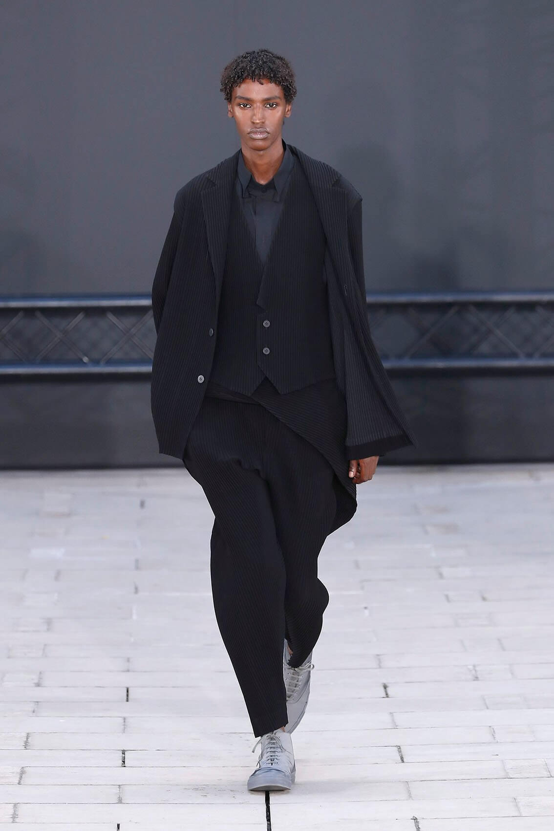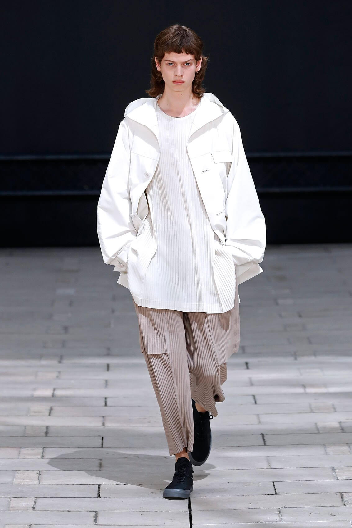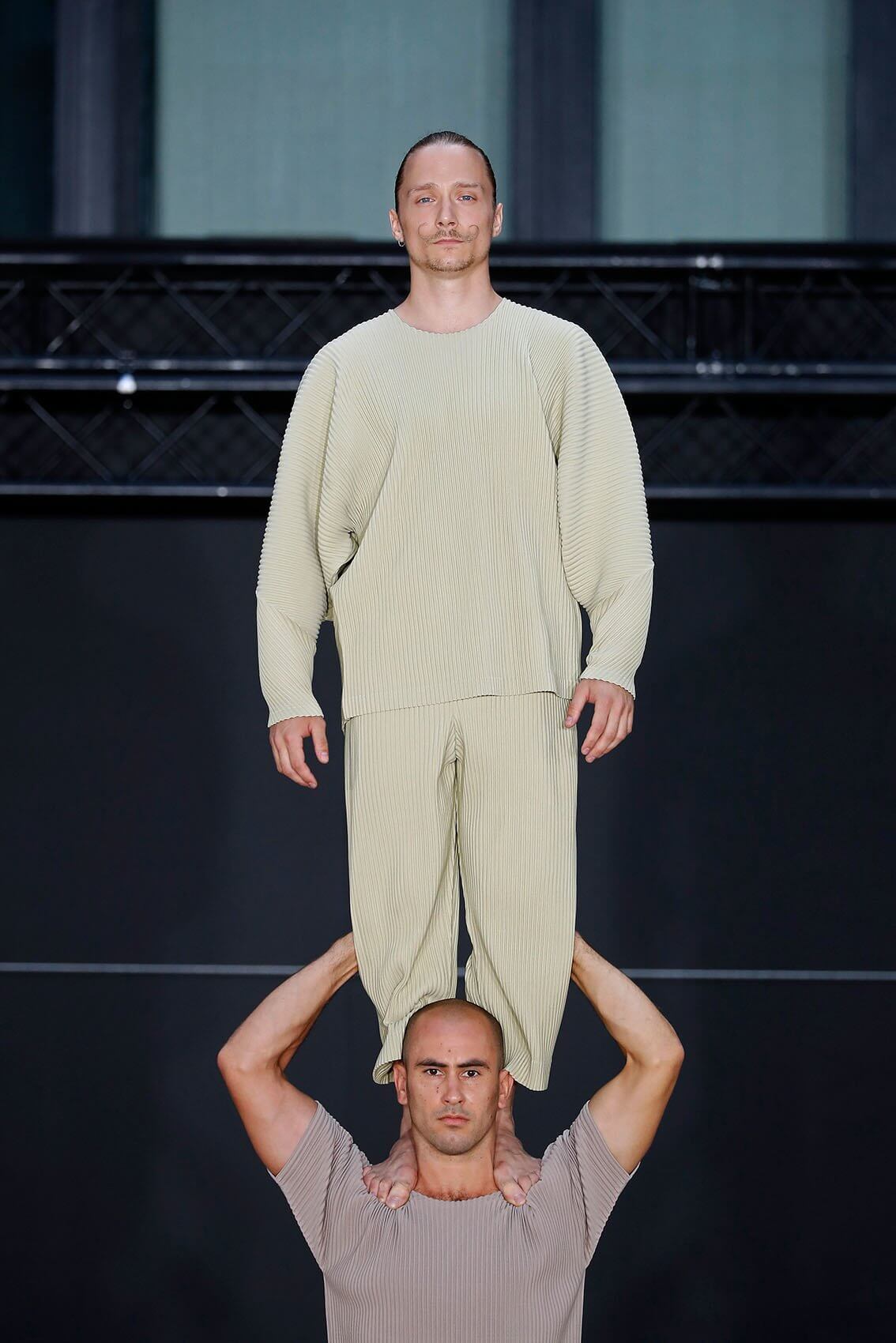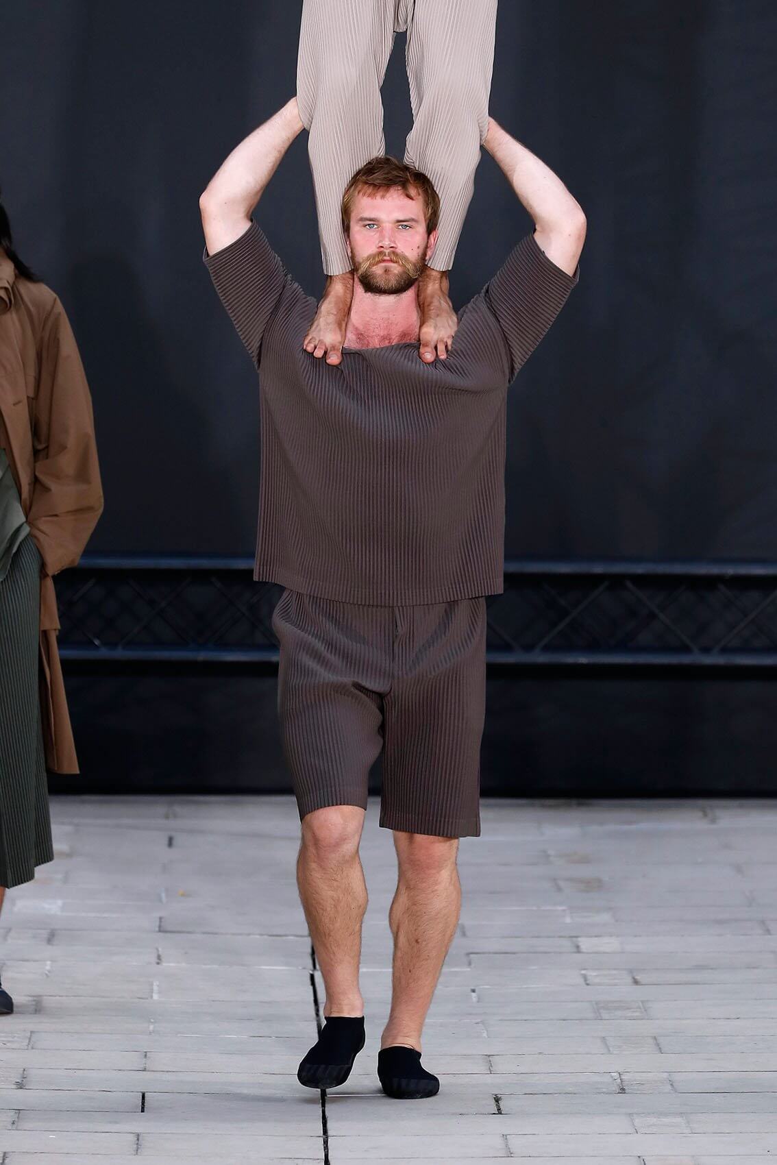 今次 HOMME PLISSÉ 回歸巴黎實體秀果然沒有令人失望,繼續以藝術表演呈現服裝的方式,由 THÉ TRE NATIONAL DE CHAILLOT 的 RACHID OURAMDANE 編舞,帶來混合體操元素的精湛當代舞蹈演出。舞者穿上最新一季的衣服,從高處攀爬現身,或踏上彼此的肩膀像層層疊、或把彼此投放到空中再狠狠接下、或集體奔跑追逐如躲貓貓是一樣藝術。各種狀態下的衣服仍然無損如新,配合著人體所需的各個情況,展示實用和功能性,給人自由自在做各種事情的空間。