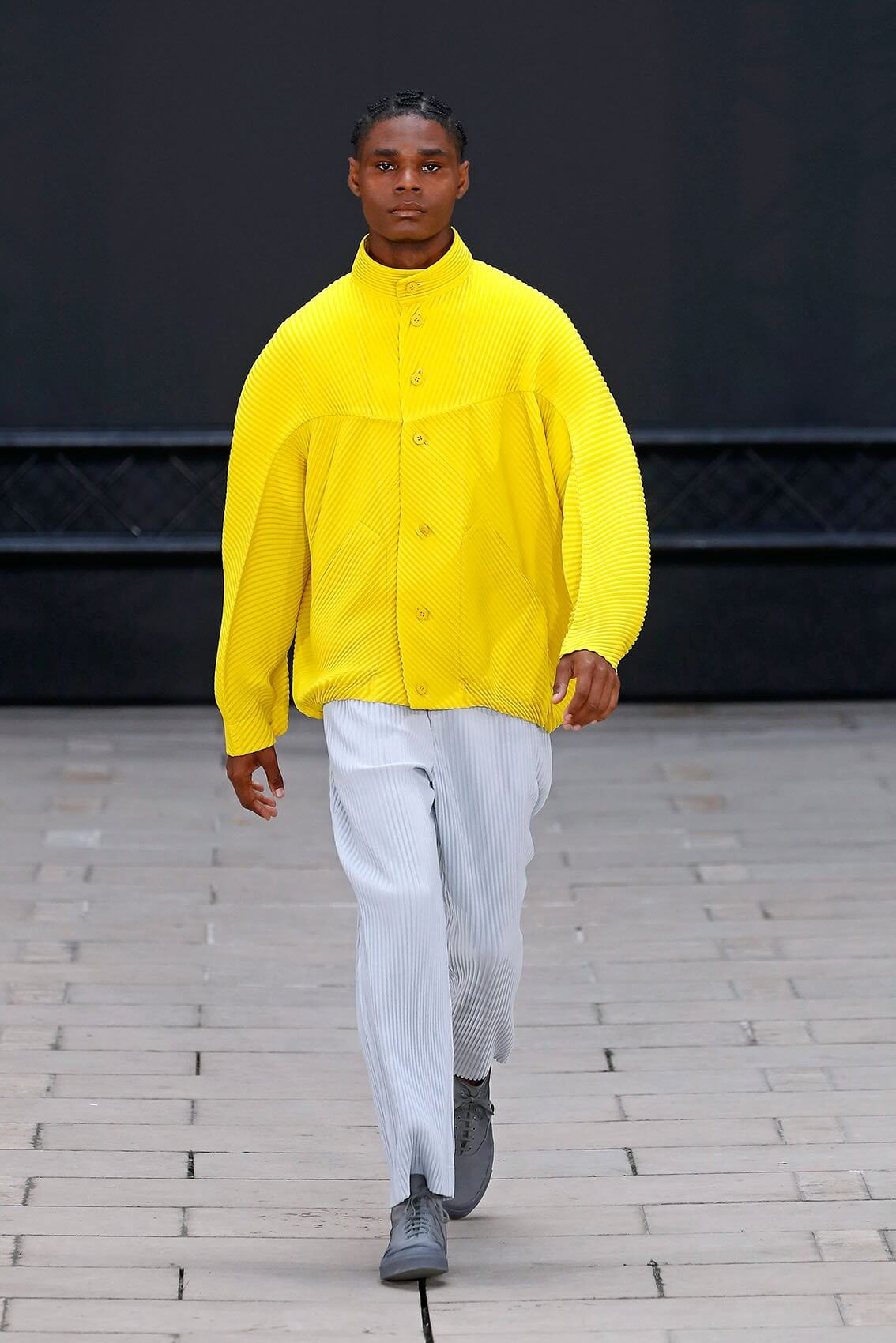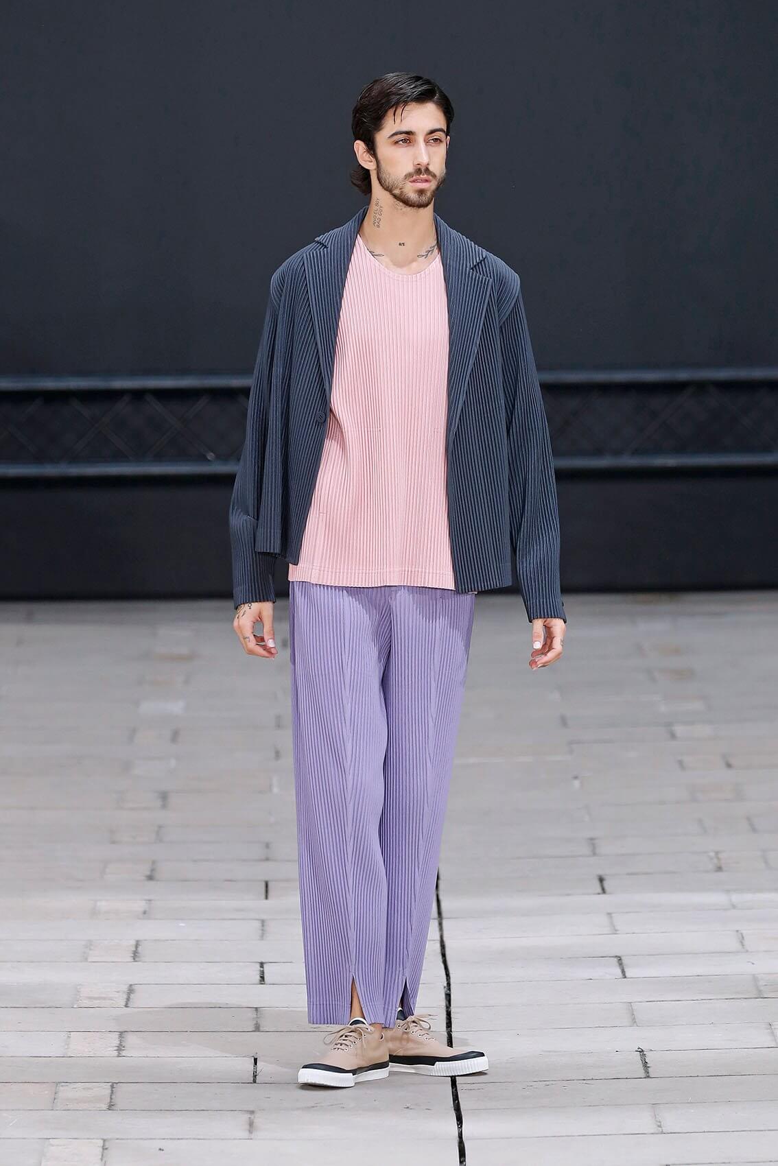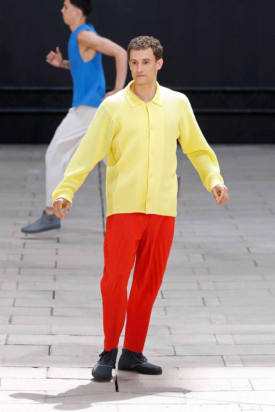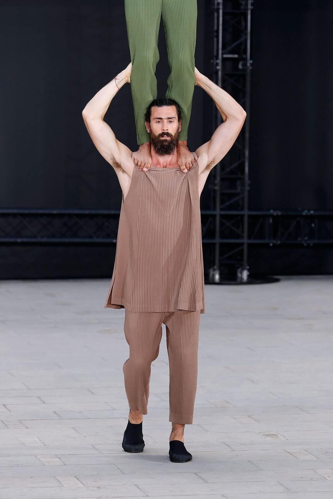 HOMME PLISSÉ ISSEY MIYAKE 在將近三年後實體回歸巴黎時裝周,藝術總監 SATOSHI KONDO 繼續融合表演藝術和時裝秀,今次與 THÉ TRE NATIONAL DE CHAILLOT 合作,用雜技形式呈現系列服裝,以花朵和花瓶為主題,標誌性的皺褶布料營造立體感,仍然自由配合所有的人體動態。