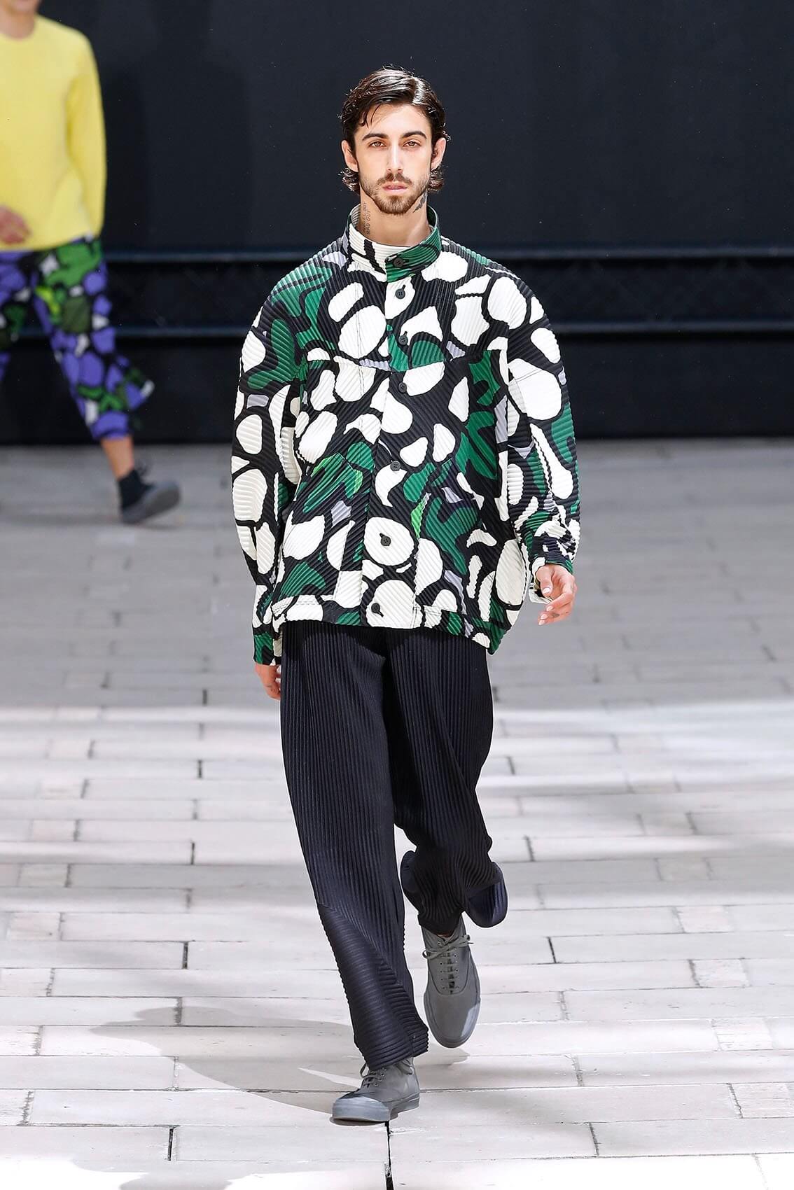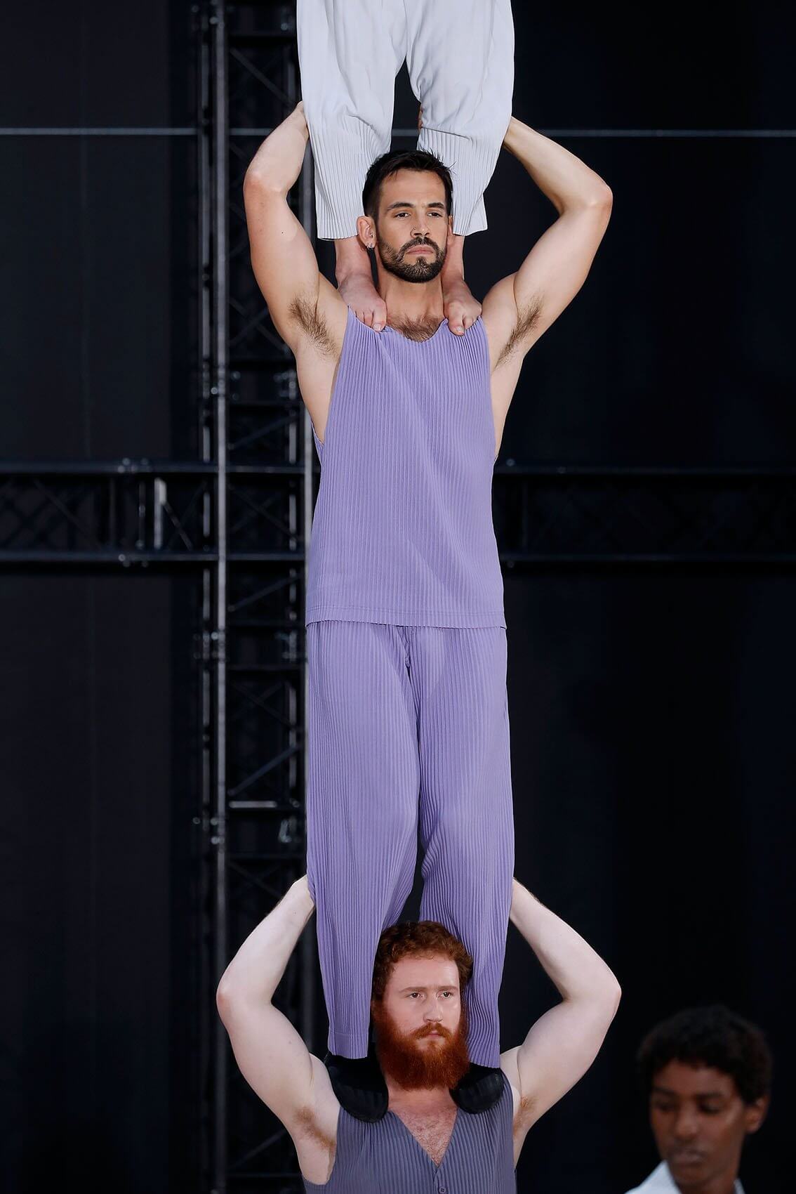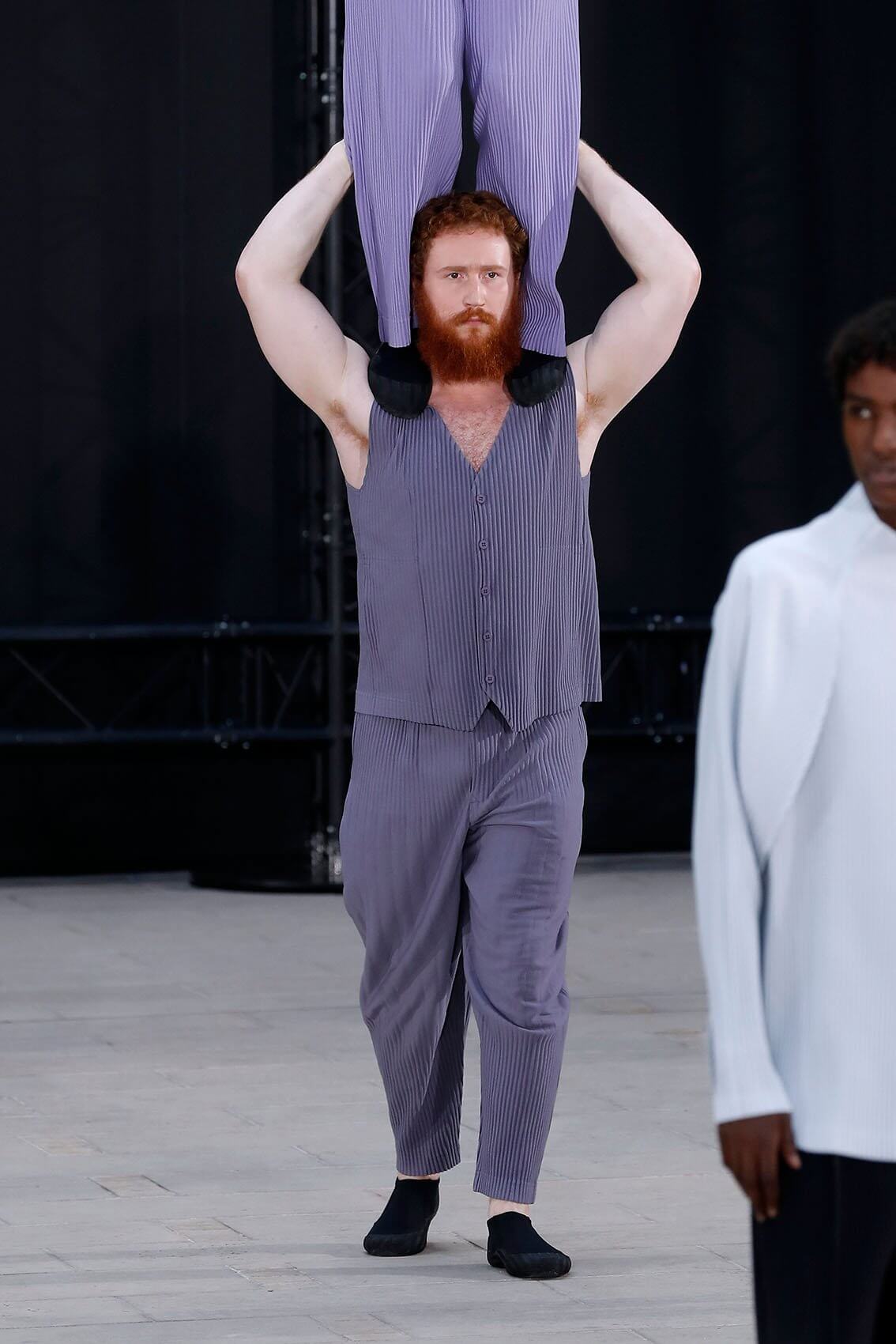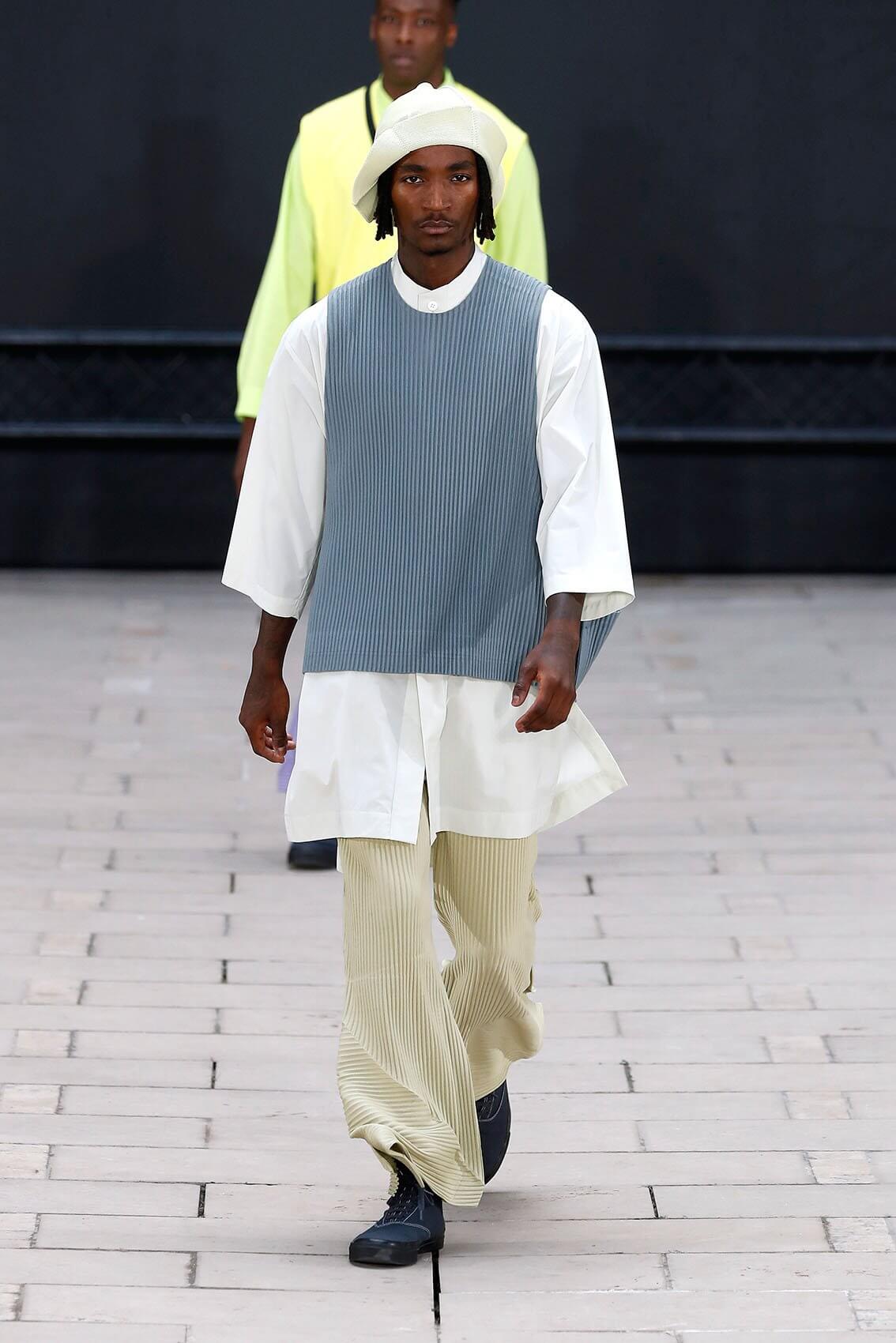 HOMME PLISSÉ ISSEY MIYAKE 在將近三年後實體回歸巴黎時裝周,藝術總監 SATOSHI KONDO 繼續融合表演藝術和時裝秀,今次與 THÉ TRE NATIONAL DE CHAILLOT 合作,用雜技形式呈現系列服裝,以花朵和花瓶為主題,標誌性的皺褶布料營造立體感,仍然自由配合所有的人體動態。