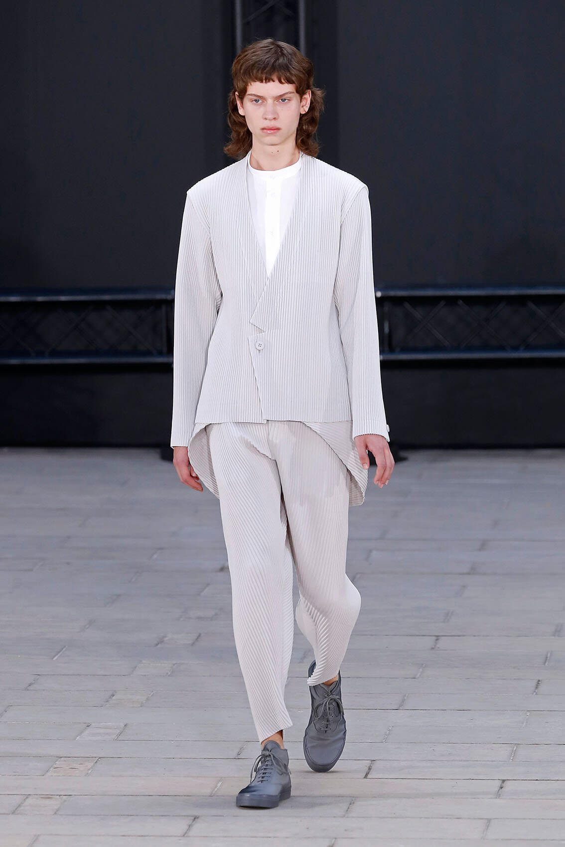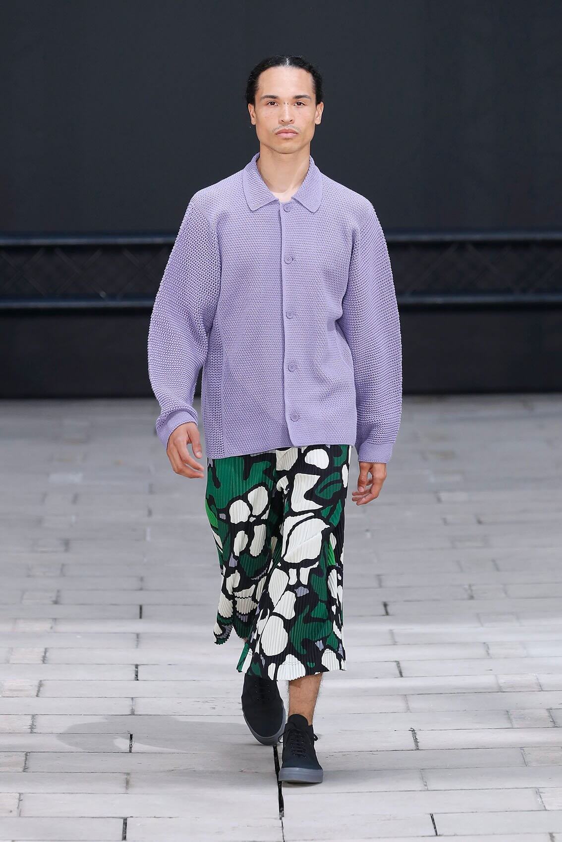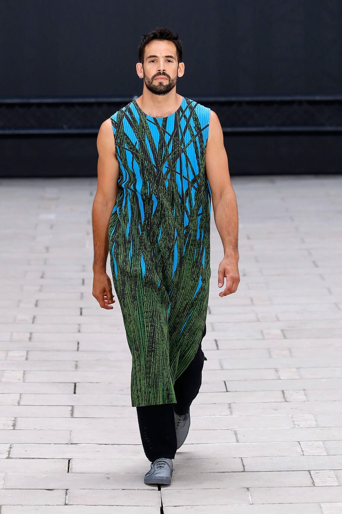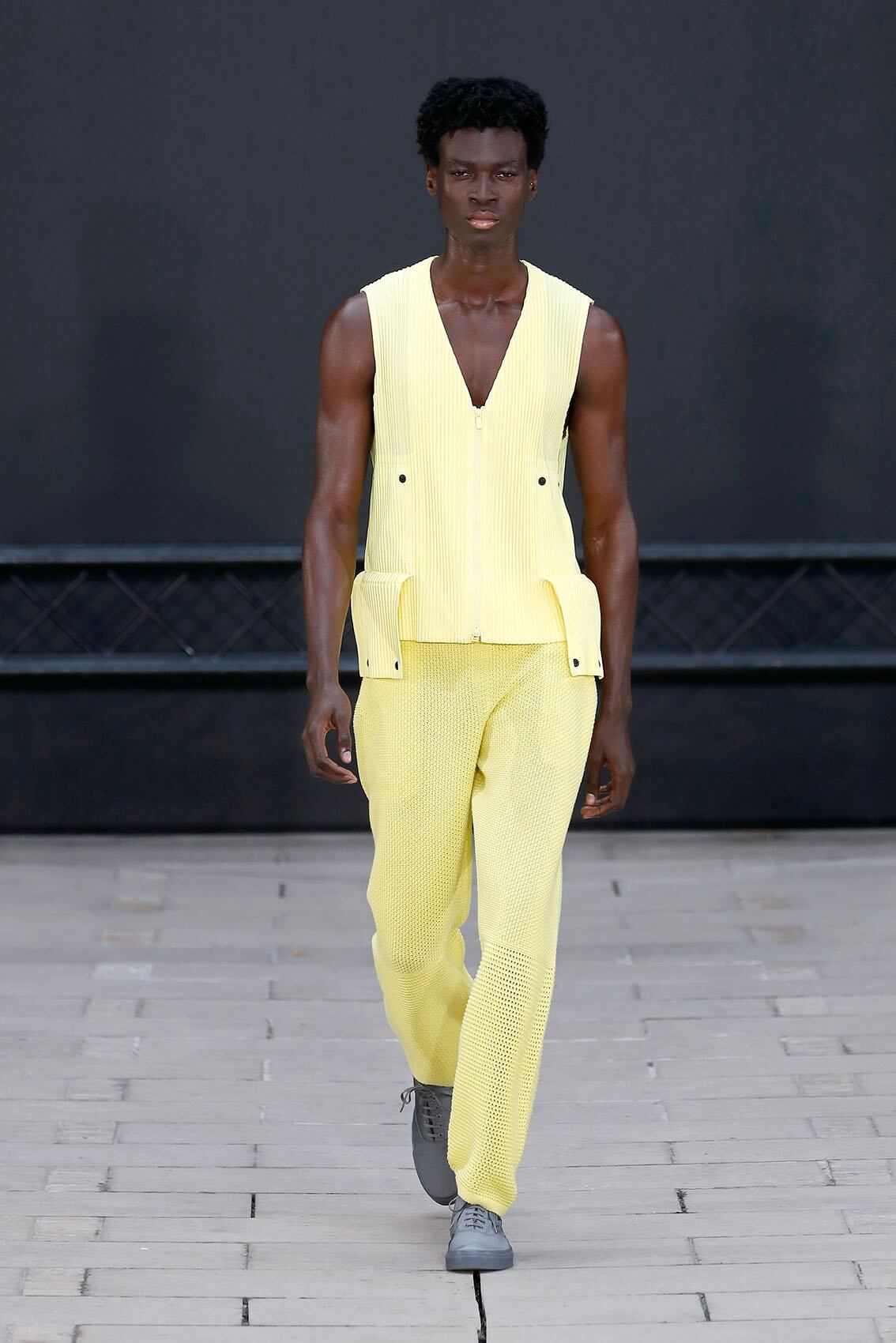 HOMME PLISSÉ ISSEY MIYAKE 在將近三年後實體回歸巴黎時裝周,藝術總監 SATOSHI KONDO 繼續融合表演藝術和時裝秀,今次與 THÉ TRE NATIONAL DE CHAILLOT 合作,用雜技形式呈現系列服裝,以花朵和花瓶為主題,標誌性的皺褶布料營造立體感,仍然自由配合所有的人體動態。