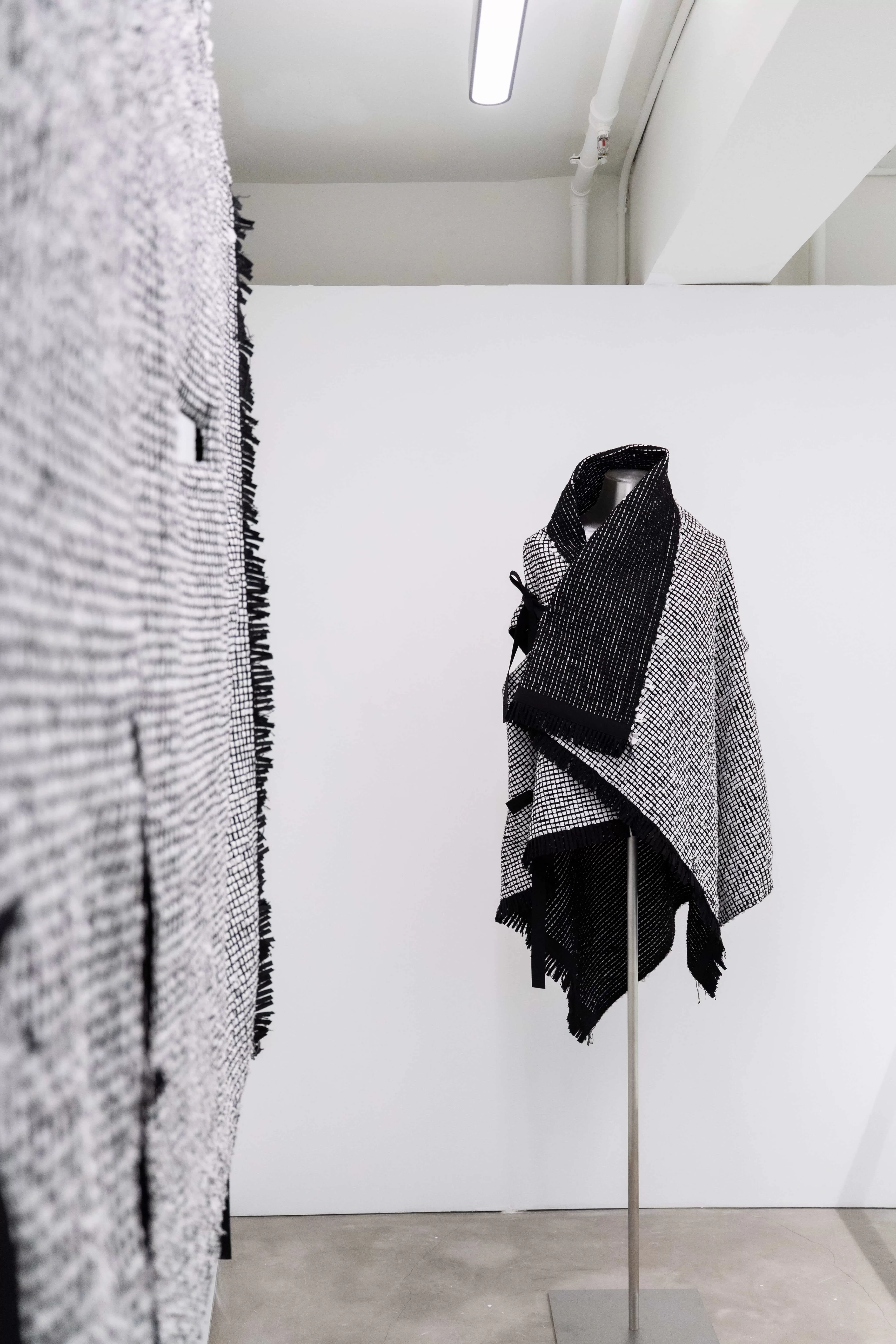 Sakiori 指的是日本傳統的再生織布技術,將撕裂成條的舊布料重新編織成新布料。為了善用現有的布料,本系列將這一技術加以演變,運用品牌自創立以來標誌性系列 FLAT 中的部分植物基聚酯面料,將布料對角剪成條狀,並將其同時用於經線與緯線的編織。織物表面的多變質地帶有自然的流蘇細節,由於手工製作的工藝,每件作品皆為獨一無二。背心款式的穿法極具靈活性,將手臂穿過開口,並像圍巾般將布料包裹於身體。
