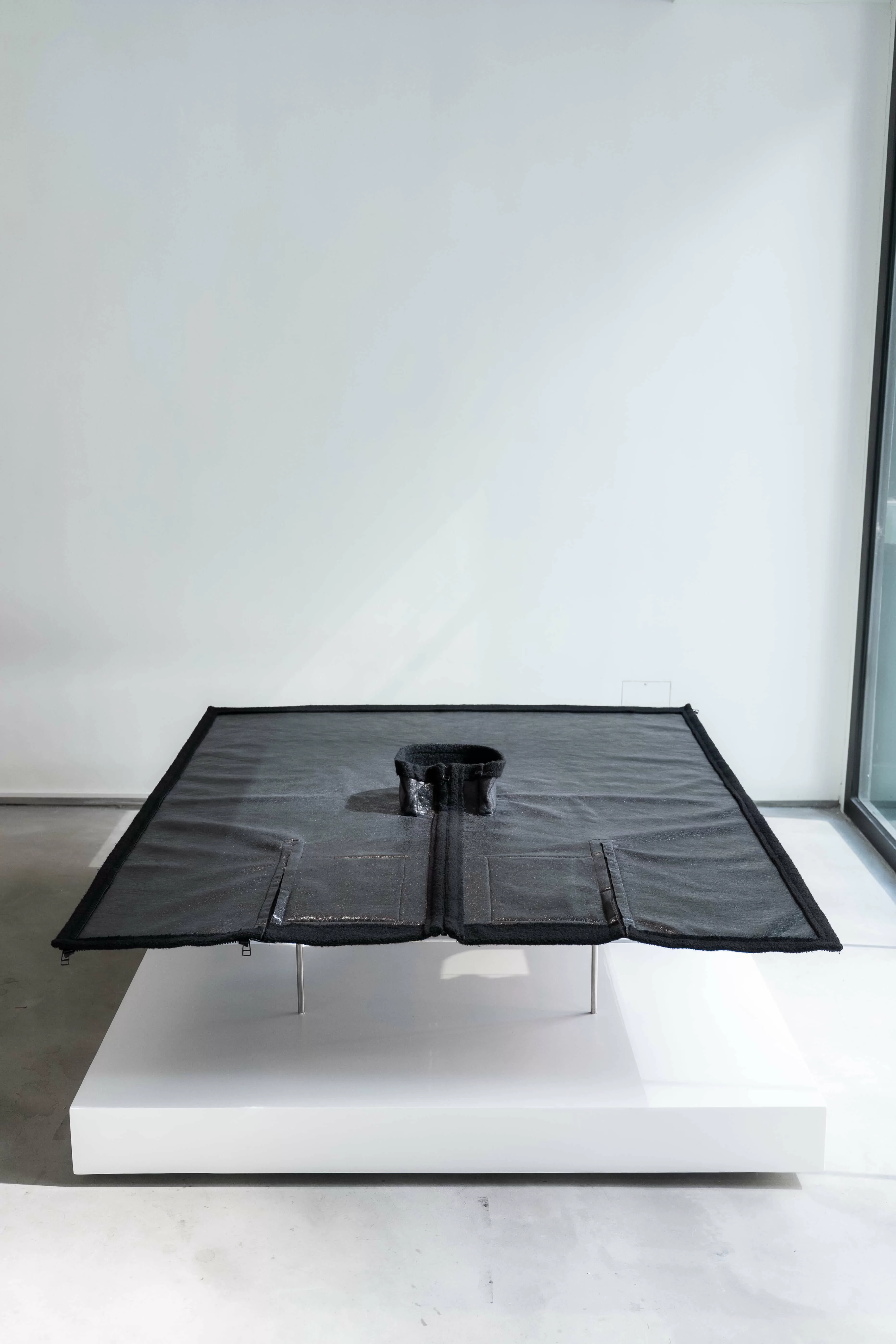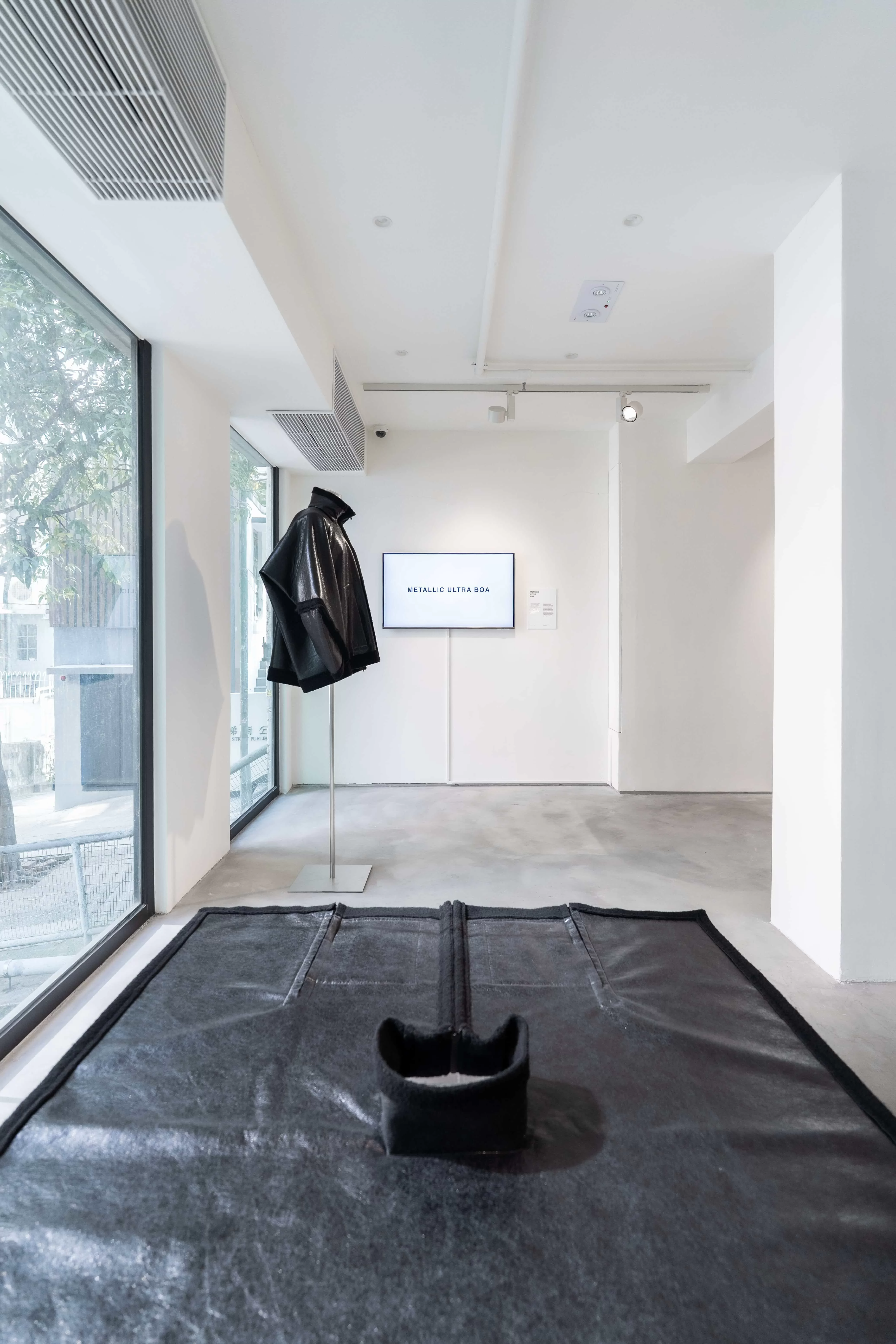 本系列採用品牌與東麗株式會社共同開發的人造羊羔毛面料,該面料結合了東麗的人工麂皮與合成纖維與回收羊毛混紡的絨毛層。該面料經過箔印處理,呈現大膽的金屬質感效果。服裝正面有兩個開口,垂直於下擺,內裡配有兩條拉鍊,沿著腋下接縫從下擺延伸至袖口。透過輕微扭轉式地拉合拉鍊,完成服裝結構,於肘部呈現出大膽且具有幾何感的輪廓造型。
