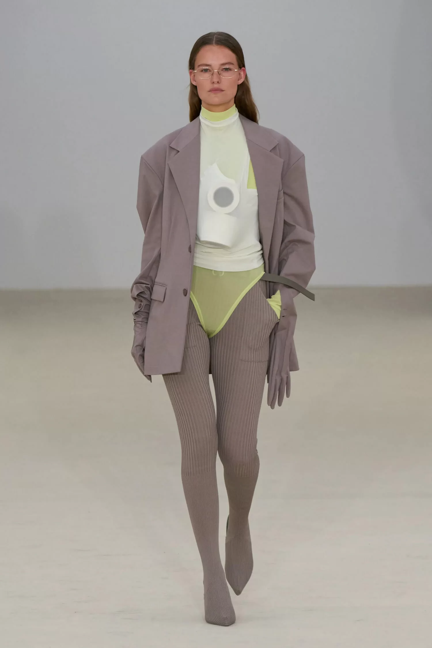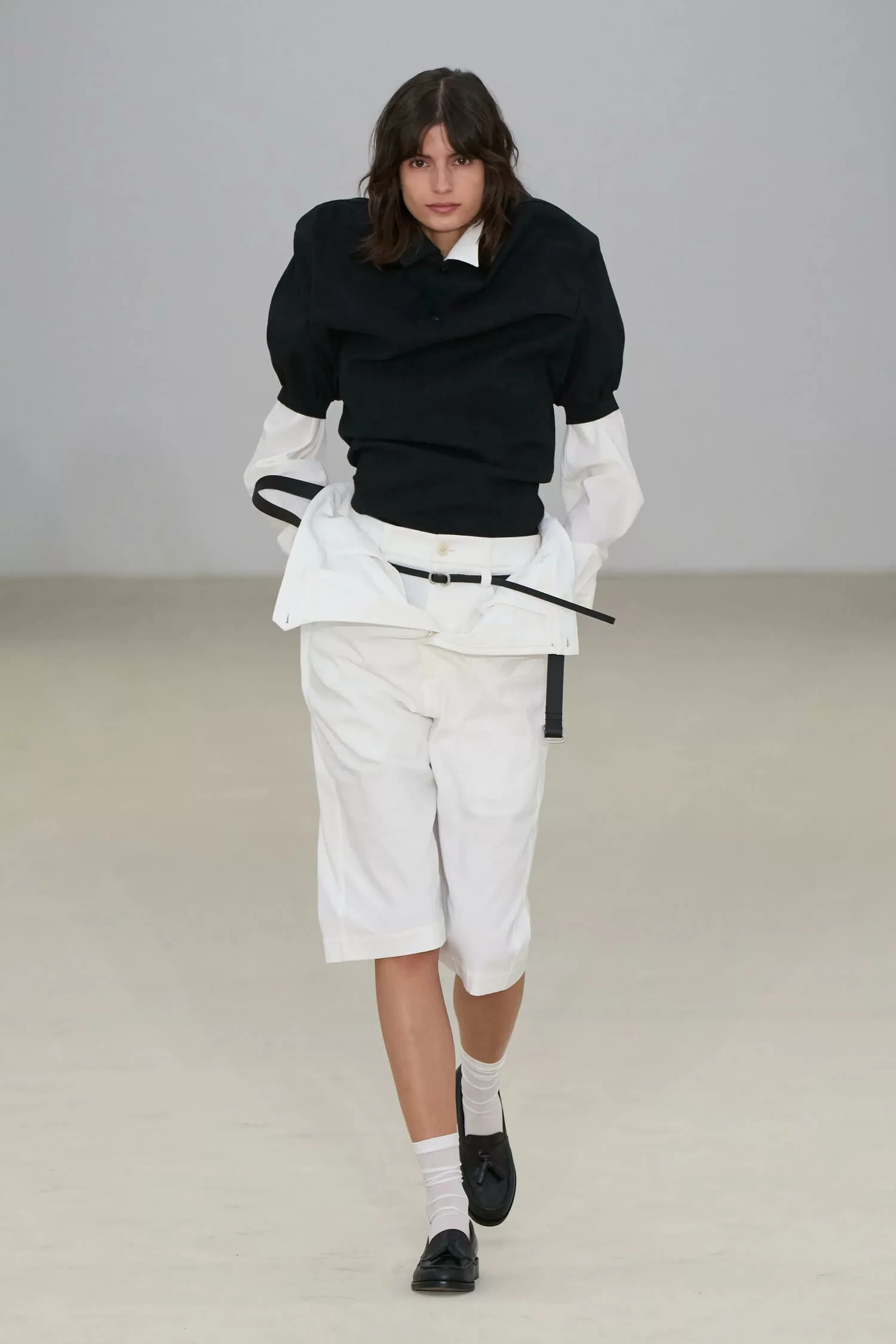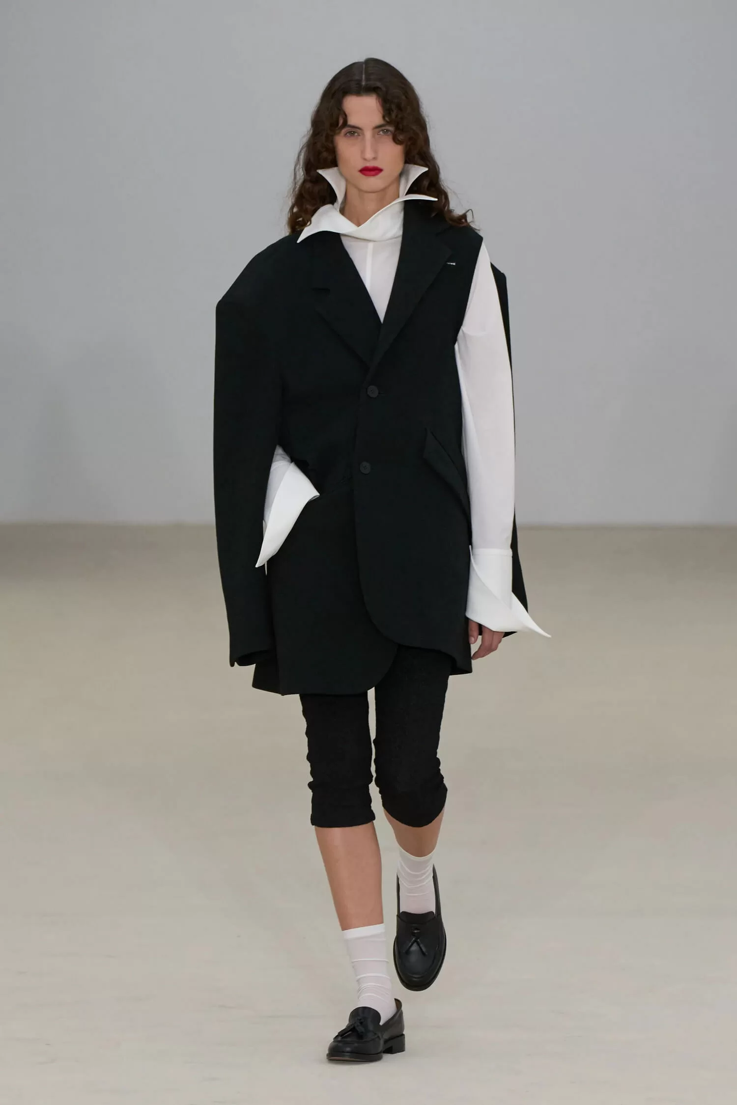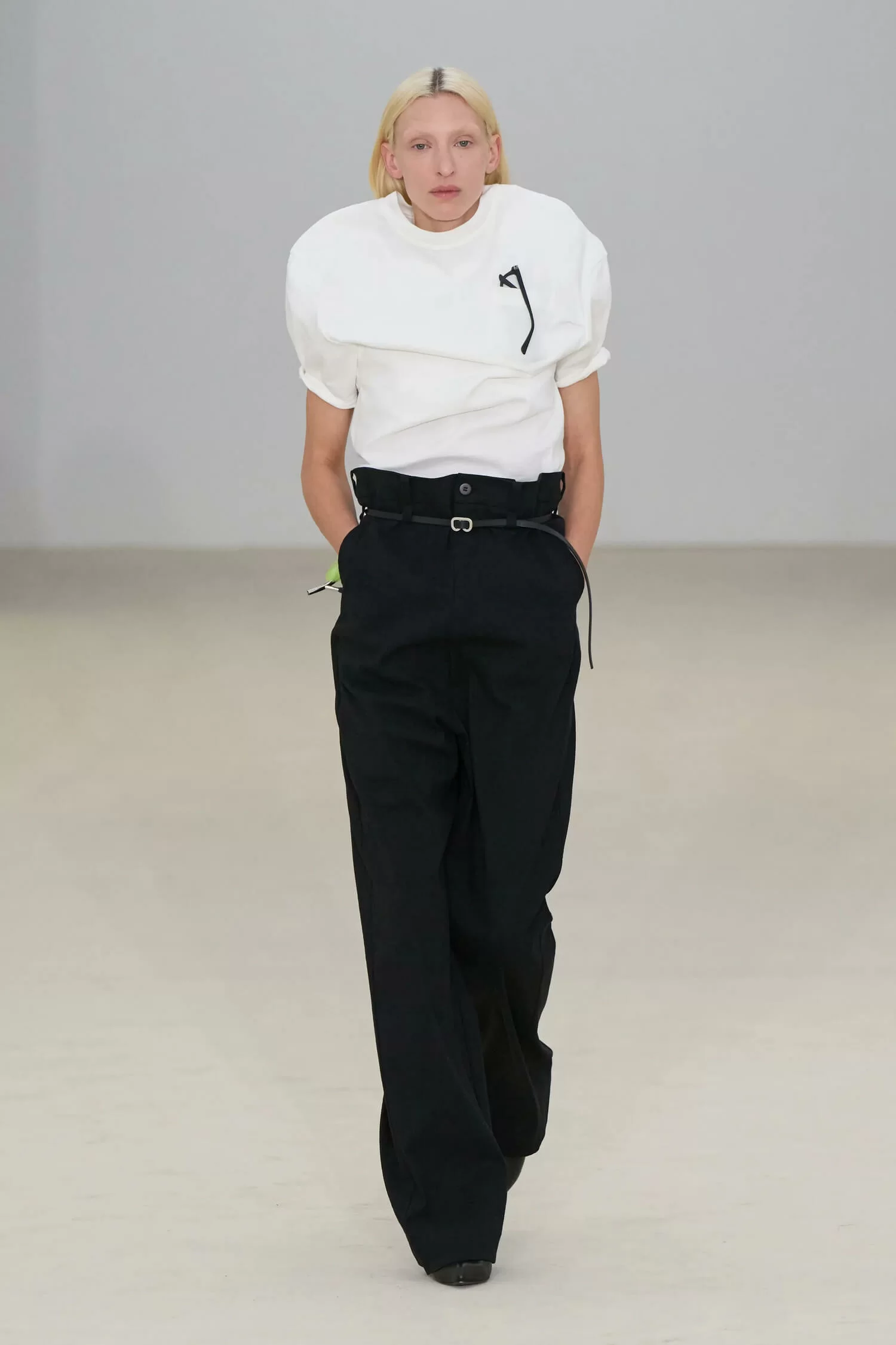 當服裝擁有自我意識後,穿著者的身體或許會轉變為服裝展示個性的媒介。系列的開場是一組看似「正常」的服裝,但它們似乎不願安分地待在穿著者身上,T-SHIRT、針織衫、POLO 衫和連帽衫的肩部被加固和放大,隨著系列設計越發激進,這些設計似乎在暗示服裝正在進化出新的形態,不再滿足於傳統的穿著方式,而是持續變化,展現出不斷演變的可能性。