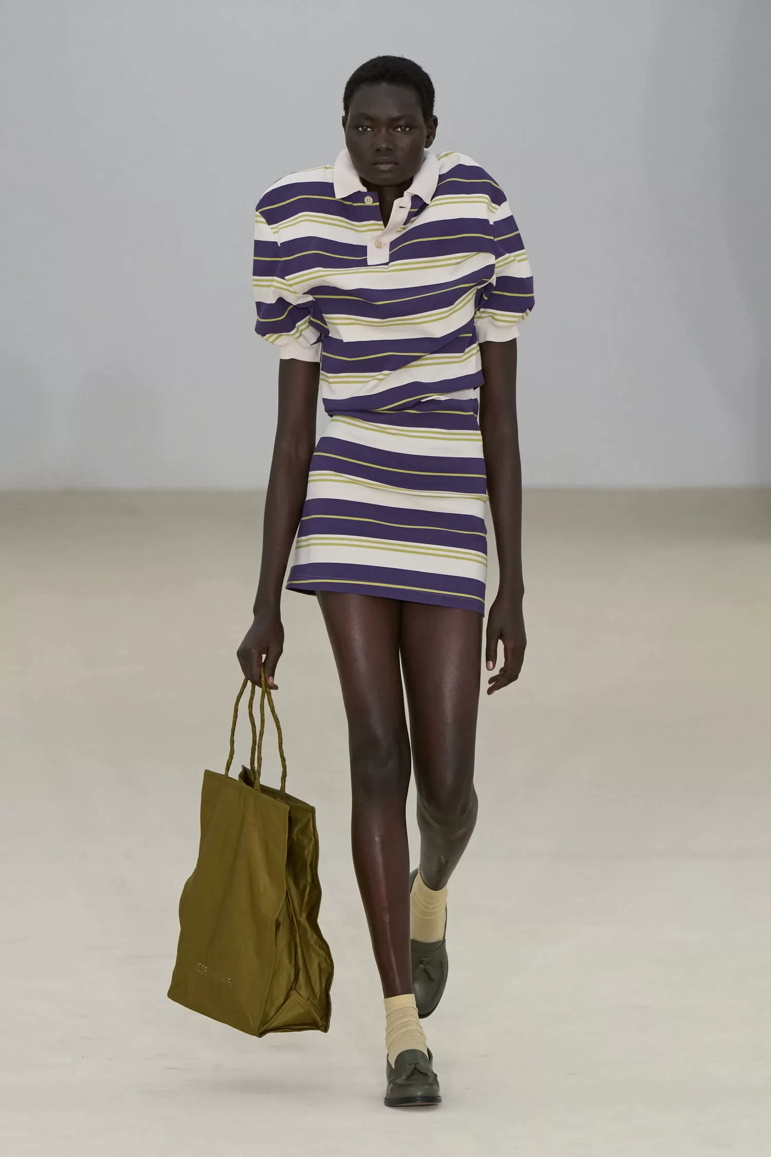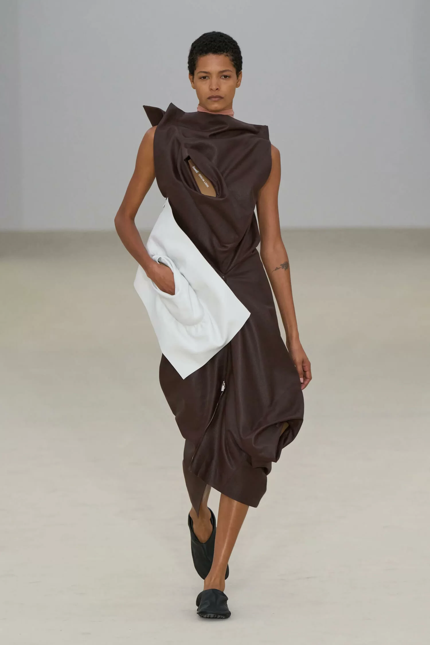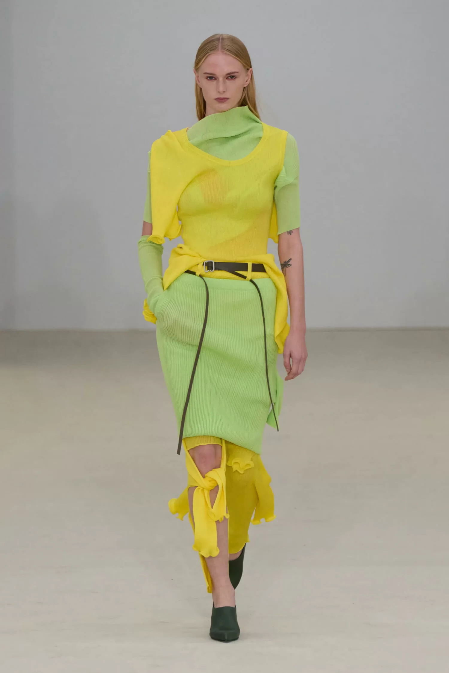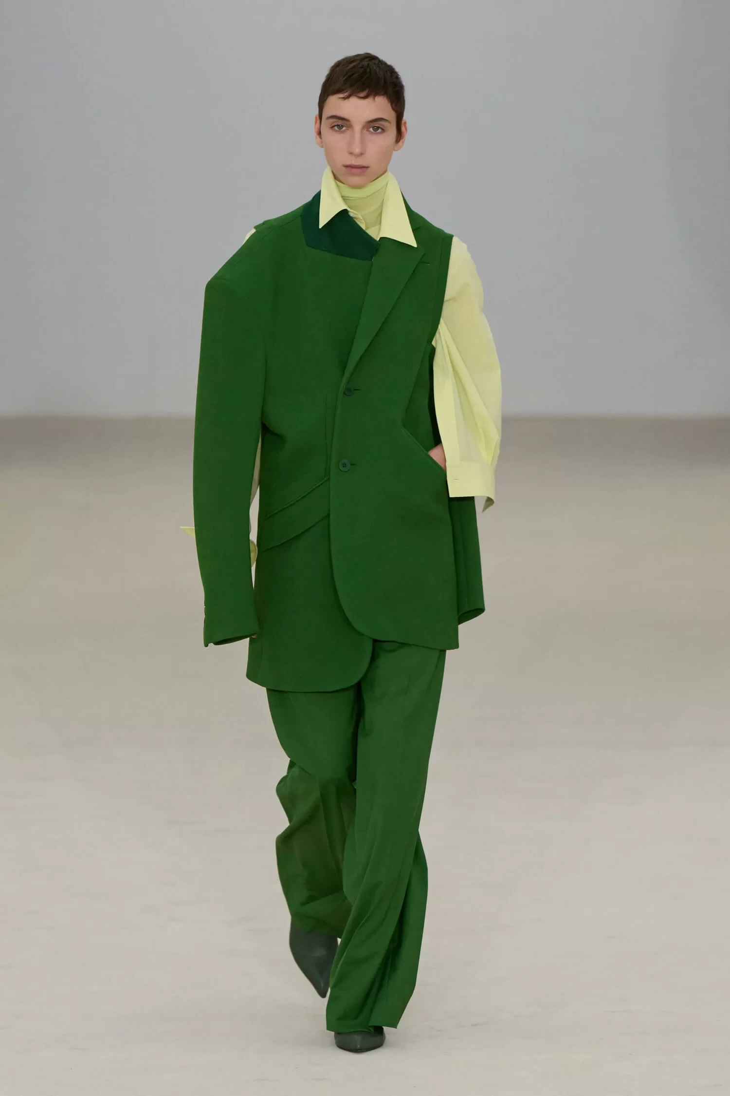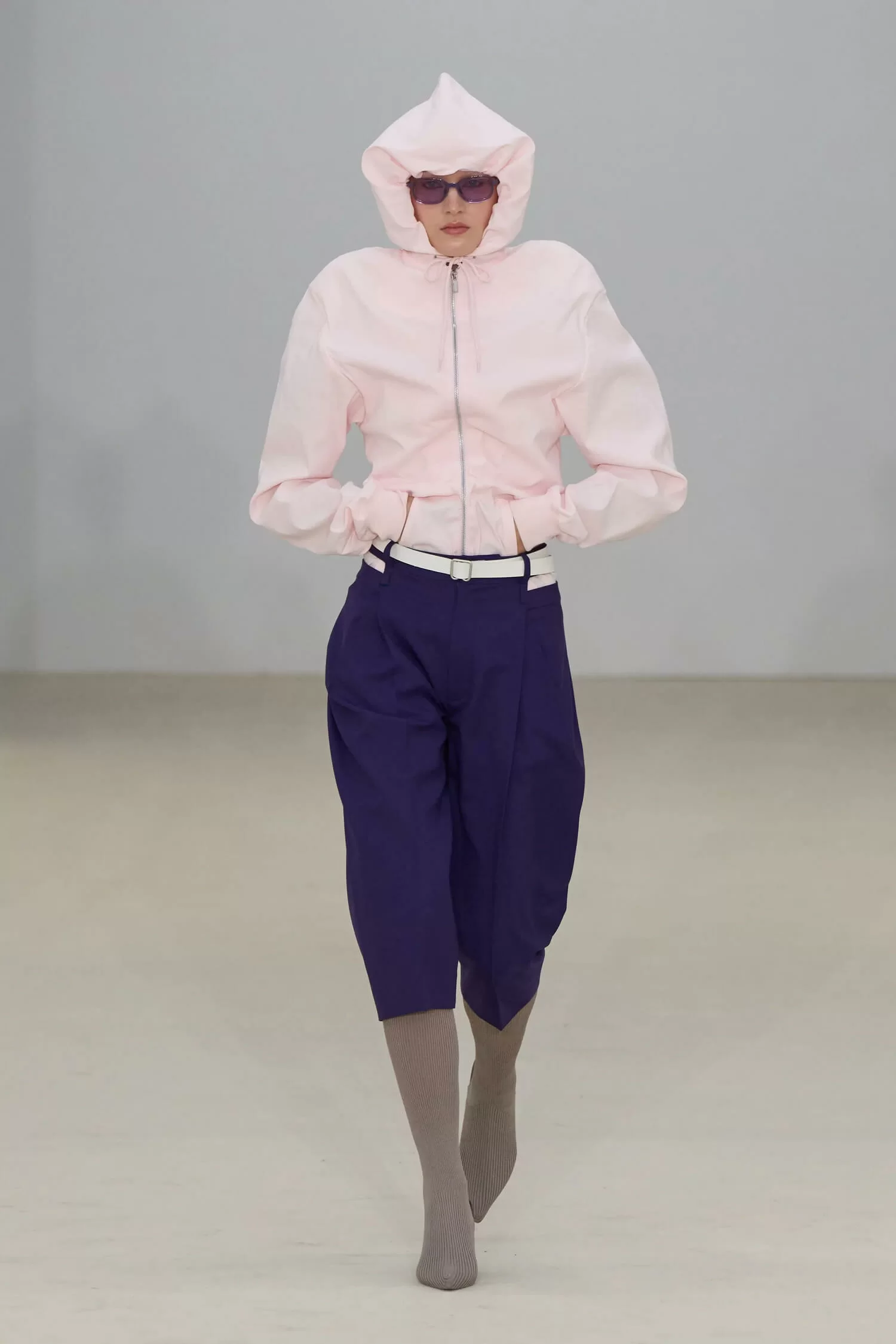 當服裝擁有自我意識後,穿著者的身體或許會轉變為服裝展示個性的媒介。系列的開場是一組看似「正常」的服裝,但它們似乎不願安分地待在穿著者身上,T-SHIRT、針織衫、POLO 衫和連帽衫的肩部被加固和放大,隨著系列設計越發激進,這些設計似乎在暗示服裝正在進化出新的形態,不再滿足於傳統的穿著方式,而是持續變化,展現出不斷演變的可能性。