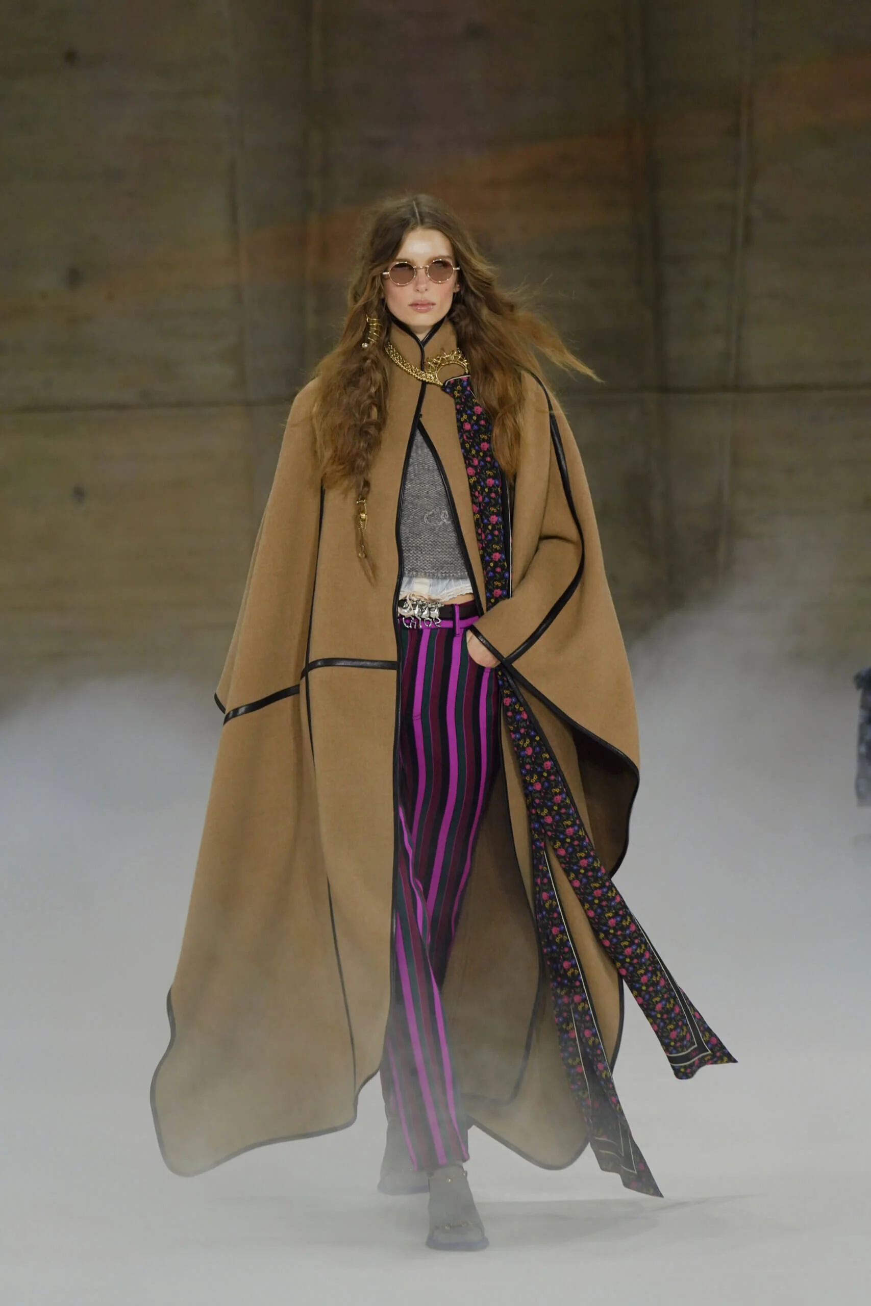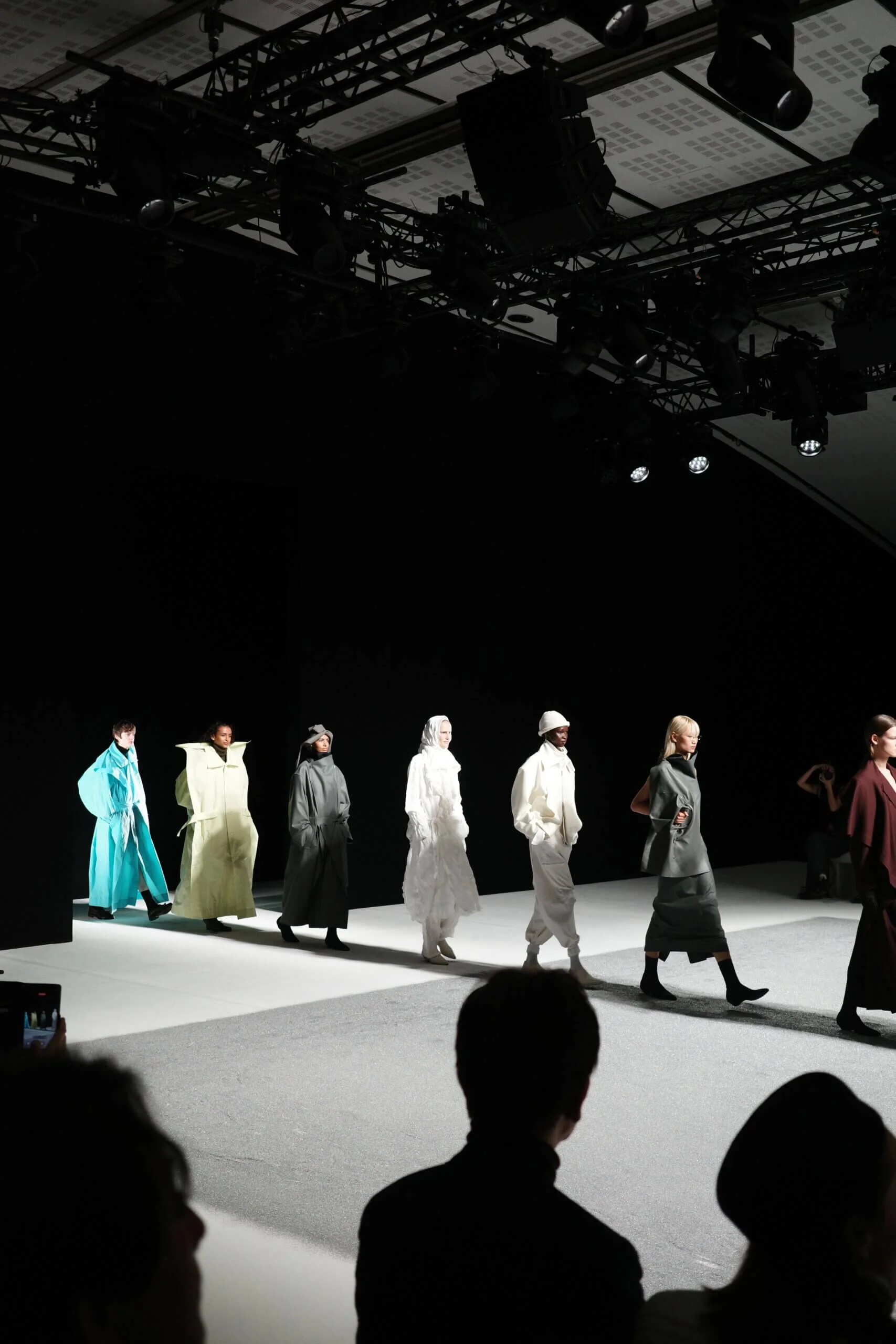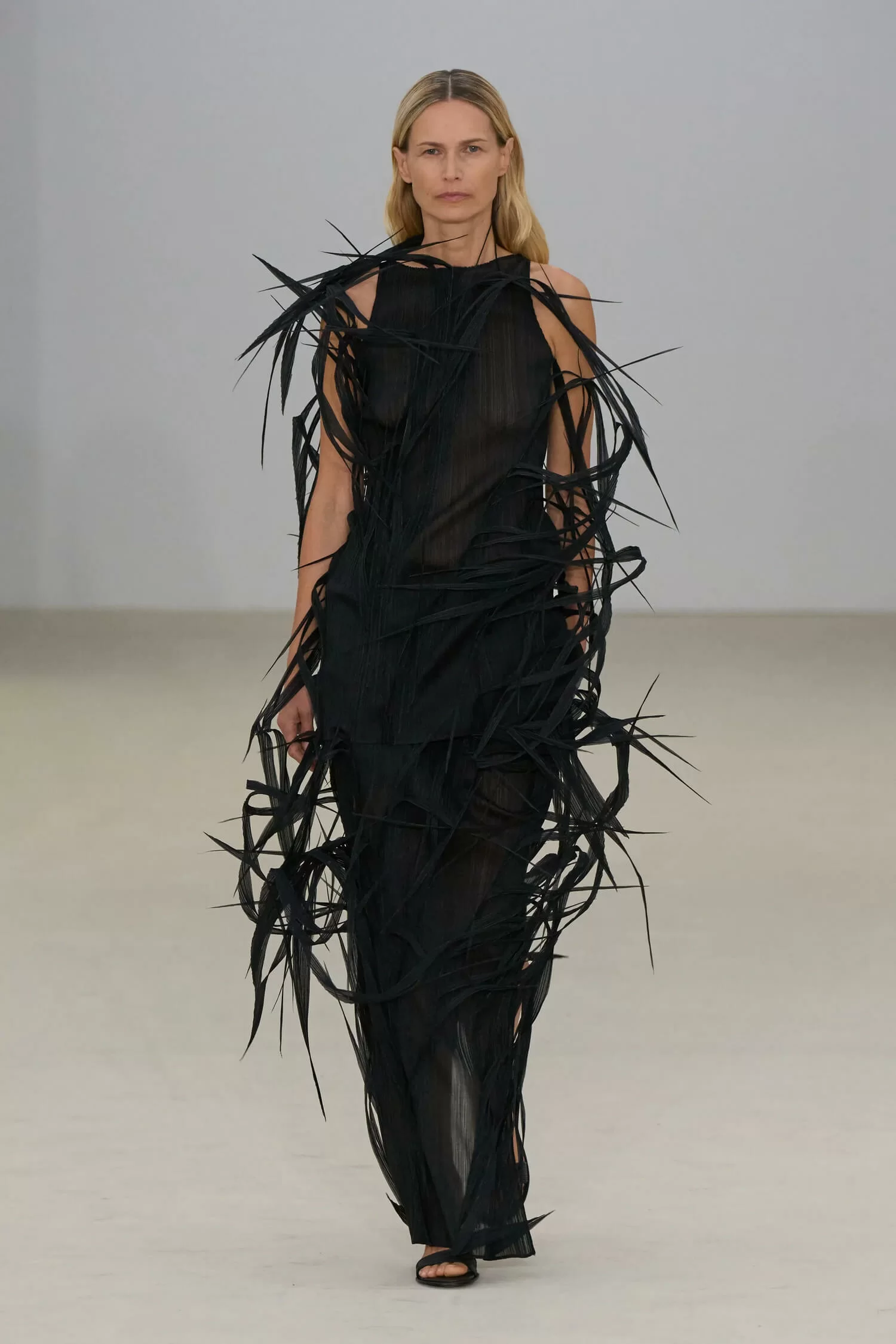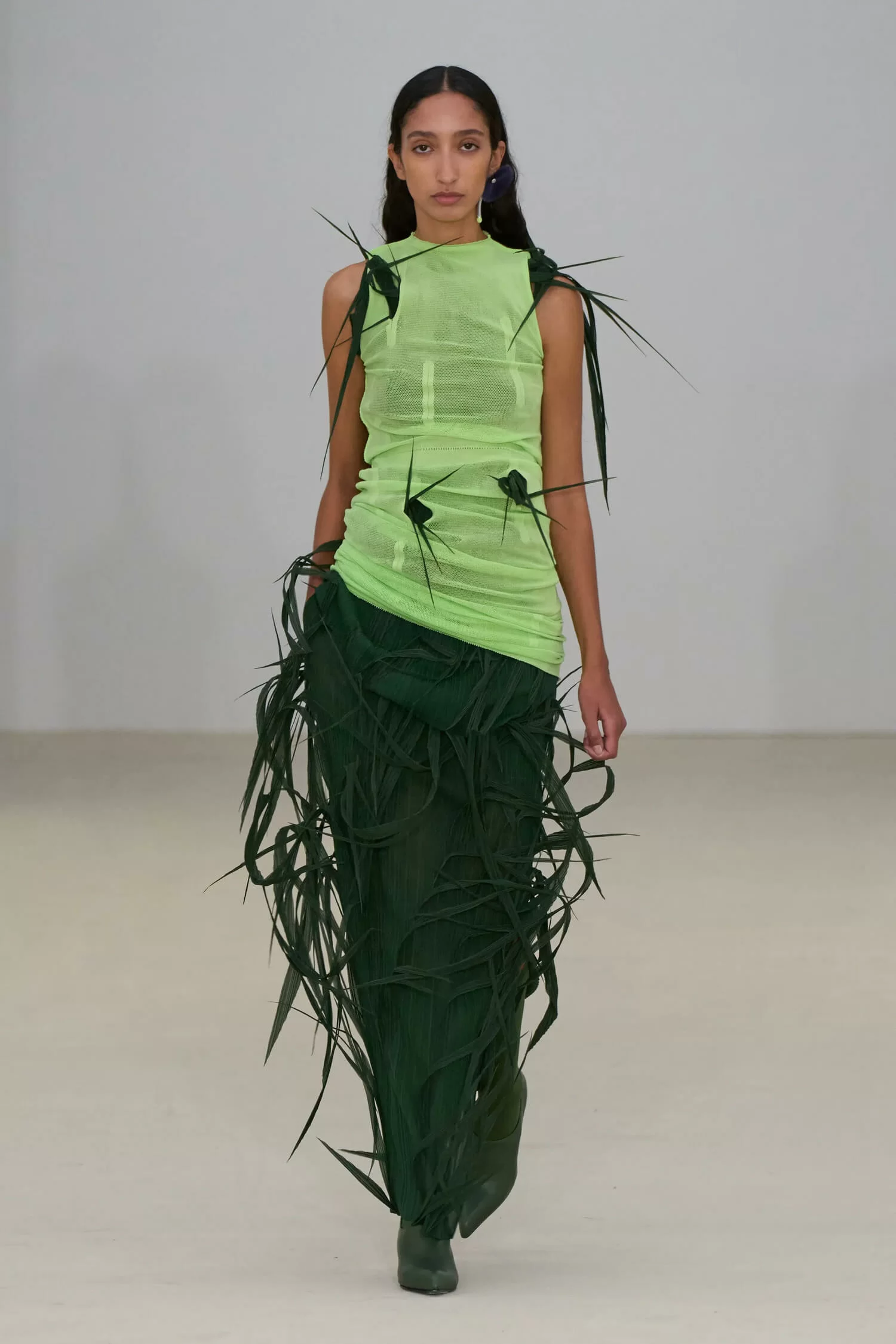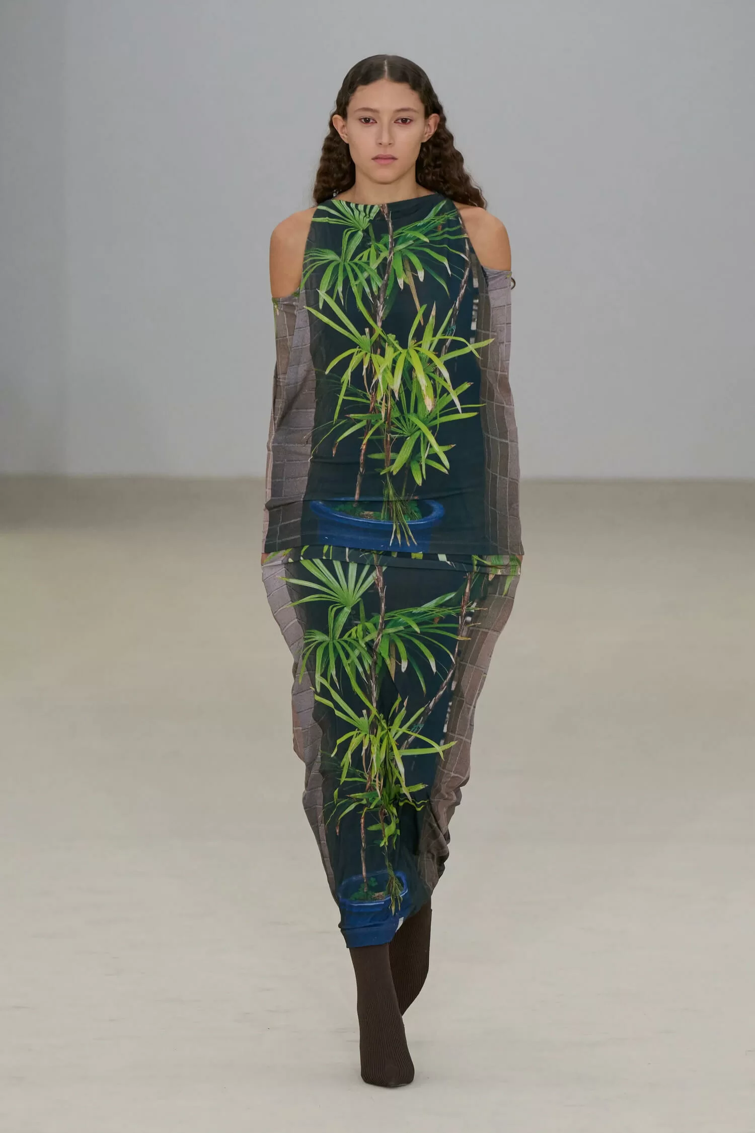 在經歷了激烈的「自主性」表達後,系列末段呈現了幾件代表絕處逢生、與自然有關的服飾的服裝——蓬鬆的風衣、內外翻轉的剪裁服裝,以及有機色彩系列的上衣和褲子,這些設計展現了服裝與身體之間的和諧共生關係——不再是抗爭與對立,而是平靜的共生共處。