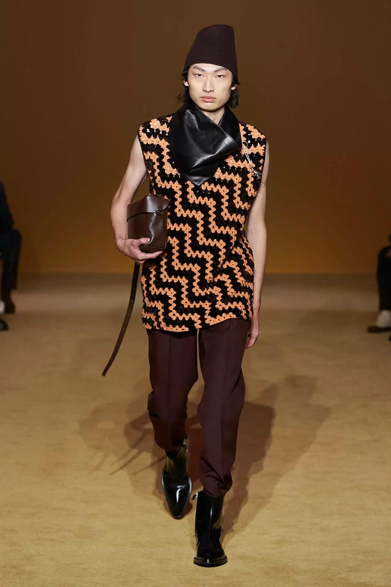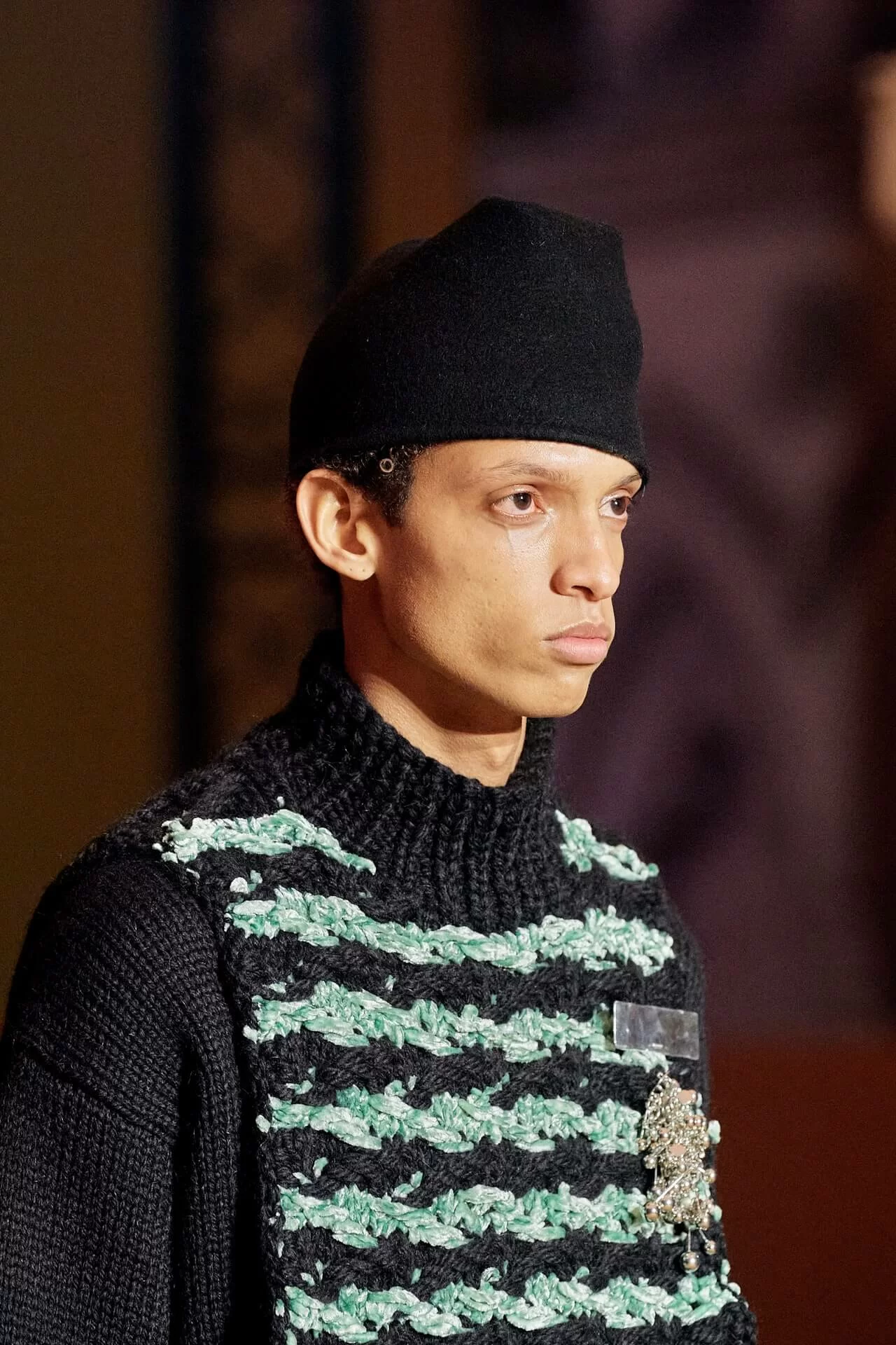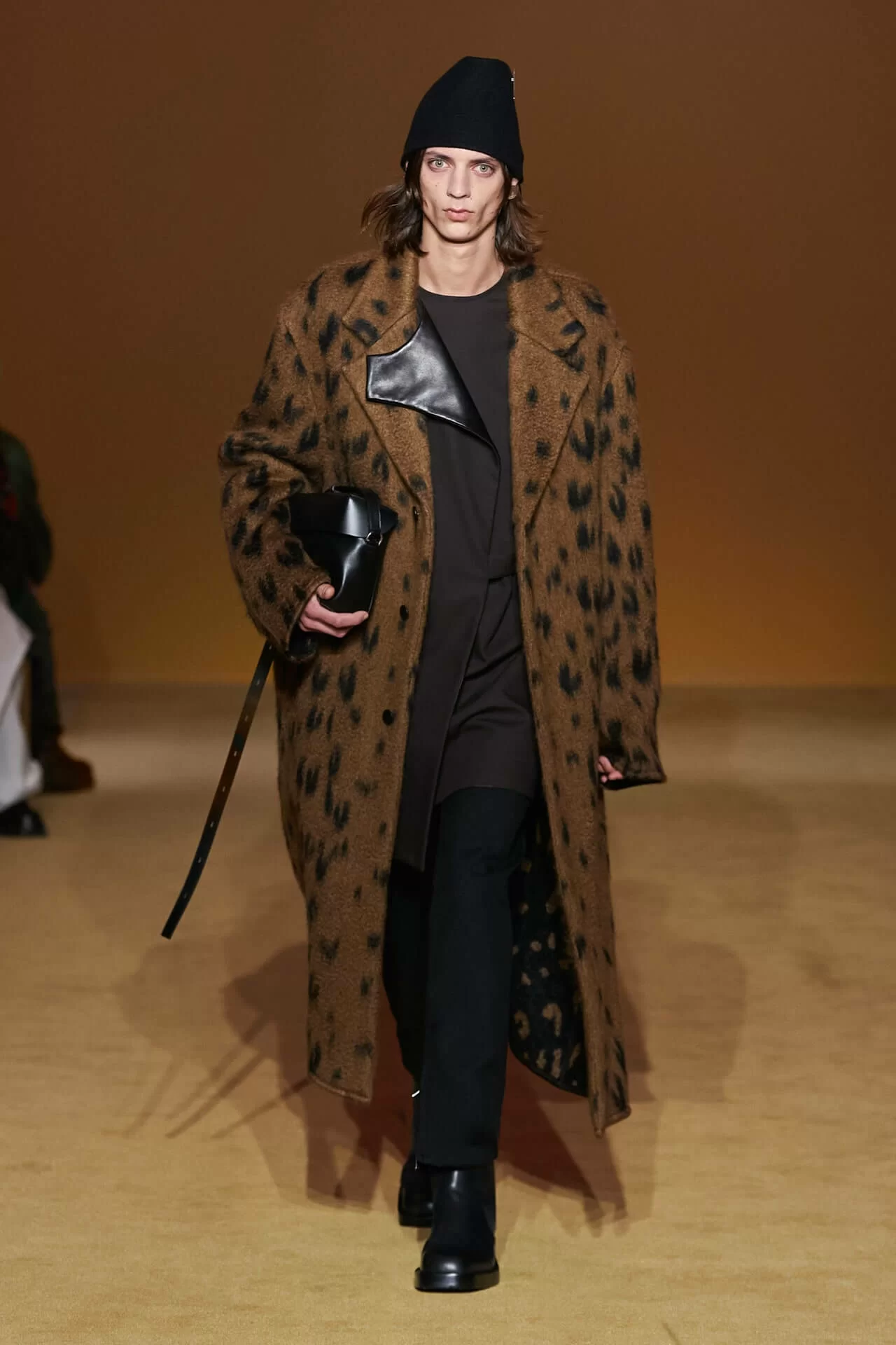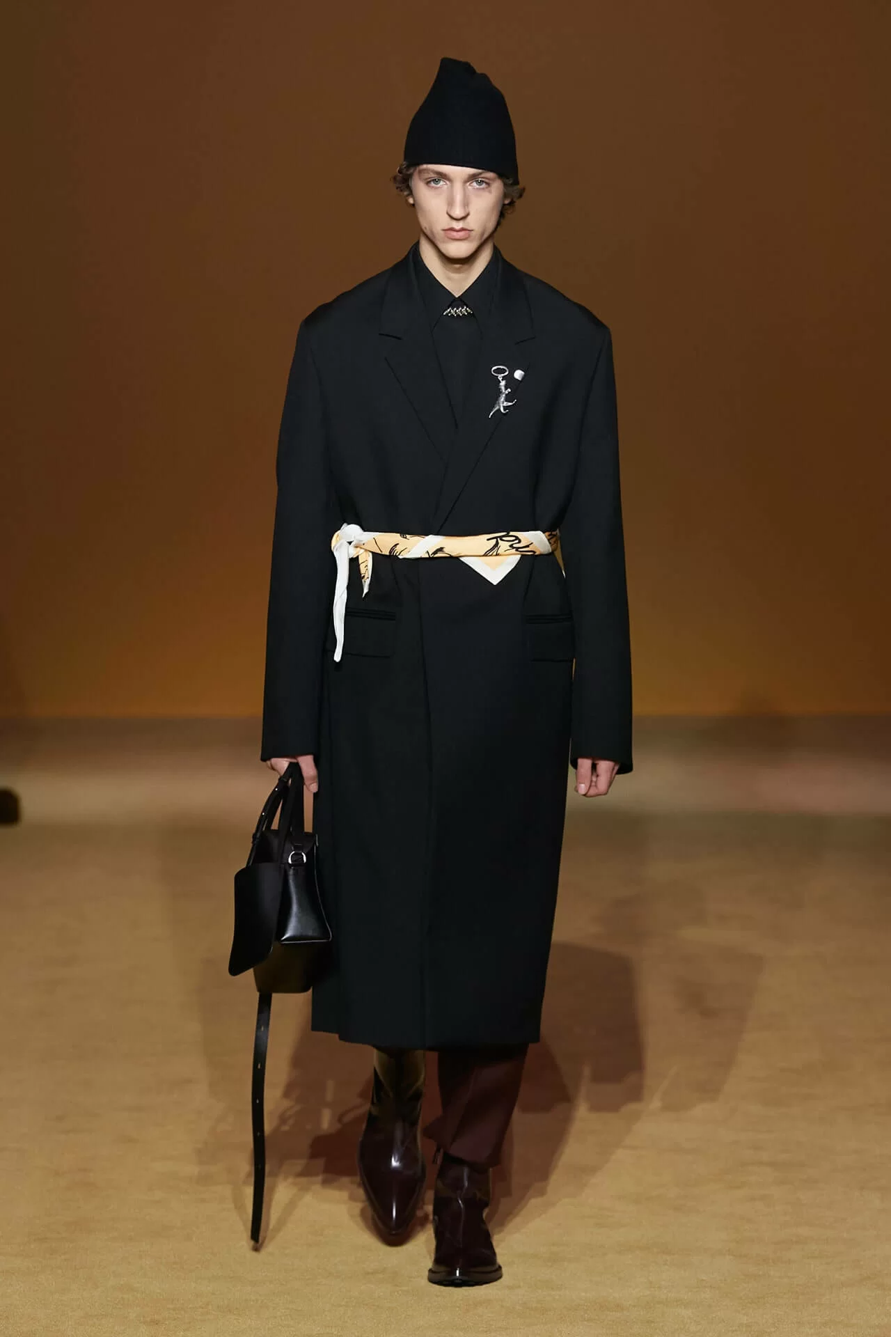 除了皮革拼西裝料的大衣是經典之外,值得一提的是當中的毛衣也加入不少占星術、動物等的印花元素,加上修腳的尖頭靴、高身的毛冷帽,整體帶有嬉皮士的氣氛,亦是將街頭風格和正裝相融一體的另類手法。