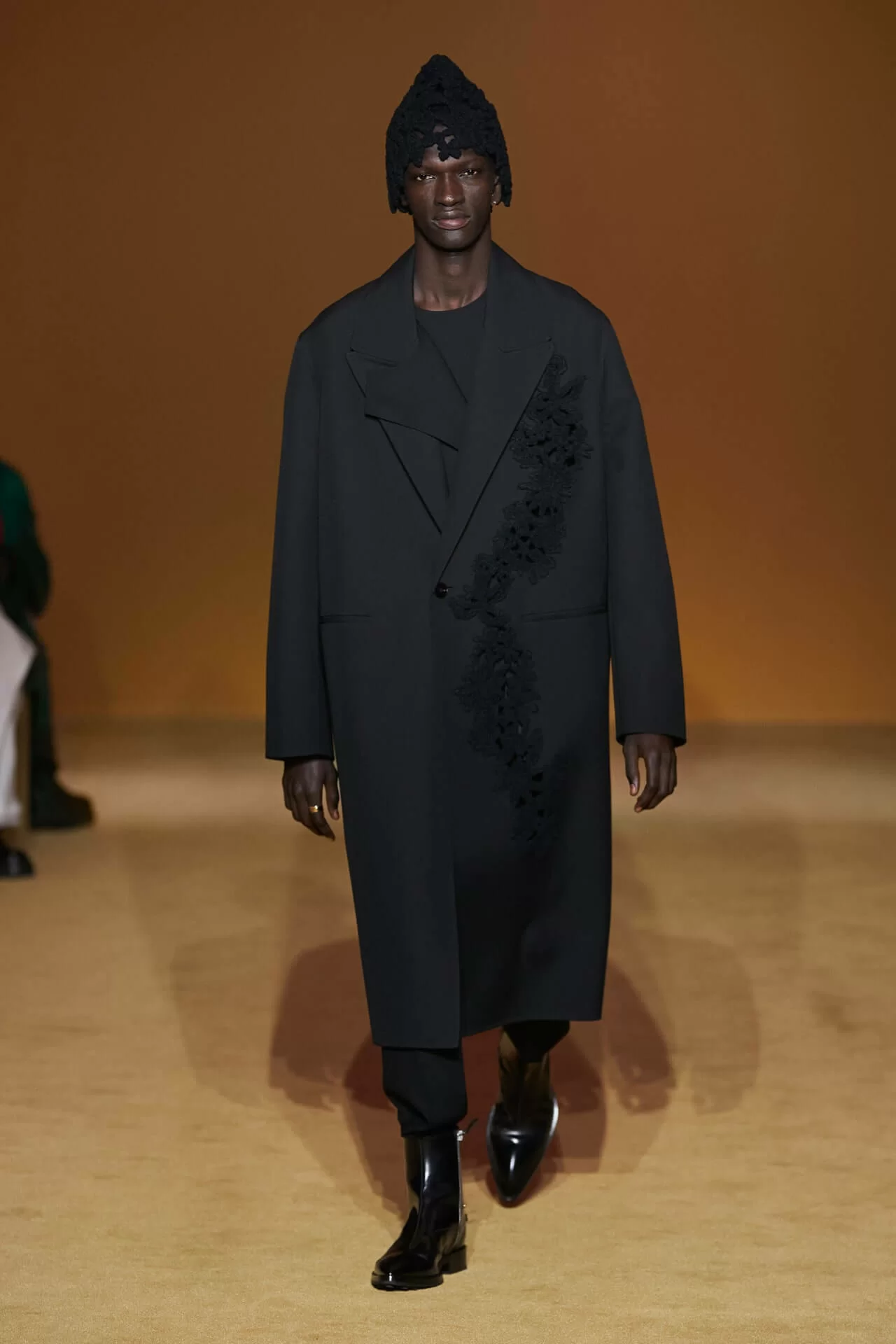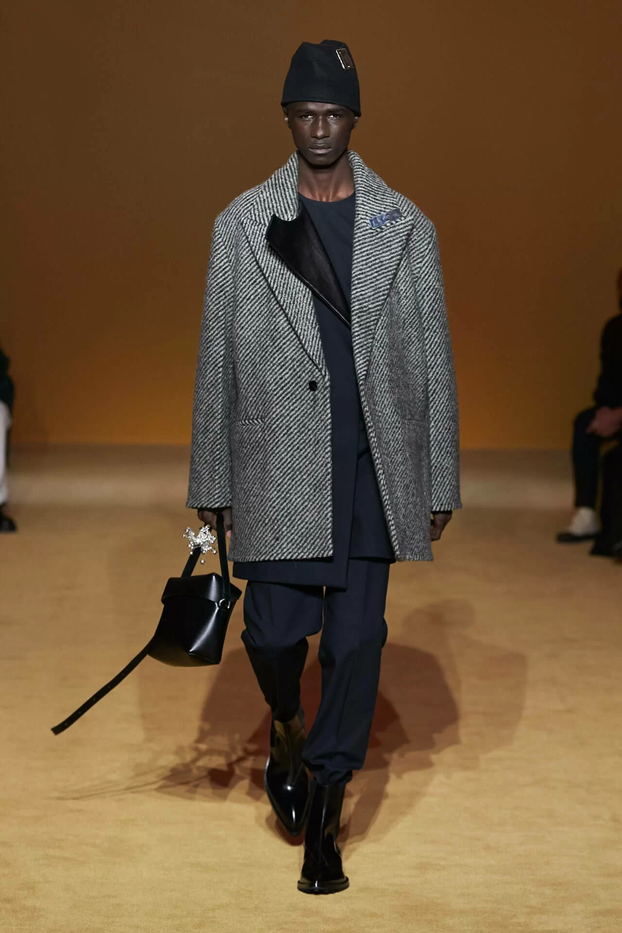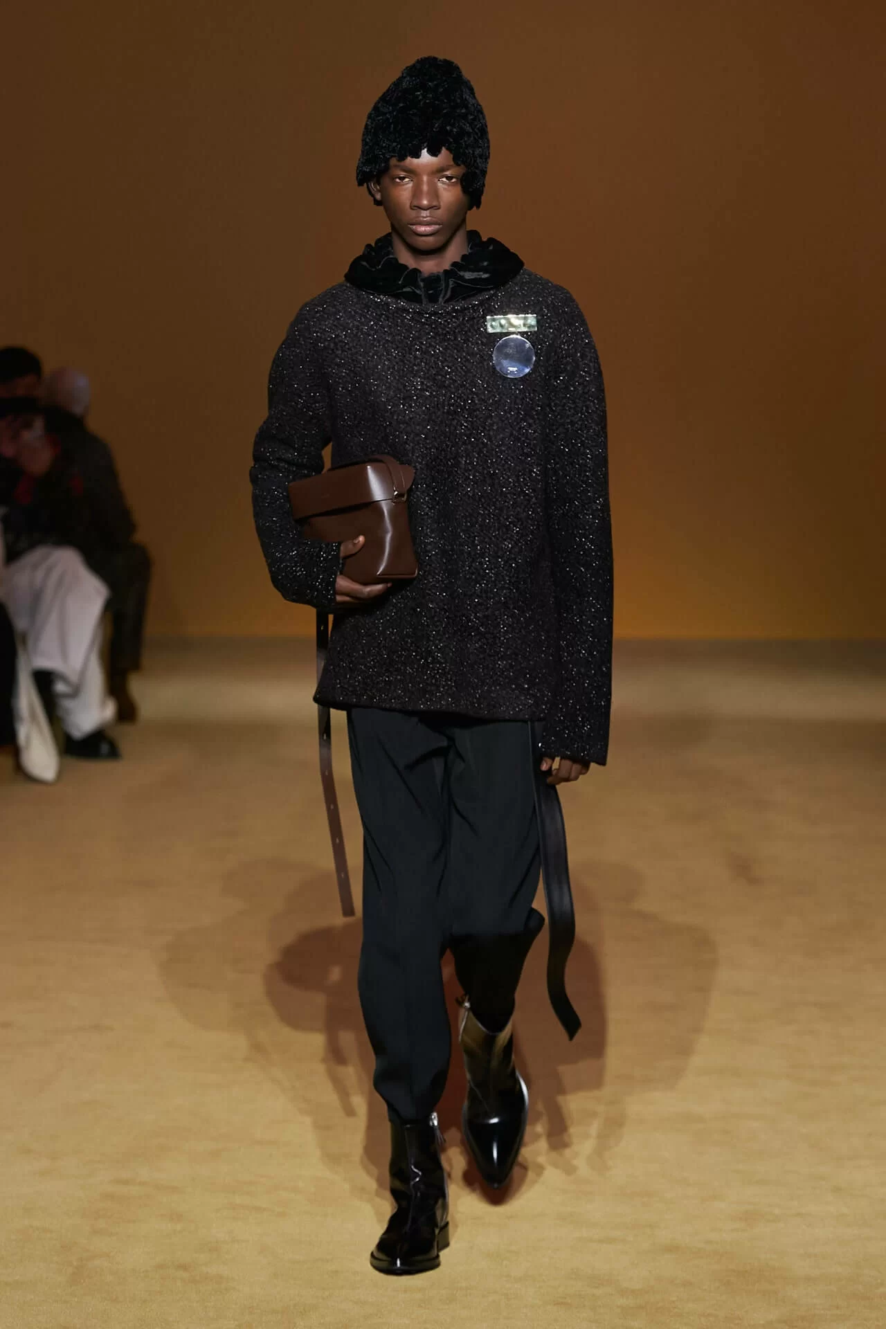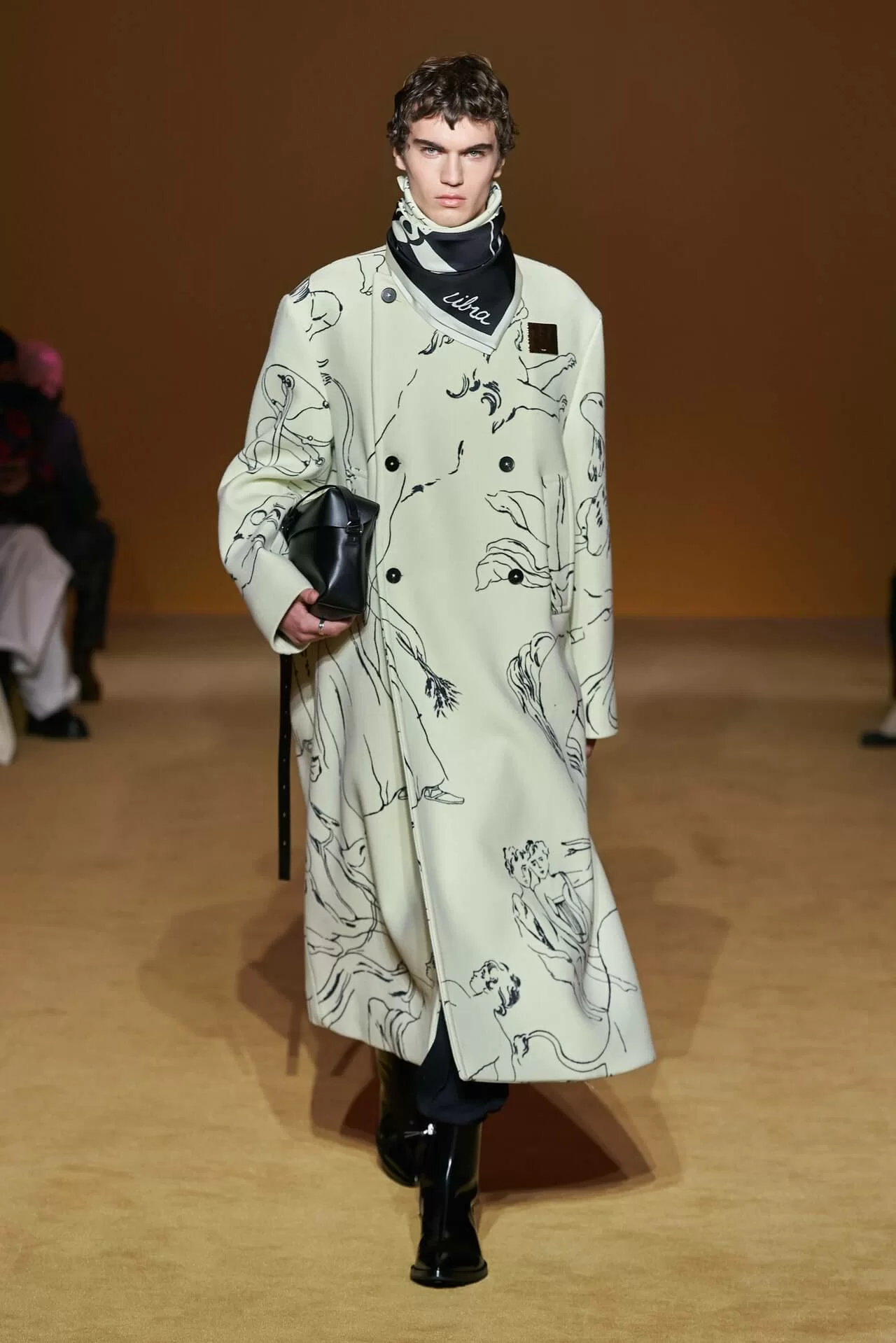 除了皮革拼西裝料的大衣是經典之外,值得一提的是當中的毛衣也加入不少占星術、動物等的印花元素,加上修腳的尖頭靴、高身的毛冷帽,整體帶有嬉皮士的氣氛,亦是將街頭風格和正裝相融一體的另類手法。