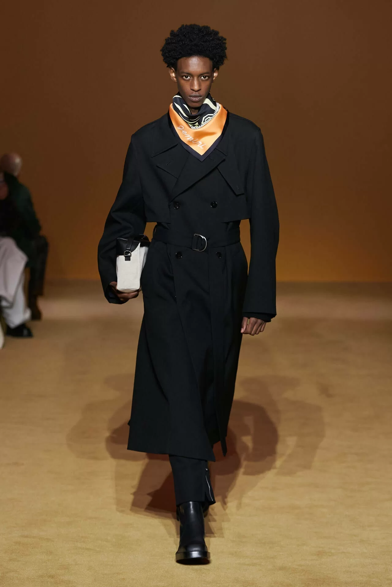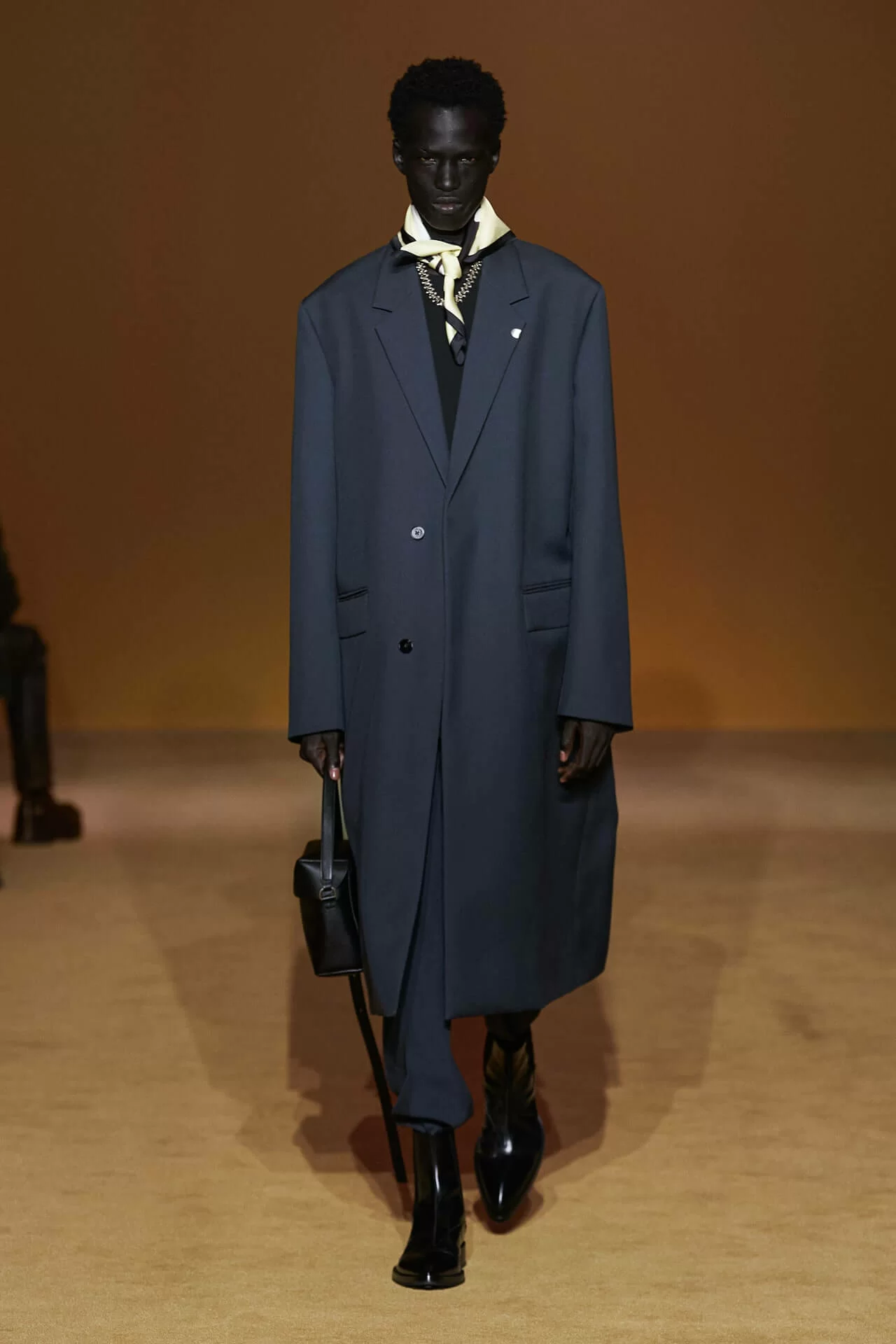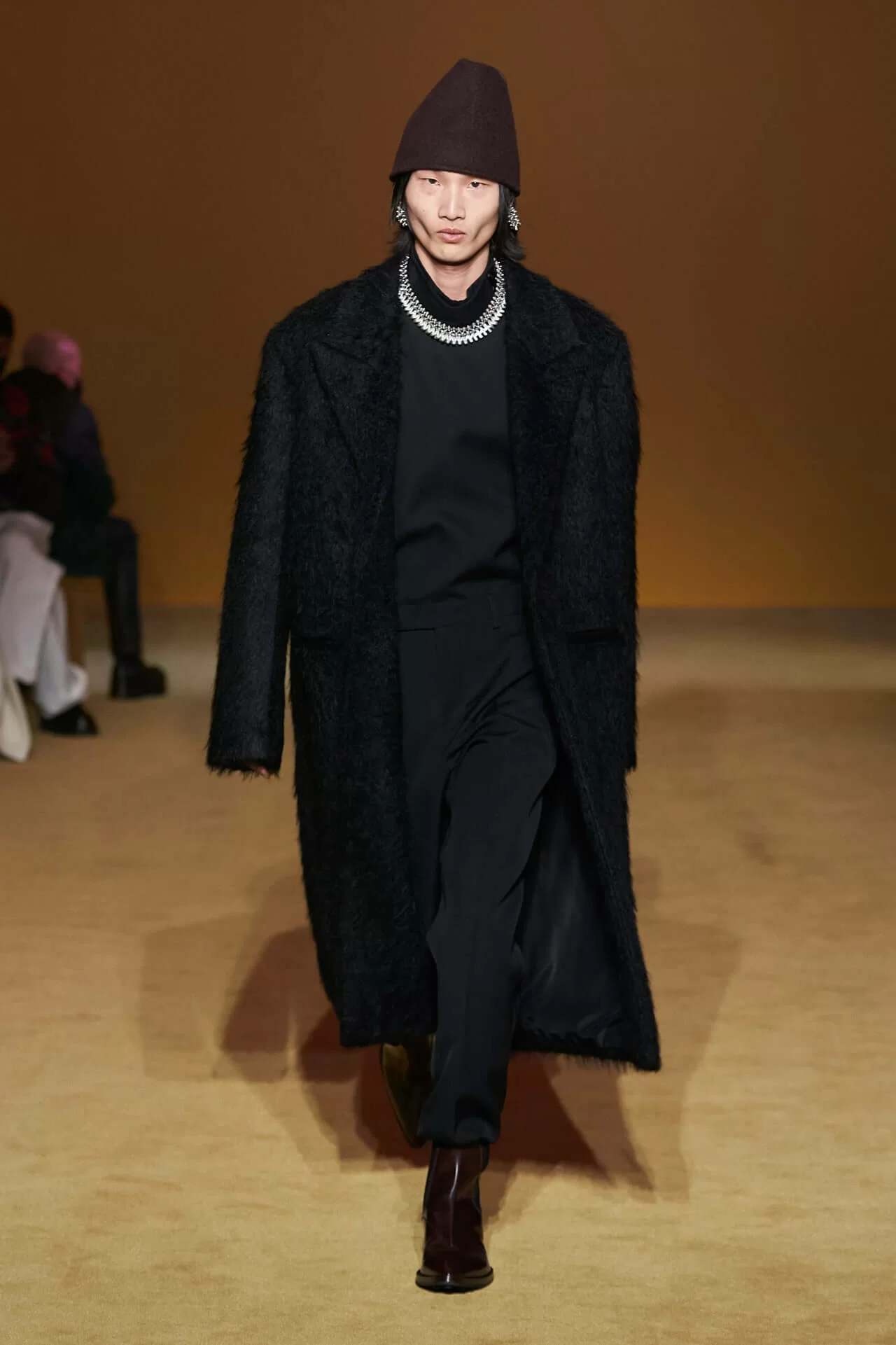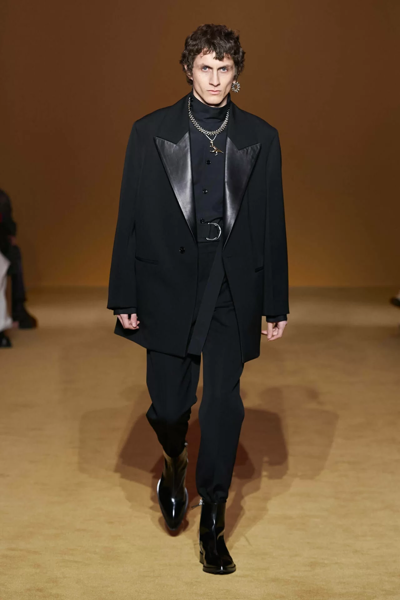 除了皮革拼西裝料的大衣是經典之外,值得一提的是當中的毛衣也加入不少占星術、動物等的印花元素,加上修腳的尖頭靴、高身的毛冷帽,整體帶有嬉皮士的氣氛,亦是將街頭風格和正裝相融一體的另類手法。
